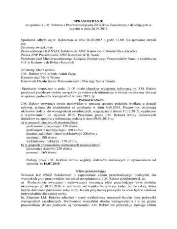SPRAWOZDANIE ze spotkania J.M. Rektora z Przewodniczącymi Związków Zawodowych działających w uczelni w dniu 26.06.2015 Spotkanie odbyło się w Rektoracie w dniu 26.06.2015 o godz. 11.00. Na spotkanie stawili się: Ze strony związkowej Przewodnicząca KZ NSZZ Solidarność AWF Katowice dr Dorota Olex-Zarychta Prezes ZNP Pracowników AWF Katowice dr B. Szade Przedstawiciel Międzyuczelnianego Związku Zawodowego Pracowników Nauki z siedzibą na U E w Krakowie dr Robert Roczniok Ze strony władz uczelni J.M.. Rektor prof. dr hab. Adam Zając Kwestor mgr Maria Wrona Kierownik Działu Spraw Pracowniczych i Płac mgr Sonia Trenda Spotkanie rozpoczęte o godz. 11.00 miało charakter wyłącznie informacyjny. J.M. Rektor przekazał przedstawicielom związków zawodowych informacje o swojej ostatecznej decyzji w sprawie podwyżek wynagrodzeń w roku 2015, tj: Podział środków J.M. Rektor utrzymuje swoje stanowisko w sprawie sposobu podziału środków z dotacji celowej, podane do wiadomości na spotkaniu w dniu 9.06.2015. Pracownicy otrzymają okresowe dodatki do wynagrodzeń zasadniczych, wygasające z dniem 31.12.2015, wypłacone z wyrównaniem od stycznia 2015. Przyznane przez J.M. Rektora kwoty okresowych dodatków to, zgodnie z informacją podaną w dniu 09.06.2015 to: a) w grupach nauczycieli akademickich profesorowie zwyczajni: 350 zł/m-c profesorowie nadzwyczajni: 300 zł/m-c docenci, adiunkci i starsi wykładowcy: 200zł/m-c asystenci: 180 zł/m-c wykładowcy i lektorzy : 170 zł/m-c b) w grupach pracowników niebędących nauczycielami kierownicy działów: 250 zł/m-c personel : 160 zł/m-c Podany przez J.M. Rektora termin wypłaty dodatków okresowych z wyrównaniem od stycznia to 10.07.2015 Efekt przechodzący Wniosek KZ NSZZ Solidarność o zapewnienie efektu przechodzącego podwyżek dla wszystkich grup pracowników nie został uwzględniony. J.M. Rektor poinformował, że: a) Profesorowie zwyczajni i nadzwyczajni otrzymają efekt przechodzący kwot dodatku okresowego od 01.01.2016 w zależności od wyniku weryfikacji kadry profesorskiej, która będzie dokonana pod koniec roku 2015. Kwota przyznanej podwyżki na stałe będzie ustalana indywidualnie dla każdej osoby. b). Zdaniem J.M. Rektora adiunkci i starsi wykładowcy otrzymali bardzo duże podwyżki wynagrodzeń zasadniczych. Wyrównano wszystkim stawkę wynagrodzenia i w tej grupie pracowników dalsze podwyżki są bezzasadne. J.M. Rektor nie przewiduje żadnego efektu przechodzącego podwyżki z 2015 roku dla tych grup pracowników. J.M. Rektor oświadczył, że będzie rozpatrywał indywidualne wnioski pracowników o podwyżkę wynagrodzenia w przypadku podwyższenia przez nich kwalifikacji zawodowych i /lub wykazania osiągnięć naukowych. c). Asystenci i wykładowcy zostali przez J.M. Rektora określeni mianem „ taniej siły roboczej uczelni”. J.M. Rektor uważa, że są to pracownicy o najniższych kwalifikacjach, wobec powyższego windowanie w górę ich wynagrodzeń nie jest zasadne. Zaznaczył, że tym grupom pracowników podniesiono minimalne wynagrodzenia, więc podwyżkę z efektem przechodzącym już otrzymali. d) Pracownicy niebędący nauczycielami otrzymają efekt przechodzący od 01.01.2016 w kwocie stanowiącej 80 % dodatku okresowego. J.M. Rektor obiecał dalsze podwyżki dla pracowników administracji w roku 2016 (do 100% efektu przechodzącego kwoty z 2015), w przypadku dobrego stanu finansów uczelni. Przewodnicząca KZ NSZZ Solidarność po wysłuchaniu informacji oświadczyła, że Związek nie wyraża zgody na dyskryminowanie niektórych grup pracowników uczelni przy podziale środków na podwyżki a wykluczenie pracowników naukowo-dydaktycznych i dydaktycznych niższego szczebla z efektu przechodzącego podwyżek w roku 2015 jest niewłaściwe i niezgodne z wytycznymi Ministerstwa Nauki i Szkolnictwa Wyższego w kwestii poprawy wynagrodzeń pracowników uczelni publicznych. Zdaniem Związku wszystkie grupy pracowników powinny otrzymać podwyżki wynagrodzeń na stałe. Rektor potwierdził, że na dzień 1 lipca planuje spotkanie z pracownikami uczelni w celu przekazania im osobiście informacji o sposobie podziału środków na podwyżki. Sprawozdanie sporządziła: Dorota Olex-Zarychta
