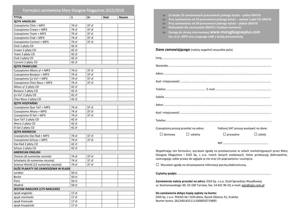 Formularz zamówienia Mary Glasgow Magazines 2015/2016 TYTUŁ 1 JĘZYK ANGIELSKI Czasopismo Click + MP3 74 zł Czasopismo Crown + MP3 74 zł Czasopismo Team + MP3 74 zł Czasopismo Club + MP3 74 zł Czasopismo Current + MP3 74 zł Click 2 płyty CD 42 zł Crown 2 płyty CD 42 zł Team 2 płyty CD 42 zł Club 2 płyty CD 42 zł Current 2 płyty CD 42 zł JĘZYK FRANCUSKI Czasopismo Allons-y! + MP3 74 zł Czasopismo Bonjour + MP3 74 zł Czasopismo Ça Va? + MP3 74 zł Czasopismo Chez Nous + MP3 74 zł Allons-y! 2 płyty CD 42 zł Bonjour 2 płyty CD 42 zł Ça Va? 2 płyty CD 42 zł Chez Nous 2 płyty CD 42 zł JĘZYK HISZPAŃSKI Czasopismo Que Tal? + MP3 74 zł Czasopismo Ahora + MP3 74 zł Czasopismo El Sol + MP3 74 zł Que Tal? 2 płyty CD 42 zł Ahora 2 płyty CD 42 zł El Sol 2 płyty CD 42 zł JĘZYK NIEMIECKI Czasopismo Das Rad + MP3 74 zł Czasopismo Schuss + MP3 74 zł Das Rad 2 płyty CD 42 zł Schuss 2 płyty CD 42 zł AMERICAN ENGLISH Choices (8 numerów rocznie) 74 zł Scholastic (6 numerów rocznie) 74 zł Science World (12 numerów rocznie) 74 zł DUŻE PLAKATY DO ZAWIESZENIA W KLASIE London 50 zł Berlin 50 zł Paris 50 zł Madrid 50 zł ZESTAW NAKLEJEK (175 NAKLEJEK) Język angielski 17 zł Język niemiecki 17 zł Język francuski 17 zł Język hiszpański 17 zł 2+ 37 zł 37 zł 37 zł 37 zł 37 zł Ilość Razem Za każde 10 zamówionych prenumerat jednego tytułu – jedna GRATIS Przy zamówieniu od 10 prenumerat jednego tytułu – zestaw 2 płyt CD GRATIS Przy zamówieniu od 20 prenumerat jednego tytułu – plakat GRATIS Wskazówki dla nauczyciela GRATIS z każdym numerem Dostęp do strony internetowej www.maryglasgowplus.com (tu: m.in. MP3 oraz Language LAB) z każdą prenumeratą. Dane zamawiającego (należy wypełnić wszystkie pola) Imię......................................................................................................................................... Nazwisko ............................................................................................................................... 37 zł 37 zł 37 zł 37 zł Adres ...................................................................................................................................... Kod i miejscowość ................................................................................................................ Telefon ................................................ E-mail ..................................................................... Szkoła ................................................................................................................................... 37 zł 37 zł 37 zł Adres ...................................................................................................................................... Kod i miejscowość ................................................................................................................. Telefon ................................................................................................................................... Czasopisma proszę przesłać na adres: 37 zł 37 zł 37 zł 37 zł 37 zł □ domowy □ szkolny Fakturę VAT proszę wystawić na dane: □ prywatne □ szkoły NIP ........................................................ Wypełniając ten formularz, wyrażam zgodę na przetwarzanie w celach marketingowych przez Mary Glasgow Magazines i EGIS Sp. z o.o. moich danych osobowych, które przekazuję dobrowolnie, zastrzegając sobie prawo do wglądu w nie oraz ich poprawiania i usunięcia. □ Wyrażam zgodę na otrzymywanie informacji pocztą elektroniczną. Czytelny podpis .................................................................................................................... Zamówienie należy przesłać na adres: EGIS Sp. z o.o. Dział Sprzedaży Wysyłkowej ul. Kochanowskiego 30; 33-100 Tarnów; fax: 14 631 96 10; e-mail: [email protected] Do zamówienia dołącz kopię wpłaty na konto: EGIS Sp. z o.o. PEKAO SA I O/Kraków, Rynek Główny 31, Kraków Numer konta: 26124014311111000010719895