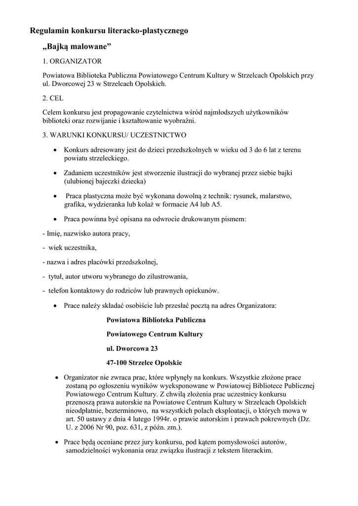 Regulamin konkursu literacko-plastycznego „Bajką malowane” 1. ORGANIZATOR Powiatowa Biblioteka Publiczna Powiatowego Centrum Kultury w Strzelcach Opolskich przy ul. Dworcowej 23 w Strzelcach Opolskich. 2. CEL Celem konkursu jest propagowanie czytelnictwa wśród najmłodszych użytkowników biblioteki oraz rozwijanie i kształtowanie wyobraźni. 3. WARUNKI KONKURSU/ UCZESTNICTWO Konkurs adresowany jest do dzieci przedszkolnych w wieku od 3 do 6 lat z terenu powiatu strzeleckiego. Zadaniem uczestników jest stworzenie ilustracji do wybranej przez siebie bajki (ulubionej bajeczki dziecka) Praca plastyczna może być wykonana dowolną z technik: rysunek, malarstwo, grafika, wydzieranka lub kolaż w formacie A4 lub A5. Praca powinna być opisana na odwrocie drukowanym pismem: - Imię, nazwisko autora pracy, - wiek uczestnika, - nazwa i adres placówki przedszkolnej, - tytuł, autor utworu wybranego do zilustrowania, - telefon kontaktowy do rodziców lub prawnych opiekunów. Prace należy składać osobiście lub przesłać pocztą na adres Organizatora: Powiatowa Biblioteka Publiczna Powiatowego Centrum Kultury ul. Dworcowa 23 47-100 Strzelce Opolskie Organizator nie zwraca prac, które wpłynęły na konkurs. Wszystkie złożone prace zostaną po ogłoszeniu wyników wyeksponowane w Powiatowej Bibliotece Publicznej Powiatowego Centrum Kultury. Z chwilą złożenia prac uczestnicy konkursu przenoszą prawa autorskie na Powiatowe Centrum Kultury w Strzelcach Opolskich nieodpłatnie, bezterminowo, na wszystkich polach eksploatacji, o których mowa w art. 50 ustawy z dnia 4 lutego 1994r. o prawie autorskim i prawach pokrewnych (Dz. U. z 2006 Nr 90, poz. 631, z późn. zm.). Prace będą oceniane przez jury konkursu, pod kątem pomysłowości autorów, samodzielności wykonania oraz związku ilustracji z tekstem literackim. Złożenie pracy konkursowej jest równoznaczne z akceptacją niniejszego regulaminu. 4. TERMIN Konkurs trwa od dnia ogłoszenia, tj. 2 kwietnia 2015r., do dnia 5 maja 2015r. Regulamin konkursu będzie opublikowany na stronie Powiatowego Centrum Kultury w Strzelcach Opolskich http://centrum-kultury.eu i https://pl.facebook.com/PowiatoweCentrumKultury oraz dostępny w siedzibie Powiatowej Biblioteki Publicznej Powiatowego Centrum Kultury w Strzelcach Op., ul. Dworcowa 23, I piętro. Prace należy złożyć w siedzibie Powiatowej Biblioteki Publicznej Powiatowego Centrum Kultury lub przesłać najpóźniej do dnia 5 maja 2015 r. na adres: Powiatowe Centrum Kultury w Strzelcach Opolskich ul. Dworcowa 23, 47-100 Strzelce Opolskie. W przypadku przesyłki pocztowej o terminie ważności decyduje data wpływu do siedziby Powiatowego Centrum Kultury. Wynik konkursu zostanie ogłoszony w Tygodniu Bibliotek, nie później niż do 10 maja 2015 r. Zwycięzca konkursu zostanie powiadomiony telefonicznie o decyzji jury i terminie wręczenia nagród. 5. NAGRODA Organizator konkursu przewiduje nagrody za zajęcie I, II i III miejsca. 6. UWAGI KOŃCOWE Wzięcie udziału w konkursie jest równoznaczne z wyrażeniem zgody na przetwarzanie danych osobowych przez organizatora, zgodnie z ustawą z dnia 29 sierpnia 1997 r. o ochronie danych osobowych (Dz. U. z 2002r. Nr 101 poz. 926 z późn. zm.), dla potrzeb realizacji konkursu. W sprawach nie objętych niniejszym regulaminem stosuje się odpowiednie przepisy Kodeksu Cywilnego i ustawy o prawie autorskim i prawach pokrewnych. Dodatkowe informacje dotyczące konkursu można uzyskać w siedzibie Organizatora Konkursu: Powiatowa Biblioteka Publiczna w Strzelcach Opolskich, ul. Dworcowa 23 Tel. 77 418 00 52, wtorek – piątek 9.00 -18.00; e-mail: [email protected]