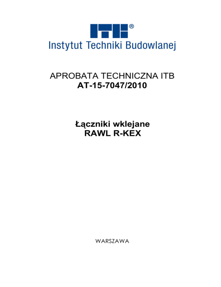 APROBATA TECHNICZNA ITB AT-15-7047/2010 Łączniki wklejane RAWL R-KEX WARSZAWA Aprobata techniczna została opracowana w Zakładzie Aprobat Technicznych przez dr inż. Witolda MAKULSKIEGO Projekt okładki: Ewa Kossakowska GW I Kopiowanie aprobaty technicznej jest dozwolone jedynie w całości Wykonano z oryginałów bez opracowania wydawniczego Copyright by Instytut Techniki Budowlanej Warszawa 2010 ISBN 978-83-249-3276-4 Dział Wydawniczy, 02-656 Warszawa, ul. Ksawerów 21, tel.: 22 843 35 19 Format: pdf Wydano w grudniu 2010 r. Zam. 732/2010 Seria: APROBATY TECHNICZNE APROBATA TECHNICZNA ITB AT-15-7047/2010 Na podstawie rozporządzenia Ministra Infrastruktury z dnia 8 listopada 2004 r. w sprawie aprobat technicznych oraz jednostek organizacyjnych upoważnionych do ich wydawania (Dz. U. Nr 249, poz. 2497), w wyniku postępowania aprobacyjnego dokonanego w Instytucie Techniki Budowlanej w Warszawie na wniosek firmy: KOELNER S.A. ul. Kwidzyńska 6, 51-416 Wrocław stwierdza się przydatność do stosowania w budownictwie wyrobów pod nazwą: ŁĄCZNIKI WKLEJANE RAWL R-KEX w zakresie i na zasadach określonych w Załączniku, który stanowi integralną część niniejszej Aprobaty Technicznej ITB. DYREKTOR Termin ważności: 19 października 2015 r. Instytutu Techniki Budowlanej Marek Kaproń Załącznik: Postanowienia ogólne i techniczne Warszawa, 19 października 2010 r. Aprobata Techniczna ITB AT-15-7047/2010 jest nowelizacją Aprobaty Technicznej ITB AT-15-7047/2006. Dokument Aprobaty Technicznej ITB AT-15-7047/2010 zawiera 18 stron. Tekst tego dokumentu kopiować można tylko w całości. Publikowanie lub upowszechnianie w każdej innej formie fragmentów tekstu Aprobaty Technicznej wymaga pisemnego uzgodnienia z Instytutem Techniki Budowlanej. ® AT-15-7047/2010 str. 2/18 ZAŁĄCZNIK POSTANOWIENIA OGÓLNE I TECHNICZNE SPIS TREŚCI 1. PRZEDMIOT APROBATY .................................................................................................... 3 2. PRZEZNACZENIE, ZAKRES I WARUNKI STOSOWANIA .................................................. 3 3. WŁAŚCIWOŚCI TECHNICZNE. WYMAGANIA ................................................................... 4 3.1. Materiały ....................................................................................................................... 4 3.2. Łączniki wklejane .......................................................................................................... 5 4. PAKOWANIE, PRZECHOWYWANIE I TRANSPORT ......................................................... 5 5. OCENA ZGODNOŚCI .......................................................................................................... 5 5.1. Zasady ogólne .............................................................................................................. 5 5.2. Wstępne badanie typu .................................................................................................. 6 5.3. Zakładowa kontrola produkcji ....................................................................................... 6 5.4. Badania gotowych wyrobów ......................................................................................... 7 5.5. Częstotliwość badań ..................................................................................................... 7 5.6. Metody badań ............................................................................................................... 7 5.7. Pobieranie próbek do badań ........................................................................................ 8 5.8. Ocena wyników badań.................................................................................................. 8 6. USTALENIA FORMALNO-PRAWNE ................................................................................... 8 7. TERMIN WAŻNOŚCI ........................................................................................................... 9 INFORMACJE DODATKOWE.................................................................................................. 9 RYSUNKI i TABLICE .............................................................................................................. 11 ® AT-15-7047/2010 str. 3/18 1. PRZEDMIOT APROBATY Przedmiotem Aprobaty Technicznej są łączniki wklejane RAWL R-KEX, produkcji firmy KOELNER S.A. Łączniki wklejane RAWL R-KEX są dostarczane w kompletach zawierających nagwintowane pręty stalowe lub żebrowane pręty zbrojeniowe oraz pojemniki z epoksydową zaprawą żywiczną. Nagwintowane pręty stalowe i żebrowane pręty zbrojeniowe przedstawiono na rysunkach 1 ÷ 3, a wymiary podano w tablicach 1 ÷ 3. Nagwintowane pręty stalowe są wykonywane ze stali zwykłej, węglowej i ocynkowane warstwą cynku o grubości nie mniejszej niż 5 µm lub są wykonywane ze stali nierdzewnej, a żebrowane pręty zbrojeniowe są wykonywane ze stali zwykłej, węglowej i nie są pokrywane warstwą ochronną. Nagwintowane pręty stalowe i żebrowane pręty zbrojeniowe są wprowadzane w otwory w podłożu wypełniane zaprawą żywiczną. Po stwardnieniu zaprawy następuje trwałe zakotwienie prętów. 2. PRZEZNACZENIE, ZAKRES I WARUNKI STOSOWANIA Łączniki wklejane RAWL R-KEX są stosowane do wykonywania zamocowań statycznie obciążonych elementów konstrukcji budowlanych w betonie niezarysowanym, klasy nie niższej niż C20/25 według normy PN-EN 206-1:2003. Ze względu na agresywność korozyjną środowiska, łączniki wklejane RAWL R-KEX z nagwintowanymi prętami stalowymi wykonanymi ze stali zwykłej, węglowej i ocynkowanymi należy stosować zgodnie z normami: PN-EN 12329:2002, PN-EN 12944-2:2001 i PN-EN 10152:2009, łączniki RAWL R-KEX z nagwintowanymi prętami stalowymi wykonanymi ze stali nierdzewnej należy stosować zgodnie z wymaganiami podanymi w normie PN-71/H86010 dla stali nierdzewnej gatunku OOH17N14M2, a łączniki RAWL R-KEX z żebrowanymi prętami zbrojeniowymi należy stos