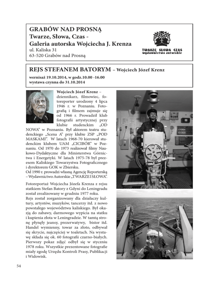 GRABÓW NAD PROSNĄ Twarze, Słowa, Czas Galeria autorska Wojciecha J. Krenza ul. Kaliska 31 63-520 Grabów nad Prosną REJS STEFANEM BATORYM – Wojciech Józef Krenz wernisaż 19.10.2014, w godz.10.00 -16.00 wystawa czynna do 31.10.2014 Wojciech Józef Krenz – dziennikarz, filmowiec, fotoreporter urodzony 4 lipca 1946 r. w Poznaniu. Fotografią i filmem zajmuje się od 1966 r. Prowadził klub fotografii artystycznej przy klubie studenckim „OD NOWA” w Poznaniu. Był aktorem teatru studenckiego „Scena A” przy klubie ZSP „POD MASKAMI”. W latach 1968-70 kierował studenckim klubem UAM „CICIBÓR” w Poznaniu. Od 1970 do 1973 realizował filmy Naukowo-Dydaktyczne dla Ministerstwa Górnictwa i Energetyki. W latach 1975-78 był prezesem Kaliskiego Towarzystwa Fotograficznego i dyrektorem GOK w Zbiersku. Od 1990 r. prowadzi własną Agencję Reporterską – Wydawnictwo Autorskie „TWARZE l SŁOWA”. Fotoreportaż Wojciecha Józefa Krenza z rejsu statkiem Stefan Batory z Gdyni do Leningradu został zrealizowany w grudniu 1977 roku. Rejs został zorganizowany dla działaczy kultury, artystów, muzyków, tancerzy itd. z nowo powstałego województwa kaliskiego. Był okazją do zabawy, darmowego wypicia na statku i kupienia złota w Leningradzie. W tamtą stronę płynęły jeansy, prezerwatywy, bistor itd. Handel wymienny, towar za złoto, odbywał się skrycie, najczęściej w toaletach. Na wystawę składa się ok. 60 fotografii czarno-białych. Pierwszy pokaz zdjęć odbył się w styczniu 1978 roku. Wszystkie prezentowane fotografie miały zgodę Urzędu Kontroli Prasy, Publikacji i Widowisk. 54