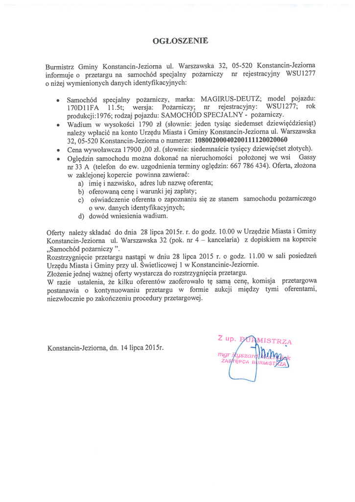 OGŁOSZENIE Burmistrz Gminy Konstancin-Jeziorna ul. Warszawska 32, 05-520 Konstancin-Jeziorna informuje o przetargu na samochód specjalny pożarniczy nr rejestracyjny WSU1277 o niżej wymienionych danych identyfikacyjnych: • Samochód specjalny pożarniczy, marka: MAGIRUS-DEUTZ; model pojazdu: 170D1 1FA 1 1.5t; wersja: Pożarniczy; nr rejestracyjny: WSU1277; rok produkcji:1976; rodzaj pojazdu: SAMOCHOD SPECJALNY pożarniczy. Wadium w wysokości 1790 zł (słownie: jeden tysiąc siedemset dziewięćdziesiąt) należy wpłacić na konto Urzędu Miasta i Gminy Konstancin-Jeziorna ul. Warszawska 32, 05-520 Konstancin-Jeziorna o numerze: 10800200040200111120020060 Cena wywoławcza 17900 „00 zł. (słownie: siedemnaście tysięcy dziewięćset złotych). Oględzin samochodu można dokonać na nieruchomości położonej we wsi Gassy nr 33 A (telefon do ew. uzgodnienia terminy oględzin: 667 786 434). Oferta, złożona w zaklejonej kopercie powinna zawierać: a) imię i nazwisko, adres lub nazwę oferenta; b) oferowaną cenę i warunki jej zapłaty; c) oświadczenie oferenta o zapoznaniu się ze stanem samochodu pożarniczego o ww. danych identyfikacyjnych; d) dowód wniesienia wadium. - • • • Oferty należy składać do dnia 28 lipca 2015r. r. do godz. 10.00 w Urzędzie Miasta i Gminy Konstancin-Jeziorna ut. Warszawska 32 (pok. nr 4 kancelaria) z dopiskiem na kopercie „Samochód pożarniczy Rozstrzygnięcie przetargu nastąpi w dniu 28 lipca 2015 r. o godz. 11.00 w sali posiedzeń Urzędu Miasta i Gminy przy ul. Swietlicowej 1 w Konstancinie-Jeziornie. Złożenie jednej ważnej oferty wystarcza do rozstrzygnięcia przetargu. W razie ustalenia, że kilku oferentów zaoferowało tę samą cenę, komisja przetargowa postanawia o kontynuowaniu przetargu w formie aukcji między tymi oferentami, niezwłocznie po zakończeniu procedury przetargowej. — „. Zup. Konstancin-Jeziorna, dn. 14 lipca 2015r.