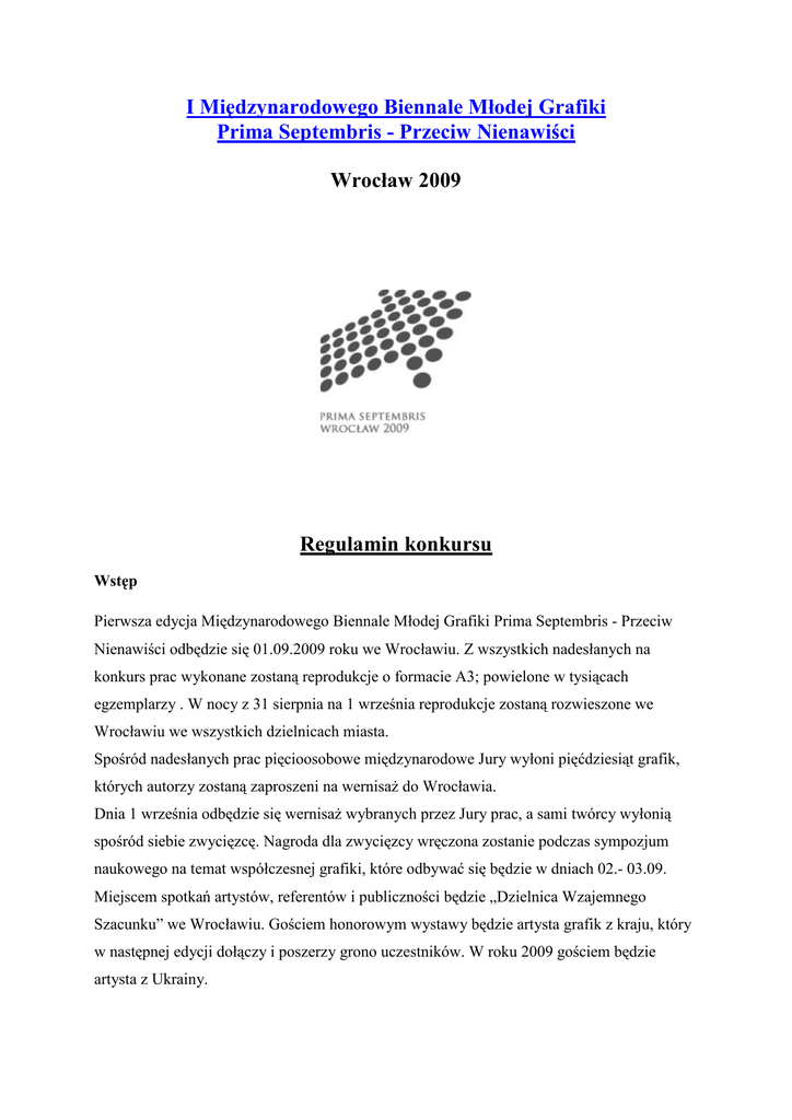 I Międzynarodowego Biennale Młodej Grafiki Prima Septembris - Przeciw Nienawiści Wrocław 2009 Regulamin konkursu Wstęp Pierwsza edycja Międzynarodowego Biennale Młodej Grafiki Prima Septembris - Przeciw Nienawiści odbędzie się 01.09.2009 roku we Wrocławiu. Z wszystkich nadesłanych na konkurs prac wykonane zostaną reprodukcje o formacie A3; powielone w tysiącach egzemplarzy . W nocy z 31 sierpnia na 1 września reprodukcje zostaną rozwieszone we Wrocławiu we wszystkich dzielnicach miasta. Spośród nadesłanych prac pięcioosobowe międzynarodowe Jury wyłoni pięćdziesiąt grafik, których autorzy zostaną zaproszeni na wernisaŜ do Wrocławia. Dnia 1 września odbędzie się wernisaŜ wybranych przez Jury prac, a sami twórcy wyłonią spośród siebie zwycięzcę. Nagroda dla zwycięzcy wręczona zostanie podczas sympozjum naukowego na temat współczesnej grafiki, które odbywać się będzie w dniach 02.- 03.09. Miejscem spotkań artystów, referentów i publiczności będzie „Dzielnica Wzajemnego Szacunku” we Wrocławiu. Gościem honorowym wystawy będzie artysta grafik z kraju, który w następnej edycji dołączy i poszerzy grono uczestników. W roku 2009 gościem będzie artysta z Ukrainy. Wystawa Biennale, tzw. wystawa podróŜująca, pokazana zostanie w kilku miastach Izraela, Niemiec, Polski i Rosji w latach 2009-2011. Wystawie towarzyszyć będzie katalog. Uczestnicy W konkursie I Międzynarodowego Biennale Młodej Grafiki Prima Septembris - Przeciw Nienawiści mogą wziąć udział wszyscy studenci wyŜszych szkół plastycznych z Izraela, Niemiec, Polski i Rosji, którzy nadeślą swoje prace w określonych regulaminem: technikach, formatach i terminach. Prace konkursowe 1. Na Międzynarodowego Biennale Młodej Grafiki Prima Septembris - Przeciw Nienawiści przysyłać moŜna prace w technikach graficznych warsztatowych (klasyczne techniki artystyczne), tylko czarno-białych, o wymiarach pomiędzy: minimalne 300x300 mm – maksymalne 1000x1000 mm. Przyjmowane są tylko oryginalne odbitki, pierwsze (poza autorskimi), z wyraźnym opisem ilości wykonanej z matrycy. 2. Prace muszą odnosić się do idei przewodniej Biennale oraz do tytułu I Edycji: Przeciw Nienawiści. 3. Prace nie mogą być wcześniej wystawiane, publikowane oraz prezentowane na pokazach artystycznych (happeningach, przedstawieniach teatralnych, eventach, pokazach pracowni itp.). 4. Autorzy prac w momencie przesyłania pracy (data stempla pocztowego) muszą być studentami wyŜszej uczelni artystycznej. 5. Prace nie mogą być oprawione (szkło, ramy, passe-partout itp.). Dopuszcza się naklejenie na lekkie podłoŜe. 6. Artysta moŜe przesłać do trzech prac. 7. Wszystkie nadesłane prace muszą być opisane na osobnej karcie naklejonej na ich rewersie. Opis (w języku angielskim) musi zawierać: • tytuł, • wymiary, • technikę wykonania, • datę i miejsce urodzenia autora, • nazwę uczelni artystycznej, do której uczęszcza autor, • CV. 8. Wszystkie nadesłane prace stanowią część kolekcji Międzynarodowego Biennale Młodej Grafiki Prima Septembris we Wrocławiu i nie są tym samym zwracane autorom. Przesłanie pracy na konkurs jest jednoznaczne z akceptacją tego punktu regulaminu. 9. Wszystkie prace niespełniające warunków regulaminu nie będą brały udziału w konkursie. Ich odbiór, transport i koszta z tym związane leŜą w gestii autora pracy. Termin nadsyłania prac Prace nadsyłać moŜna do 30 kwietnia 2009 Adres pocztowy do wysyłki prac: Forum Kultur Biennale ul. Jedności Narodowej 110 B 50-301 Wrocław Jury Prace oceniane będą przez międzynarodowe pięcioosobowe jury, które wyłoni 50 prac do wystawy. Nie ma moŜliwości odwołania od werdyktu jury. Autorzy prac wyłonionych do wystawy wybiorą spośród siebie podczas wernisaŜu najlepszą pracę do nagrody Grand Prix Prima Septembris 2009. Nagrody Grand Prix Prima Septembris 2009 – nagroda zostanie przekazana w formie dofinansowania realizacji projektu artystycznego przedstawionego przez zwycięzcę. Przedstawienie projektu do realizacji musi nastąpić nie później niŜ siedem miesięcy od ogłoszenia werdyktu. Planowana są równieŜ dodatkowe nagrody fundowane przez publiczność, sponsorów i mecenasów Biennale. Dalsze warunki Wszyscy artyści zakwalifikowani do wystawy otrzymują: bezpłatny egzemplarz katalogu; zwrot kosztów podróŜy i zakwaterowania we Wrocławiu w dniach 31 sierpnia – 03 września 2009; zapewnioną promocję podczas trwania wystawy. Organizator Generalny Forum Kultur Mecenat Minister Kultury i Dziedzictwa Narodowego – Bogdan Zdrojewski Narodowe Centrum Kultury Miasto Wrocław Miejsca wystaw tzw. „Wystawy PodróŜującej” Polska – Wrocław, Kraków, Lublin, Warszawa, Gdańsk, Poznań Niemcy – Berlin, Drezno, Monachium, Saarbrücken, Kolonia, Hamburg, Wiesbaden Izrael – Tel Awiw, Jerozolima, Ramat Gan Rosja – Moskwa, Sankt Petersburg Dodatkowe informacje o biennale: Bernard śołyniak, dyrektor generalny biennale, tel.: +48 660427363, e-mail: [email protected] Katarzyna Gondek, sekretarz biennale, tel.: +48 660737897, e-mail: [email protected]