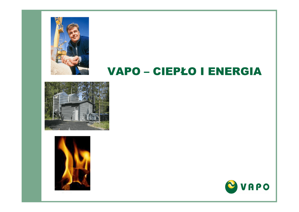 VAPO – CIEPŁO I ENERGIA Grupa Vapo • Wiodący producent bioenergii w Europie • SprzedaŜ w 2006 roku - 600,9 mln EUR • Zysk operacyjny w 2006 r. - 53,8 mln EUR • Firma zatrudnia 1.891 pracowników w tym 977 pracuje w Finlandii i 914 w pozostałych krajach Grupa Vapo • Firma Vapo została załoŜona w 1940 r. • 50,1% udziałów naleŜy do Skarbu Państwa Finlandii, a 49,9% posiada Metsallitto Cooperative • Grupa Vapo działa w 4 obszarach: - Vapo - Pelety - Vapo - Ciepło i Energia - Vapo – Paliwa Lokalne - Vapo - Środowisko Spółka zaleŜna Vapo Timber OY zajmuje się przerobem drewna, a Kekkilä Oyj produkuje i sprzedaje produkty wspomagające wzrost roślin ( ziemię ogrodniczą , nawozy itp.) Kotłownia ogrzewana peletami • Technologia ogrzewania peletami jest bardzo prosta: • Zasadnicze elementy kotłowni: – – – – – – – Zbiornik na pelet Podajnik śrubowy (ślimakowy) Palnik i kocioł Wentylator kominowy, oczyszczacz spalin i komin Podajnik śrubowy podajnik popiołu i zbiornik Instalacja rurowa z pompami i osprzętem Aparatura elektryczna i sterująca Fig ur e: T her mi aO ym ate rial Ogrzewanie peletami w praktyce Ogrzewanie peletami jest zwykle realizowane przy uŜyciu przenośnej kotłowni kontenerowej : • Zmiana ogrzewania z olejowego / gazowego na peletowe jest szybkie i łatwe. • Kotłownia na pelet jest dostarczana „pod klucz”. Jedynie wcześniej naleŜy przygotować fundamenty. • W przypadku zwiększenia zapotrzebowania na ciepło kotłownia moŜe być w łatwy sposób zastąpiona większą jednostką. PALNIK NA PELET • Technologia spalania peletu jest bardzo podobna do technologii spalania innych paliw stałych • Pelet moŜe być spalany przy uŜyciu stokera, rusztu lub specjalnego palnika • Palnik na pelet moŜe być zainstalowany w istniejących kotłach olejowych lub na drewno płaszcz chłodzony wodą ceramiczne sklepienie ruchomy, Ŝeliwny ruszt Kocioł i wymiennik • Do spalania peletu stosowane są te same kotły jak do spalania zrębek Komora spalania Wymiennik Podajnik śrubowy do usuwania popiołu i drzwiczki od popielnika Usuwanie popiołu • Automatyczne usuwanie popiołu • Podajnik ślimakowy usuwa automatycznie popiół do metalowego zbiornika na zewnątrz • Zawartość popiołu ok. 0,5 % • spalanie 166 m3 peletu=500 MWh powstaje ok. 500 kg popiołu rocznie Oczyszczanie gazów • W porównaniu z paliwami kopalnymi, drewno jest czystym paliwem o niskiej emisji siarki i tlenku azotu • Minimalizacja ilości wydzielanych gazów rozpoczyna się od weryfikacji palnika • W kotłach opalanych peletem, gazy są oczyszczane w multicyklonie, gdzie drobne frakcje pod wpływem ruchu powietrza dostają się do zbiornika na popiół. Zabezpieczenie przed poŜarem • Zabezpieczenie przed powrotem płomienia: – topliwa plastikowa rura – podajnik obrotowy – sucha gaśnica • Podajnik śrubowy podaje pelet do zbiornika pośredniego, z którego tylko jedna porcja w jednym czasie podawana jest na palnik Kotłownie ogrzewane peletami w Finlandii • Vapo Oy eksploatuje w Finlandii ponad 30 kotłowni ogrzewanych peletami • Typowa kotłownia: – Moc grzewcza : 400 – 2500 kW – Roczna produkcja ciepła: 1.5 – 10 GWh/a – Prefabrykowana / przenośna kotłownia, lub urządzenia instalowane w istniejących budynkach – Ciepłownie przemysłowe, miejskie / komunalne, dla niewielkich dzielnic i gmin – Paliwo: pelety drzewne (częściowo torfowe) – Umowy długoterminowe Kotłownia Kontenerowa Vapo Vapo – SprzedaŜ ciepła • Vapo dostarcza urządzenia grzewcze dla duŜych obiektów, firm i ciepłowni regionalnych (energia cieplna w ciągu roku 1 – 8 GWh) • Vapo zapewnia : - pokrycie kosztów inwestycji, - dostawy paliwa, - konserwację urządzeń, oraz - obsługę kotłowni. • Odbiorca ponosi stałą opłatę i opłatę za zuŜyte ciepło, według stabilnej, długoterminowej stawki umownej Zalety i Korzyści 1. Oszczędności – – UŜytkownik nie musi inwestować w urządzenia ciepłownicze Wytwarzanie ciepła nie wymaga angaŜowania pracowników 2. Ułatwienia – Vapo wykonuje wszelkie działania związane z wytwarzaniem ciepła, wymagane przez klienta 3. Bezpieczeństwo i brak ryzyka – – Vapo wytwarza i dostarcza ciepło przez całą dobę, 7 dni w tygodniu, przez cały rok Odbiorca nie ponosi odpowiedzialności ekonomicznej lub operacyjnej za wytwarzanie ciepła. Zalety i Korzyści 4. Ekonomia – – Ceny ciepła są ustalane w umowach długoterminowych (5 – 10 lat lub dłuŜszych Koszty (jedna faktura w miesiącu) podzielone są na dwie części: stałą i zmienną 5. Dostosowane do potrzeb klienta – Układy wytwarzania ciepła są dostosowane do indywidualnych potrzeb i wymagań odbiorcy. 6. Przyjazne dla środowiska, wykorzystuje krajowe surowce – – Pelety drzewne są paliwem biologicznym o znikomej emisji gazów cieplarnianych Pelety są produkowane z surowców krajowych, cały proces produkcyjny odbywa się w Polsce Klienci • Głównymi klientami są: - Budynki uŜyteczności publicznej: ( szkoły, szpitale , urzędy...) – Szklarnie – Domy Kultury – Wspólnoty mieszkaniowe – Zakłady produkcyjne Model kotłowni kontenerowej Model kotłowni kontenerowej Kotłownie ogrzewane peletami w Finlandii, Szwecji i Estonii Forssa Eerikkilä Haapavesi Heinävesi Kajaani Joensuu Kerimäki Kirkkonummi Kuhmoinen Kuivaniemi Kuivaniemi Kuusamo Kuusamo Lassinsaari Luumäki Masku Nousiainen Haukineva Pudasjärvi Rovaniemi Saarijärvi Sotkamo Sotkamo Sukeva Sukeva Tervola Tervola Tikkakoski Oulu Vehmersalmi Vekarajärvi Ähtäri Istniejące W budowie Szwecja: Ramnäs Jönköping Gullspång 1200kW 100kW 200kW 300kW Estonia: Tootsi Torma Tapa 2500 kW 600kW 3100kW 10000kW 1000kW 160kW 750kW 500kW 700kW 3 x appr.100kW 400kW 500kW 125kW 500kW 500kW 200kW 65kW 1000kW 500kW 1000kW 500kW 100kW 750kW 700kW 300kW 700kW 300kW 500kW 500kW 700kW 700kW 300kW 1000kW 500kW 1500kW