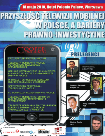 PATRONI MEDIALNI PROGRAM PRELEGENCI 9.00 Rejestracja uczestników, poranna kawa. Mariusz Busiło 9.30 Co to jest telewizja mobilna? Telewizja mobilna w Polsce – potencjalne możliwości implementacji Specjalista ds. telekomunikacji, prawa autorskiego, mediów i nowych technologii. Pracowal w Kancelarii Prawnej Hunton&Williams, Kancelarii Prezesa Rady Ministrów, Krajowej Radzie Radiofonii i Telewizji oraz Urzedzie Regulacji Telekomunikacji i Poczty. Uczestniczyl aktywnie w pracach nad nowelizacjami ustaw z powyzszych dziedzin. W szczególnosci zajmowal sie implementacja dyrektyw unijnych do polskiego prawa, m.in.. koordynujac europejskie projekty pomocy technicznej w tym zakresie oraz biorac udzial w pracach legislacyjnych. Obecnie pelni funkcje zastepcy dyrektora w Departamencie Zarzadzania Zasobami Czestotliwosci w Urzedzie Komunikacji Elektronicznej i odpowiada za prawne i proceduralne aspekty gospodarki czestotliwosciami w Polsce. Bierze udzial w pracach grup roboczych ITU-R, CEPT oraz COCOM. Bierze aktywny udzial w pracach majacych na celu wdrozenie naziemnej telewizji cyfrowej w Polsce. * Broadcast a webcast * częstotliwości radiodyfuzyjne - multipleksy * Standard DVB-H Warunki rezerwacyjne uruchomienia ruchomej telewizji w standardzie DVB-H w Polsce * Harmonogram rozwoju sieci - gdzie i kiedy zaczną pojawiać się usługi * Warunki programowe - co będzie w telewizji mobilnej i od czego to zależy * Dostawca hurtowy - czyli od kogo kupi usługę klient końcowy? Mariusz Busiło Zastępca Dyrektora w Departamencie Zarządzania Częstotliwościami, UKE 10.15 W jakiej technologii będziemy oglądać telewizję w komórce? * Popyt w Polsce i na świecie na TV mobile. * Co ogranicza rozwój DVB-H w Polsce? * Czy są jakieś alternatywy dla TV w komórce? Jerzy Sadowski Wice Prezes ds.TelekomuniKacji Mobilnej, Polska Izba Informatyki i Telekomunikacji 11.00 Jakie są wymogi techniczne (technologiczne), aby oglądać telewizję mobilną? Jaki powinien być telefon, aby można było oglądać programy telewizyjne i słuchać programów radiowych * Specyfikacja sprzętowa; dostępność na rynku polskim; kto zapewnia aparaty telefoniczne. * Jaka jest możliwość poszerzenia oferty sprzętowej Czekamy na potwierdzenie prelegenta* 11.45 Przerwa na kawę 12.00 Prawne aspekty handlowych przekazów audiowizualnych * handlowy przekaz audiowizualny w Dyrektywie o Audiowizualnych Usługach Medialnych * wymogi prawne w zakresie stosowania handlowych przekazów audiowizualnych (tj. reklamy telewizyjnej, telesprzedaży, lokowania produktu, sponsorowania) * stan implementacji handlowych przekazu audiowizualnego do prawa polskiego mec. Andrzej Krasuski, CMS Cameron McKenna 12.45 Telewizja mobilna alternatywą dla telewizji tradycyjnej i internetowej. Zastępca Dyrektora w Departamencie Zarządzania Częstotliwościami, UKE Ewa Gadomska Dyrektor Departamentu Komunikacji Kablowej, KRRiT Współautor materiałów do Strategii Państwa Polskiego w dziedzinie mediów elektronicznych na lata 2005-2020. Współtwórca strategii – Obrona Lokalności i Demokracji Lokalnej – Strategia działania Krajowej Rady Radiofonii i Telewizji na rzecz ochrony lokalnego charakteru i pluralizmu oferty programowej w lokalnych mediach elektronicznych w Polsce. Współautor stanowiska KRRiT w sprawie współpracy TVP S.A. z operatorami sieci kablowych i platform satelitarnych. Autor stanowiska KRRiT w sprawie interpretacji przepisu art. 43 ust. 1 ustawy o radiofonii i telewizji. Wicedyrektor w Departamencie Koncesyjnym 2000r. do 2004r. Zatrudniona w Biurze KRRiT od 1993r. Panelista na Konferencjach Programowych Polskiej Izby Komunikacji Elektronicznej (konwengercja mediów, przyszłość mediów elektronicznych, cyfryzacja, polityka KRRiT w zakresie działalności operatorów sieci kablowych). Odpowiedzialna za koncesje na rozpowszechnianie programów i rejestrację programów w sieciach kablowych oraz rozwój usługi DVB-H w zakresie rozpowszechniania i rozprowadzania programów. Członek Rady Programowej Konferencji Programowych PIKE. Juror konkursu „ To nas dotyczy” – najlepsze audycje nadawane w koncesjonowanych programach rozpowszechnianych w sieciach kablowych. Członek Zespołu ekspertów przy KRRiT przygotowującego strategię, tryb, procedurę dotyczącą przejścia radia i telewizji z nadawania analogowego na cyfrowe Grzegorz Bernatek Kierownik Działu Analiz, Audytel S.A. Absolwent Politechniki Warszawskiej, Wydzialu Elektroniki i Technik Informacyjnych (kierunek: Telekomunikacja), a obecnie doktorant na tym wydziale. Od roku 2004 kieruje projektami badawczymi dotyczacymi polskiego i europejskiego rynku telekomunikacyjnego, tworzenia modeli rynkowych i systemowych oraz prowadzi doradztwo i szkolenia dla klientów Audytela. Wczesniej pracowal jako audytor systemów teleinformatycznych w Audytelu oraz analityk/programista w Mc-Kinsey & Company. Andrzej Krasuski CMS Cameron McKenna Kieruje praktyka Prawa Telekomunikacyjnego, Mediów i Ochrony Danych Osobowych w warszawskim biurze CMS Cameron McKenna oraz regionalna praktyka Ochrony Danych Osobowych w Europie Srodkowo-Wschodniej. Andrzej Krasuski od dziesieciu lat doradza klientom w wielu aspektach zwiazanych z prowadzona przez nich dzialalnoscia gospodarcza na rynku telekomunikacyjnym i rynku mediów. Robert Dygas MVNE Advisor, The Besen Group LLC * Stan rynku telewizyjnego w Polsce, ze szczególnym uwzględnieniem usług płatnych * Trendy w rozwoju rynku usług audiowizualnych oraz wpływ Internetu * Szanse i zagrożenia dla telewizji mobilnej Grzegorz Bernatek, Kierownik Działu Analiz, Audytel S.A. 13.30 Telewizja mobilna w innych krajach Europy – czy teoria sprawdziła się w praktyce? Czy Polski rynek telekomunikacyjny może czerpać, brać przykład z dokonań sąsiadów? Robert Dygas, MVNE Advisor, The Besen Group LLC 14.15 Lunch 15.15 Podsumowanie program pilotażowego - główne punkty testów pilotażowych * Czego dotyczyły i co miały poka