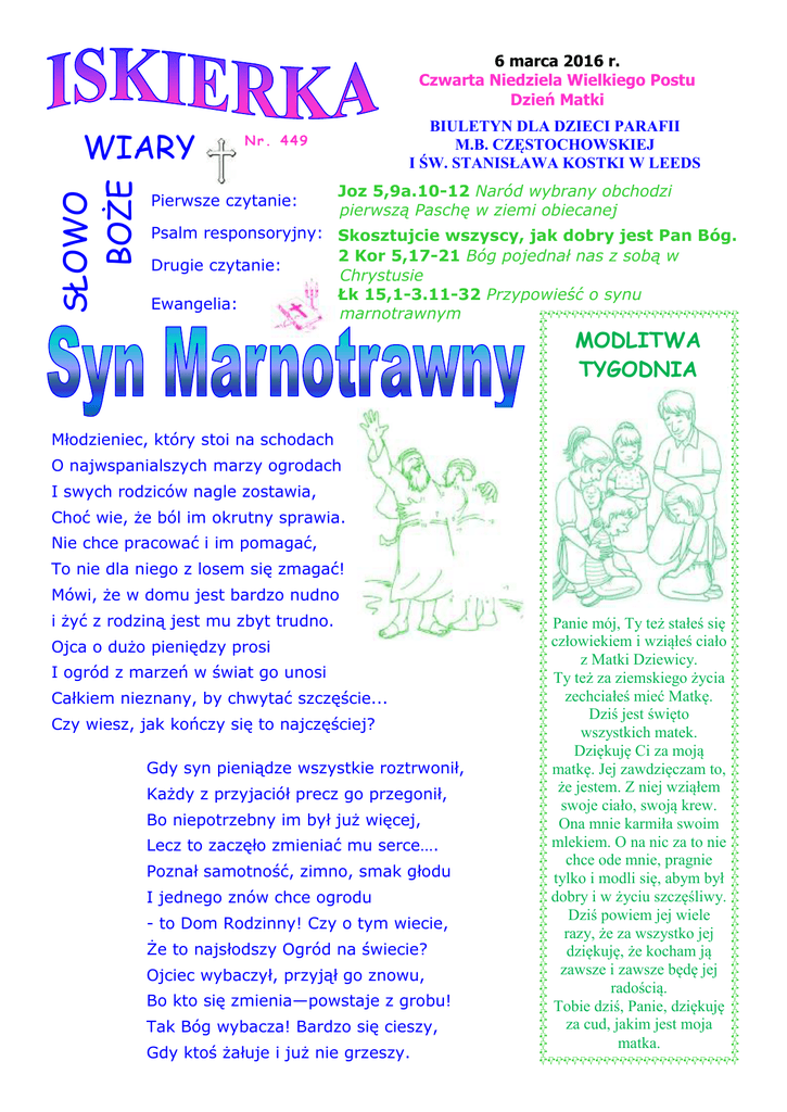 6 marca 2016 r. Czwarta Niedziela Wielkiego Postu Dzień Matki SŁOWO BOŻE WIARY BIULETYN DLA DZIECI PARAFII M.B. CZĘSTOCHOWSKIEJ I ŚW. STANISŁAWA KOSTKI W LEEDS Nr. 449 Pierwsze czytanie: Joz 5,9a.10-12 Naród wybrany obchodzi pierwszą Paschę w ziemi obiecanej Psalm responsoryjny: Skosztujcie wszyscy, jak dobry jest Pan Bóg. 2 Kor 5,17-21 Bóg pojednał nas z sobą w Drugie czytanie: Chrystusie Łk 15,1-3.11-32 Przypowieść o synu Ewangelia: marnotrawnym MODLITWA TYGODNIA Młodzieniec, który stoi na schodach O najwspanialszych marzy ogrodach I swych rodziców nagle zostawia, Choć wie, że ból im okrutny sprawia. Nie chce pracować i im pomagać, To nie dla niego z losem się zmagać! Mówi, że w domu jest bardzo nudno i żyć z rodziną jest mu zbyt trudno. Ojca o dużo pieniędzy prosi I ogród z marzeń w świat go unosi Całkiem nieznany, by chwytać szczęście... Czy wiesz, jak kończy się to najczęściej? Gdy syn pieniądze wszystkie roztrwonił, Każdy z przyjaciół precz go przegonił, Bo niepotrzebny im był już więcej, Lecz to zaczęło zmieniać mu serce…. Poznał samotność, zimno, smak głodu I jednego znów chce ogrodu - to Dom Rodzinny! Czy o tym wiecie, Że to najsłodszy Ogród na świecie? Ojciec wybaczył, przyjął go znowu, Bo kto się zmienia—powstaje z grobu! Tak Bóg wybacza! Bardzo się cieszy, Gdy ktoś żałuje i już nie grzeszy. Panie mój, Ty też stałeś się człowiekiem i wziąłeś ciało z Matki Dziewicy. Ty też za ziemskiego życia zechciałeś mieć Matkę. Dziś jest święto wszystkich matek. Dziękuję Ci za moją matkę. Jej zawdzięczam to, że jestem. Z niej wziąłem swoje ciało, swoją krew. Ona mnie karmiła swoim mlekiem. O na nic za to nie chce ode mnie, pragnie tylko i modli się, abym był dobry i w życiu szczęśliwy. Dziś powiem jej wiele razy, że za wszystko jej dziękuję, że kocham ją zawsze i zawsze będę jej radością. Tobie dziś, Panie, dziękuję za cud, jakim jest moja matka. Stacja 10 Pan Jezus z szat obnażony Prześladowcy Pana Jezusa robili wszystko, aby Go upokorzyć i zadać Mu jak najwięcej bólu. Niestety i dzisiaj tak wielu ludzi się trudzi i robi wszystko, aby poniżyć drugiego człowieka. Również z Bernadety przez długi czas szydzono i wyśmiewano się, nazywając ją pomyloną i opętaną przez złego ducha. Za poniżanie i gorszenie niewinnych dzieci i młodzieży z całego serca przepraszamy Cię Panie. Przepraszamy Cię, Panie. Stacja 11 Pan Jezus przybity do krzyża To wielka miłość ku nam sprawiła, że Pan Jezus pozwolił, aby okrutni oprawcy przybili do krzyża najświętsze dłonie Zbawiciela. Dzisiaj też z miłości ku Tobie, Panie Jezu wielu ludzi znosi cierpienia. Przybywający do Lourdes pielgrzymi przypominają jak wielu ludzi dzisiaj w zjednoczeniu ze Zbawicielem dźwiga krzyż cierpienia. O ulgę w cierpieniach dla chorych i konających prosimy Cię, Panie. Prosimy Cię, Panie. Napisz pierwszą literkę tych obrazek Matka dzieci Bożych Matka. To słowo ludzie uważają za najpiękniejsze, najmilsze. Matka kocha swoje dzieci. Dzieci ją też kochają. Wiedzą, że u niej zawsze znajdą pociechę i pomoc. Pan Jezus dał Rodzinie Bożej kościołowi swoją Matkę, Maryję. Kiedy umierał na krzyżu, spojrzał na Matkę i stojącego obok niej ucznia, Jana, i powiedział: “Oto syn Twój. Oto Matka twoja.” Pan Jezusa myślał wtedy o nas. Najświętsza Maryja Panna jest Matką Kościoła. Troszczy się o nas. Pomaga nam dobrze żyć. Kocha nas. Jako dzieci Boże kochamy Matkę Najświętszą. Codziennie modlimy się do Niej. Z radością obchodzimy Jej święta. Na Prawach Rękopisu kontakt: [email protected] For Private Circulation Only