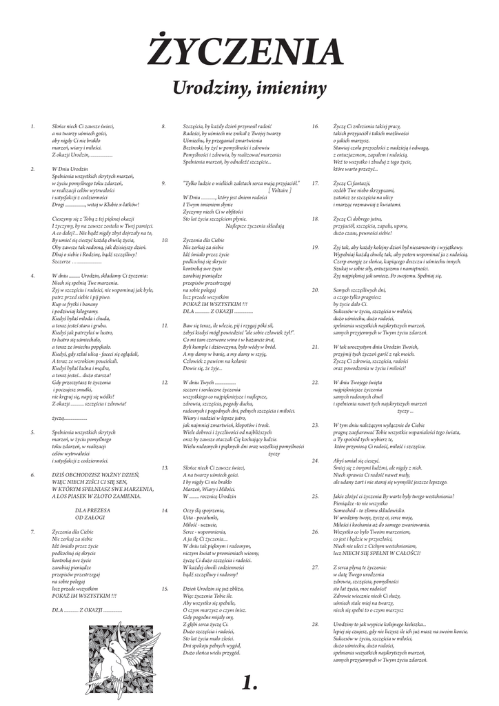 ŻYCZENIA Urodziny, imieniny 1. Słońce niech Ci zawsze świeci, a na twarzy uśmiech gości, aby nigdy Ci nie brakło marzeń, wiary i miłości. Z okazji Urodzin, .................... 2. W Dniu Urodzin Spełnienia wszystkich skrytych marzeń, w życiu pomyślnego toku zdarzeń, w realizacji celów wytrwałości i satysfakcji z codzienności Drogi .................., witaj w Klubie x-latków! Cieszymy się z Tobą z tej pięknej okazji I życzymy, by na zawsze została w Twej pamięci. A co dalej?... Nie bądź nigdy zbyt dojrzały na to, By umieć się cieszyć każdą chwilą życia, Oby zawsze tak radosną, jak dzisiejszy dzień. Dbaj o siebie i Rodzinę, bądź szczęśliwy! Szczerze …...................... 4. W dniu .......... Urodzin, składamy Ci życzenia: Niech się spełnią Twe marzenia. Żyj w szczęściu i radości, nie wspominaj jak było, patrz przed siebie i pij piwo. Kup se frytki i banany i podziwiaj kilogramy. Kiedyś byłaś młoda i chuda, a teraz jesteś stara i gruba. Kiedyś jak patrzyłaś w lustro, to lustro się uśmiechało, a teraz ze śmiechu popękało. Kiedyś, gdy szłaś ulicą - faceci się oglądali, A teraz ze wzrokiem pouciekali. Kiedyś byłaś ładna i mądra, a teraz jesteś... dużo starsza! Gdy przeczytasz te życzenia i poczujesz smutki, nie krępuj się, napij się wódki! Z okazji ............ szczęścia i zdrowia! 8. Szczęścia, by każdy dzień przynosił radość Radości, by uśmiech nie znikał z Twojej twarzy Uśmiechu, by przeganiał zmartwienia Beztroski, by żyć w pomyślności i zdrowiu Pomyślności i zdrowia, by realizować marzenia Spełnienia marzeń, by odnaleźć szczęście... 16. Życzę Ci znlezienia takiej pracy, takich przyjaciół i takich możliwości o jakich marzysz. Stawiaj czoła przyszłości z nadzieją i odwagą, z entuzjazmem, zapałem i radością. Weź to wszystko i zbuduj z tego życie, które warto przeżyć... 9. "Tylko ludzie o wielkich zaletach serca mają przyjaciół." [ Voltaire ] W Dniu ............., który jest dniem radości I Twym imieniem słynie Życzymy niech Ci w obfitości Sto lat życia szczęściem płynie. Najlepsze życzenia składają 17. Życzę Ci fantazji, ozdób Twe niebo skrzypcami, zatańcz ze szczęścia na ulicy i marząc rozmawiaj z kwiatami. 18. Życzę Ci dobrego jutra, przyjaciół, szczęścia, zapału, uporu, dużo czasu, pewności siebie! 19. Żyj tak, aby każdy kolejny dzień był niesamowity i wyjątkowy. Wypełniaj każdą chwilę tak, aby potem wspominać ja z radością. Czerp energię ze słońca, kapiącego deszczu i uśmiechu innych. Szukaj w sobie siły, entuzjazmu i namiętności. Żyj najpiękniej jak umiesz. Po swojemu. Spełniaj się. 20. Samych szczęśliwych dni, a czego tylko pragniesz by życie dało Ci. Sukcesów w życiu, szczęścia w miłości, dużo uśmiechu, dużo radości, spełnienia wszystkich najskrytszych marzeń, samych przyjemnych w Twym życiu zdarzeń. 21. W tak uroczystym dniu Urodzin Twoich, przyjmij tych życzeń garść z rąk moich. Życzę Ci zdrowia, szczęścia, radości oraz powodzenia w życiu i miłości! 22. W dniu Twojego święta najpiękniejsze życzenia samych radosnych chwil i spełnienia nawet tych najskrytszych marzeń życzy ... 23. W tym dniu należącym wyłącznie do Ciebie pragnę zaofiarować Tobie wszystkie wspaniałości tego świata, a Ty spośród tych wybierz te, które przyniosą Ci radość, miłość i szczęście. 24. Abyś umiał się cieszyć. Śmiej się z innymi ludźmi, ale nigdy z nich. Niech sprawia Ci radość nawet mały, ale udany żart i nie staraj się wymyślić jeszcze lepszego. 25. Jakie złożyć ci życzenia By warte były twego westchnienia? Pieniądze -to nie wszystko Samochód - to złomu składowisko. W urodziny twoje, życzę ci, serce moje, Miłości i kochania aż do samego zwariowania. Wszystko co było Twoim marzeniem, co jest i będzie w przyszłości, Niech nie uleci z Cichym westchnieniem, lecz NIECH SIĘ SPEŁNI W CAŁOŚCI! 10. 11. 12. życzą..................... 5. 6. Spełnienia wszystkich skrytych marzeń, w życiu pomyślnego toku zdarzeń, w realizacji celów wytrwałości i satysfakcji z codzienności. DZIŚ OBCHODZISZ WAŻNY DZIEŃ, WIĘC NIECH ZIŚCI CI SIĘ SEN, W KTÓRYM SPEŁNIASZ SWE MARZENIA, A LOS PIASEK W ZŁOTO ZAMIENIA. DLA PREZESA OD ZAŁOGI 7. Życzenia dla Ciebie Nie zerkaj za siebie Idź śmiało przez życie podkochuj się skrycie kontroluj swe życie zarabiaj pieniądze przepisów przestrzegaj na sobie polegaj lecz przede wszystkim POKAŻ IM WSZYSTKIM !!! DLA ............. Z OKAZJI ................. 13. 14. 15. Życzenia dla Ciebie Nie zerkaj za siebie Idź śmiało przez życie podkochuj się skrycie kontroluj swe życie zarabiaj pieniądze przepisów przestrzegaj na sobie polegaj lecz przede wszystkim POKAŻ IM WSZYSTKIM !!! DLA ............. Z OKAZJI ................. Baw się teraz, ile wlezie, pij i rzygaj póki sił, żebyś kiedyś mógł powiedzieć "ale sobie człowiek żył!". Co mi tam czerwone wino i w bażancie śrut, Byli kumple i dziewczyna, było wódy w bród. A my damy w banię, a my damy w szyję, Człowiek z pawiem na kolanie Dowie się, że żyje... W dniu Twych ................... szczere i serdeczne życzenia wszystkiego co najpiękniejsze i najlepsze, zdrowia, szczęścia, pogody ducha, radosnych i pogodnych dni, pełnych szczęścia i miłości. Wiary i nadziei w lepsze jutro, jak najmniej zmartwień, kłopotów i trosk. Wiele dobroci i życzliwości od najbliższych oraz by zawsze otaczali Cię kochający ludzie. Wielu radosnych i pięknych dni oraz wszelkiej pomyślności życzy Słońce niech Ci zawsze świeci, A na twarzy uśmiech gości. I by nigdy Ci nie brakło Marzeń, Wiary i Miłości. W ......... rocznicę Urodzin Oczy ślą spojrzenia, Usta - pocałunki, Miłość - uczucie, Serce - wspomnienia, A ja ślę Ci życzenia.... W dniu tak pięknym i radosnym, niczym kwiat w promieniach wiosny, życzę Ci dużo szc