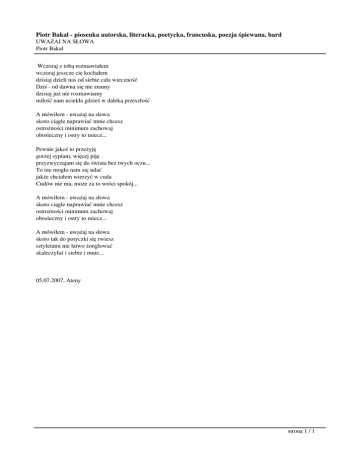 Piotr Bakal - piosenka autorska, literacka, poetycka, francuska, poezja śpiewana, bard UWAŻAJ NA SŁOWA Piotr Bakal Wczoraj z tobą rozmawiałem wczoraj jeszcze cię kochałem dzisiaj dzieli nas od siebie cała wieczność Dziś - od dawna się nie znamy dzisiaj już nie rozmawiamy miłość nam uciekła gdzieś w daleką przeszłość A mówiłem - uważaj na słowa skoro ciągle naprawiać mnie chcesz ostrożności minimum zachowaj obosieczny i ostry to miecz... Pewnie jakoś to przeżyję gorzej sypiam, więcej piję przyzwyczajam się do świata bez twych oczu... To nie mogło nam się udać jakże chciałem wierzyć w cuda Cudów nie ma, może za to wróci spokój... A mówiłem - uważaj na słowa skoro ciągle naprawiać mnie chcesz ostrożności minimum zachowaj obosieczny i ostry to miecz... A mówiłem - uważaj na słowa skoro tak do potyczki się rwiesz sztyletami nie łatwo żonglować skaleczyłaś i siebie i mnie... 05.07.2007, Ateny strona 1 / 1