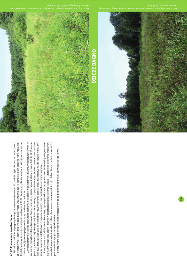 196 6.10.7. Proponowany sposób ochrony Na Łąkach nad Biała występują dwie przeciwstawne tendencje. Wschodnia część obszaru jest użytkowana zbyt intensywnie, zachodnia w ogóle. Łąka świeża w zachodniej części kompleksu jest koszona już w maju. Należałoby opóźnić koszenie co najmniej na termin 1-30.06 i kosić łąkę tylko raz w roku, a najlepiej w terminie po 15.08 ze względu na występowanie na tej powierzchni derkacza. Z drugiej strony należałoby przywrócić użytkowanie obecnie niekoszonych szuwarów wielkoturzycowych w zachodniej części kompleksu łąkowego. Szuwary można wykaszać raz na 3-5 lat w terminie 1.08 do 30.09 w celu powstrzymania sukcesji ekologicznej. Przez pierwsze trzy lata proponowane jest jednak koszenie coroczne (bardzo duża trofia ze względu na wieloletnie nieużytkowanie kośne i ekspansja trzciny). Każde koszenie musi być zawsze połączone z dokładnym zebraniem i usunięciem z powierzchni uzyskanej biomasy. Poza tym we wschodniej części kompleksu łąkowego wskazane jest przeprowadzenie selektywnego usuwania nadmiernej liczby drzew i krzewów zarastających powierzchnie łąkowe – szczególnie usuwanie większych, zwartych powierzchni młodych roślin z uformowaniem odpowiednich dla ptaków kęp krzewów i zadrzewień i pozostawieniem pojedynczych krzewów. Bardzo ważne jest powstrzymanie nieuzasadnionego pogłębiania i hakowania Rzymkowickiego Rowu. 197 DZICZE BAGNO Fot. 62. Łąki w kompleksie łąkowym Dzicze Bagno zdominowane są przez nawłoć wąskolistną Solidago graminifolia; (fot. M. Rudy). Fot. 63. Łąka wilgotna przy stawie Pietruszka, z dużym udziałem tawuły kutnerowatej Spiraea tomentosa; (fot. M. Rudy). 198 6.11.4. Bezkręgowce Na łąkach nie wykazano obecności gatunków bezkręgowców objętych ochroną, nie wykazano również występowania roślin żywicielskich najpopularniejszych gatunków motyli stwierdzanych na innych łąkach Borów Niemodlińskich (krwiściąg lekarski, szczaw lancetowaty). 6.11.3. Cenne gatunki roślin Nie stwierdzono obecności gatunków chronionych ani rzadkich. 6.11.2. Siedliska z I załącznika Dyrektywy Siedliskowej Stwierdzono występowanie siedlisk: łąki zmiennowilgotne Molinion (kod 6410) oraz górskie i niżowe łąki świeże użytkowane ekstensywnie o kodzie 6510, w złym stanie zachowania. Niewielką powierzchnię zajmuje siedlisko 7140 (Torfowiska przejściowe i trzęsawiska). 6.11.1. Zbiorowiska roślinne Największy zachowany teren otwarty znajduje się na północ od użytku ekologicznego ,,Dzicze Bagno’’ i składa się z dwóch fragmentów – mniejszego (powierzchnia B) i większego (powierzchnia A), oddzielonych pasem lasu. Podłoże jest tu wilgotne, a poziom wody gruntowej jest wyższy w południowej części oraz przy rowie na północy. Rowy przylegające do siedliska są zamulone i zarośnięte. Roślinność to mozaika łąki wilgotnej oraz szuwarów wielkoturzycowych. Obecne są tu, takie gatunki jak: turzyca zaostrzona Carex gracilis, turzyca błotna Carex acutiformis, tojeść pospolita Lysimachia vulgaris, sitowie leśne Scirpus sylvaticus, krwawnik kichawiec Achillea ptarmica, sit skupiony Juncus conglomeratus, kłosówka wełnista Holcus lanatus, śmiałek darniowy Deschampsia caespitosa, olszewnik kminkolistny Selinum carvifolia. W centralnej części (powierzchnia A) podłoże jest mniej wilgotne i pojawiają się, takie gatunki łąki świeżej jak: rajgras wyniosły Arrhenatherus elatior, tymotka łąkowa Phleum pratense, chaber łąkowy Centaurea jacea. Podobny skład gatunkowy występuje na mniejszym, zachodnim fragmencie, z tym że większy udział ma tu olszewnik kminkolistny Selinum carvifolia, sit skupiony Juncus conglomeratus, pojawia się trzęślica modra Molinia caerulea i ostrożeń błotny Cirsium palustre. Jednak gatunkiem dominującym na całej powierzchni (z tym, że we fragmencie zachodnim w nieco mniejszym stopniu) jest nawłoć wąskolistna Solidago graminifolia. Jej dominacja zubaża strukturę roślinności i utrudnia identyfikację fitosocjologiczną zbiorowiska. Na terenie bezpośrednio przylegającym do stawu Loża znajduje się podmokły teren z mozaiką szuwarów trzcinowych i wielkoturzycowych (powierzchnia H). Znajduje się tu też torfowisko (powierzchnia G) z wełnianką wąskolistną Eriophorum angustifolium. Na drugiej powierzchni, położonej bliżej stawu Pietruszka, zachowały się niewielkie fragmenty siedliska łąkowego. Pozostała część rozległego niegdyś kompleksu została w ostatnich kilkunastu latach zalesiona. Na części łąk zalesionych w ostatnich latach siedlisko łąkowe jeszcze się utrzymuje (powierzchnia C), jest jednak w bardzo złym stanie ze względu na zabiegi przygotowujące teren do zalesienia (bruzdy) oraz obecność gatunków inwazyjnych. Poziom wody gruntowej na całym obszarze jest wysoki. Na terenie najbardziej podmokłym, otoczonym starym drzewostanem (powierzchnia D) występuje szuwar trzcinowy, który podczas inwentaryzacji był skoszony. Przy południowej granicy kompleksu (powierzchnia E) występuje natomiast fragment zalesionej świerkami (obecnie wysokości ok. 1,5 m) łąki zmiennowilgotnej z trzęślicą modrą Molinia caerulea i olszewnikiem kminkolistnym Selinum carvifolia. Przechodzi ona w eutroficzną łąkę wilgotną (powierzchnie F) z dominacją sitowia leśnego oraz domieszką, takich gatunków jak: trzęślica modra, gorysz błotny Peucedanum palustre, ostrożeń błotny Cirsium palustre, karbieniec pospolity Lycopus europaeus, mozga trzcinowata oraz trzcina pospolita Phragmites australis. Duży udział mają też gatunki inwazyjne obcego pochodzenia – nawłoć wąskolistna Solidago graminifolia, nawłoć kanadyjska S. canadensis, nawłoć późna S. gigantea, uczep amerykański Bidens frondosa oraz tawuła kutnerowata Spiraea tomentosa, która przy południowej granicy z rowem tworzy zwarte skupisko. Śródleśny kompleks łąk położony na półno