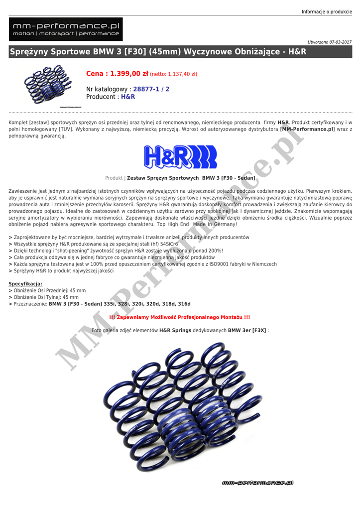 Informacje o produkcie Utworzono 07-03-2017 Sprężyny Sportowe BMW 3 [F30] (45mm) Wyczynowe Obniżające - H&R Cena : 1.399,00 zł (netto: 1.137,40 zł) Nr katalogowy : 28877-1 / 2 Producent : H&R ce .p l Komplet [zestaw] sportowych sprężyn osi przedniej oraz tylnej od renomowanego, niemieckiego producenta firmy H&R. Produkt certyfikowany i w pełni homologowany [TUV]. Wykonany z najwyższą, niemiecką precyzją. Wprost od autoryzowanego dystrybutora [MM-Performance.pl] wraz z pełnoprawną gwarancją. Produkt | Zestaw Sprężyn Sportowych BMW 3 [F30 - Sedan] fo Zaprojektowane by być mocniejsze, bardziej wytrzymałe i trwalsze aniżeli produkty innych producentów Wszystkie sprężyny H&R produkowane są ze specjalnej stali (hf) 54SiCr6 Dzięki technologii "shot-peening" żywotność sprężyn H&R zostaje wydłużona o ponad 200%! Cała produkcja odbywa się w jednej fabryce co gwarantuje niezmienną jakość produktów Każda sprężyna testowana jest w 100% przed opuszczeniem certyfikowanej zgodnie z ISO9001 fabryki w Niemczech Sprężyny H&R to produkt najwyższej jakości er > > > > > > rm an Zawieszenie jest jednym z najbardziej istotnych czynników wpływających na użyteczność pojazdu podczas codziennego użytku. Pierwszym krokiem, aby je usprawnić jest naturalnie wymiana seryjnych sprężyn na sprężyny sportowe / wyczynowe. Taka wymiana gwarantuje natychmiastową poprawę prowadzenia auta i zmniejszenie przechyłów karoserii. Sprężyny H&R gwarantują doskonały komfort prowadzenia i zwiększają zaufanie kierowcy do prowadzonego pojazdu. Idealne do zastosowań w codziennym użytku zarówno przy spokojnej jak i dynamicznej jeździe. Znakomicie wspomagają seryjne amortyzatory w wybieraniu nierówności. Zapewniają doskonałe właściwości jezdne dzięki obniżeniu środka ciężkości. Wizualnie poprzez obniżenie pojazd nabiera agresywnie sportowego charakteru. Top High End Made In Germany! -P Specyfikacja: > Obniżenie Osi Przedniej: 45 mm > Obniżenie Osi Tylnej: 45 mm > Przeznaczenie: BMW 3 [F30 - Sedan] 335i, 328i, 320i, 320d, 318d, 316d M M !!! Zapewniamy Możliwość Profesjonalnego Montażu !!! Foto galeria zdjęć elementów H&R Springs dedykowanych BMW 3er [F3X] : l ce .p an rm fo er -P M M M M -P er fo rm an ce .p l Informacje o produkcie l ce .p an rm fo er -P M M ce .p l Informacje o produkcie M M -P er fo rm an Prawo autorskie (copyright) - wszelkie tłumaczenia są własnością intelektualną MM-Performance.pl. Wykorzystywanie bez zgody właściciela zabronione!
