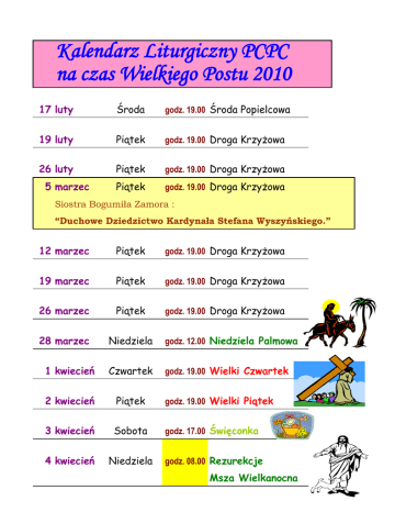 Kalendarz Liturgiczny PCPC na czas Wielkiego Postu 2010 17 luty Środa godz. 19.00 Środa Popielcowa 19 luty Piątek godz. 19.00 Droga Krzyżowa 26 luty Piątek godz. 19.00 Droga Krzyżowa Piątek godz. 19.00 Droga Krzyżowa 5 marzec Siostra Bogumiła Zamora : “Duchowe Dziedzictwo Kardynała Stefana Wyszyńskiego.” 12 marzec Piątek godz. 19.00 Droga Krzyżowa 19 marzec Piątek godz. 19.00 Droga Krzyżowa 26 marzec Piątek godz. 19.00 Droga Krzyżowa 28 marzec Niedziela godz. 12.00 Niedziela Palmowa 1 kwiecień Czwartek godz. 19.00 Wielki Czwartek 2 kwiecień Piątek godz. 19.00 Wielki Piątek 3 kwiecień Sobota godz. 17.00 Święconka 4 kwiecień Niedziela godz. 08.00 Rezurekcje Msza Wielkanocna