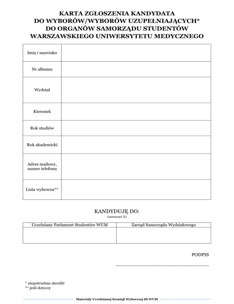 KARTA ZGŁOSZENIA KANDYDATA DO WYBORÓW/WYBORÓW UZUPEŁNIAJĄCYCH* DO ORGANÓW SAMORZĄDU STUDENTÓW WARSZAWSKIEGO UNIWERSYTETU MEDYCZNEGO Imię i nazwisko Nr albumu Wydział Kierunek Rok studiów Rok akademicki Adres mailowy, numer telefonu Lista wyborcza** KANDYDUJĘ DO: (zaznaczyć X) Uczelniany Parlament Studentów WUM Zarząd Samorządu Wydziałowego PODPIS ……………………………………………………… * niepotrzebne skreślić ** jeśli dotyczy Materiały Uczelnianej Komisji Wyborczej SS WUM