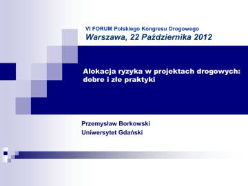 VI FORUM Polskiego Kongresu Drogowego Warszawa, 22 Października 2012 Alokacja ryzyka w projektach drogowych: dobre i złe praktyki Przemysław Borkowski Uniwersytet Gdański Alokacji ryzyka w projektach infrastrukturalnych Ryzyko jest jednym z kluczowych czynników determinujących powodzenie projektów inwestycyjnych. W projektach o dużej skali (a do takich należą inwestycje w infrastrukturę transportu) ryzyko dotyczy znacznych środków finansowych. Właściwa alokacja ryzyka prowadzi do wzrostu racjonalności inwestycji infrastrukturalnych i redukcji nakładów. Dr Przemysław Borkowski Alokacja ryzyka w projektach drogowych: dobre i złe praktyki Zasady alokacji ryzyka (idealistyczne) Ryzyko przejmuje strona, która może oddziaływać na czynniki generujące ryzyko; Ryzyko przejmuje strona, która może wpływać na skutki ryzyka (ograniczać je); Ryzyko przejmuje strona, która jest w stanie ponieść skutki ryzyka. Dr Przemysław Borkowski Alokacja ryzyka w projektach drogowych: dobre i złe praktyki Optymalna alokacja ryzyka (praktyka) Ograniczenia zleceniodawcy (projekt) wykonalny (ze względu na ograniczenia fizyczne, prawne lub finansowe), mieści się w wyznaczonym budżecie, realizowany w wyznaczonych ramach czasowych, zaspokaja potrzeby użytkowników końcowych, spełnia kryteria techniczne i jakościowe. Ograniczenia wykonawcy zapłacono w terminie - za zrealizowane zadania, wymóg realizacji projektu zgodnie z harmonogramem i w ramach planu rzeczowo-finansowego, konieczność właściwego administrowania kontraktem, uniknięcie odpowiedzialności wobec stron trzecich (która może powstać w trakcie realizacji projektu, np. na skutek wypadków), unikniecie odpowiedzialności wobec zleceniodawcy wykraczającej poza zapisy kontraktowe (np. na skutek nie zachowania jakości). Dr Przemysław Borkowski Alokacja ryzyka w projektach drogowych: dobre i złe praktyki Złe praktyki - wyniki badań, próba 32 inwestycji drogowych ryzyko nie jest przejmowane przez stronę najlepiej przygotowana do zarządzania nim (mniej niż 30% przypadków przejęcia ryzyka przez taką stronę), zapisy w odniesieniu do przejmowania ryzyka zazwyczaj są niestandardowe i zmieniają wypracowane zwyczajowe reguły, dając większe przywileje stronie o silniejszej pozycji przetargowej, ryzyko często jest transferowane na podwykonawców a nawet konsultantów w projektach – w zakresie, w którym nie mogą realistycznie nim zarządzać, koszty zarządzania ryzykiem nie są uwzględniane w przetargach, nie uwzględnia się problemu zmienności skali ryzyka w trakcie realizacji wieloletnich projektów inwestycyjnych i nie podejmuje się zmiany jego alokacji, jeśli podejmowane są takie próby, zazwyczaj wywołują długotrwałe spory, często rozstrzygane dopiero na drodze sądowej. Dr Przemysław Borkowski Alokacja ryzyka w projektach drogowych: dobre i złe praktyki Dobre praktyki (1) Faza projektu Rodzaj ryzyka Alokacja Projektowanie Nieefektywny projekt Projektant Specyfikacja przetargu Władze publiczne Warunki miejsca budowy Wykonawca Przygotowanie miejsca budowy Wykonawca Pozyskanie gruntów pod budowę Władze publiczne Przekroczenie kosztów Wykonawca Opóźnienie Niewystarczająca jakość Wspólnie Wykonawca / Projektant Niedogodność dla otoczenia Wykonawca Przedrealizacyjna Budowa Dr Przemysław Borkowski Alokacja ryzyka w projektach drogowych: dobre i złe praktyki Dobre praktyki (2) Faza projektu Rodzaj ryzyka Alokacja Operacyjna Wzrost kosztów operacyjnych Operator infrastruktury / władze publiczne Przerwy i opóźnienia w dostępie do Operator infrastruktury / władze publiczne infrastruktury W sposób ciągły Generowane przez PPP Niewystarczająca jakość Operator infrastruktury / wykonawca/ inwestor Niewystarczające przychody Inwestor / operator infrastruktury Siła wyższa Ryzyko polityczne Wspólnie Władze publiczne, Ubezpieczyciel inwestycji Zaprzestanie realizacji projektu Dawcy kapitału Spadek wartości infrastruktury Operator / władze publiczne Inflacja Władze publiczne / inwestor Niewłaściwa koordynacja organizacja i Władze publiczne / wykonawca / społeczeństwo Dr Przemysław Borkowski Alokacja ryzyka w projektach drogowych: dobre i złe praktyki Wniosek Kooperacyjna Alokacja ryzyka powinna być: Niestety często jest: Konkurencyjna Dr Przemysław Borkowski Alokacja ryzyka w projektach drogowych: dobre i złe praktyki Jakie możliwości daje FIDIC? (I) Walutowe Właściciel ryzyka (ZMożliwość zgłaszania roszczeń Klauzula decydująca (FIDIC zamawiający, W – wykonawca) w przypadku nadmiernego wersja 2005) ryzyka (T- tak występuje, N – brak możliwości, jeśli wspólnie oznacza to możliwość jedynie częściowego roszczenia) Z T 8.4. Przedłużenie czasu na ukończenie Z (w wersji czerwonej T 13.7. Korekty wynikające ze wykonawca nie może domagać zmian stanu prawnego się zmian jeśli już zgłosił roszczenia co do kosztów) Z T 14.15 Waluty Cenowe wspólnie T Konieczności przeprowadzenia Z prac archeologicznych Środowiskowe wspólnie Protestów grup nacisku Z T 13.8. Korekty wynikające ze zmian kosztu 4.24. Wykopaliska wspólnie T 4.18. Ochrona środowiska 4.18. Ochrona środowiska Zapewnienia miejsca budowy T 2.1. Prawo dostępu do placu budowy Ryzyko Terminowość Prawne Z Dr Przemysław Borkowski Alokacja ryzyka w projektach drogowych: dobre i złe praktyki Jakie możliwości daje FIDIC? (II) Ryzyko Właściciel ryzyka (Zzamawiający, W– wykonawca) Siła wyższa Z Wojna Z Strajk Z Niejasności w dokumentacji wspólnie Opóźnienia dokumentacji Z/W technicznej Jakość dokumentacji Z/W Dodatkowe prace Z/W Możliwość zgłaszania roszczeń w Klauzula decydująca (FIDIC wersja 2005) przypadku nadmiernego ryzyka (T- tak występuje, N – brak możliwości, jeśli wspólnie oznacza to możliwość jedynie częściowego roszczenia) T 19.4. Następstwa Siły Wyższej 19.6. Odstąpienie według uznania, płatność i zwolnienie T 17.3. Zagro