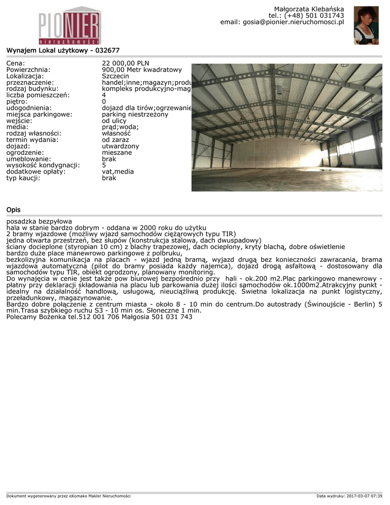 Małgorzata Klebańska tel.: (+48) 501 031743 email: [email protected] Wynajem Lokal użytkowy - 032677 Cena: Powierzchnia: Lokalizacja: przeznaczenie: rodzaj budynku: liczba pomieszczeń: piętro: udogodnienia: miejsca parkingowe: wejście: media: rodzaj własności: termin wydania: dojazd: ogrodzenie: umeblowanie: wysokość kondygnacji: dodatkowe opłaty: typ kaucji: 22 000,00 PLN 900,00 Metr kwadratowy Szczecin handel;inne;magazyn;produkcja;usługi;warsztat; kompleks produkcyjno-magazynowy 4 0 dojazd dla tirów;ogrzewanie;plac manewrowy;plac utwardzony;posadzka parking niestrzeżony od ulicy prąd;woda; własność od zaraz utwardzony mieszane brak 5 vat,media brak Opis posadzka bezpyłowa hala w stanie bardzo dobrym - oddana w 2000 roku do użytku 2 bramy wjazdowe (możliwy wjazd samochodów ciężąrowych typu TIR) jedna otwarta przestrzeń, bez słupów (konstrukcja stalowa, dach dwuspadowy) ściany docieplone (styropian 10 cm) z blachy trapezowej, dach ocieplony, kryty blachą, dobre oświetlenie bardzo duże place manewrowo parkingowe z polbruku, bezkolizyjna komunikacja na placach - wjazd jedną bramą, wyjazd drugą bez konieczności zawracania, brama wjazdowa automatyczna (pilot do bramy posiada każdy najemca), dojazd drogą asfaltową - dostosowany dla samochodów typu TIR, obiekt ogrodzony, planowany monitoring. Do wynajęcia w cenie jest także pow biurowej bezpośrednio przy hali - ok.200 m2.Plac parkingowo manewrowy płatny przy deklaracji składowania na placu lub parkowania dużej ilości samochodów ok.1000m2.Atrakcyjny punkt idealny na działalność handlową, usługową, nieuciążliwą produkcję. Świetna lokalizacja na punkt logistyczny, przeładunkowy, magazynowanie. Bardzo dobre połączenie z centrum miasta - około 8 - 10 min do centrum.Do autostrady (Świnoujście - Berlin) 5 min.Trasa szybkiego ruchu S3 - 10 min os. Słoneczne 1 min. Polecamy Bożenka tel.512 001 706 Małgosia 501 031 743 Dokument wygenerowany przez eKomako Makler Nieruchomości Data wydruku: 2017-03-07 07:39