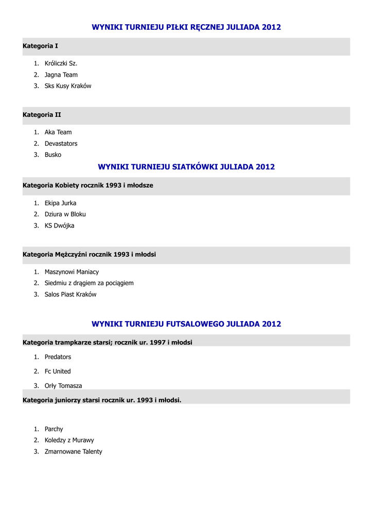 WYNIKI TURNIEJU PIŁKI RĘCZNEJ JULIADA 2012 Kategoria I 1. Króliczki Sz. 2. Jagna Team 3. Sks Kusy Kraków Kategoria II 1. Aka Team 2. Devastators 3. Busko WYNIKI TURNIEJU SIATKÓWKI JULIADA 2012 Kategoria Kobiety rocznik 1993 i młodsze 1. Ekipa Jurka 2. Dziura w Bloku 3. KS Dwójka Kategoria Mężczyźni rocznik 1993 i młodsi 1. Maszynowi Maniacy 2. Siedmiu z drągiem za pociągiem 3. Salos Piast Kraków WYNIKI TURNIEJU FUTSALOWEGO JULIADA 2012 Kategoria trampkarze starsi; rocznik ur. 1997 i młodsi 1. Predators 2. Fc United 3. Orły Tomasza Kategoria juniorzy starsi rocznik ur. 1993 i młodsi. 1. Parchy 2. Koledzy z Murawy 3. Zmarnowane Talenty WYNIKI TURNIEJU STREETBALLA JULIADA 2012 Amatorzy do 15 roku życia ( 1997 i młodsi) 1. Bad Boys 2. Przemki 3. Basket Amatorzy do 16-18 lat (1994 -1996) 1. Pachoły 2. Team Skarżysko 3. RKS… Amatorzy 19-21 lat ( 1991-1993) 1. Z czym, do czego 2. Śpiewające fortepiany 3. Buzzer Beaters Amatorzy 22 lata i starsi ( 1990 i starsi) 1. Łigizyl Nizgizyl 2. Dusiciele Obręczy 3. Wild Cat Amatorzy kobiety 1. Jagódki 2. Poziomki 3. Pamarańczki Zawodowcy kobiety 1. Kindzej 2. Cziki 3. Słoneczny Patrol Zawodowcy pełnoletni (1994 i starsi) 1. Synki 2. Weldo 3. Terror Sport Zawodowcy niepełnoletni (1995 i młodsi) 1. Przedszkole 2. Boston Go 3. BBNS WYNIKI TURNIEJU TENISA STOŁOWEGO JULIADA 2012 Dziewczynki 1996-1998 1. Alicja Śliwa Dziewczynki 1993-1995 1. Natalia Kostrzewa 2. Katarzyna Parvi Chłopcy 1999 i młodsi 1. Krzysztof Kapik 2. Krzysztof Petka 3. Jacek Zając Chłopcy 1996-1998 1. Jakub Żukrowski 2. Krystian Soroczko 3. Jakub Jankowicz Chłopcy 1993-1995 1. Tomasz Stankiewicz 2. Tadeusz Hamuda 3. Piotr Hnatów Turniej open dziewcząt i chłopców 1993-1995 1. Alicja Śliwa 2. Tomasz Stankiewicz 3. Natalia Kostrzewa WYNIKI TURNIEJU BADMINTONA JULIADA 2012 Dziewczynki 1999 i młodsze 1. Nowak Weronika 2. Dudzic Wiktoria 3. Wrońska Marta 4. Gruszczyńska Stasia Chłopcy 1999 i młodsi 1. Bryg Simone 2. Lesiak Tomasz 3. Kutyła Jakub 4. Piec Ernest Chłopcy 1996 – 1998 1. Kabat Mariusz 2. Wadowski Maciej 3. Turski Bartosz 4. Imielski Jakub Dziewczyny 1996 1. Jaworska Emilia 2. Jankovic Emilia 3. Paprocka Karolina 4. Opioła Karolina Chłopcy 1993 – 1995 1. Kalitka Marcin 2. Siępak Paweł 3. Sołtys Jakub 4. Krzyczewski Łukasz Debel Dziewczyn -Open 1. Jaworska Emilia/Jankovic Emilia 2. Dudzic Wiktoria/Nowak Weronika 3. Gruszczyńska Stasia/Wrońska Marta Opioła Karolina/Korta Katarzyna Debel Chłopców – Open 1. Kabat Mariusz/Kalitka Marcin 2. Siępak Paweł/Sołtys Jakub 3. Wadowski Maciej/Kutyła Kamil WYNIKI TURNIEJU BREAKDANCE KONTROLA STYLU JULIADA 2012 Kategoria solowa Thomas Kategoria zespołowa RockaFellaz Crew