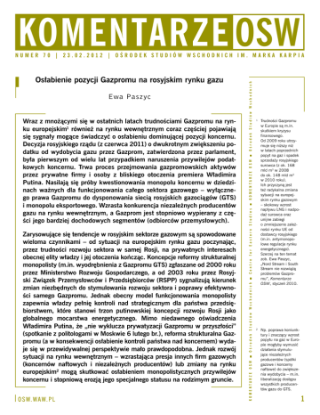 Komentarze osw O S W. W A W. P L S t u d i ó w Trudności Gazpromu w Europie są m.in. skutkiem kryzysu finansowego. Od 2009 roku utrzymuje się niższy niż w latach poprzednich popyt na gaz i spadek sprzedaży rosyjskiego surowca (z ok. 168 mld m3 w 2008 do ok. 148 mld m3 w 2010 roku). Ich przyczyną jest też radykalna zmiana sytuacji na europejskim rynku gazowym – skokowy wzrost napływu LNG i nadpodaż surowca oraz unijne zabiegi o zmniejszenie zależności rynku UE od dostawcy rosyjskiego (m.in. antymonopolowe regulacje rynku energetycznego). Szerzej na ten temat zob. Ewa Paszyc, „Nord Stream i South Stream nie rozwiążą problemów Gazpromu”, Komentarze OSW, styczeń 2010. 2 Np. poprawa koniunktury i znaczący wzrost popytu na gaz w Europie mogłyby wymusić działania stymulujące niezależnych producentów (spółki gazowe i koncerny naftowe) do zwiększenia wydobycia – m.in. liberalizację dostępu wszystkich producentów gazu do GTS. C e n t r e f o r E a s t e r n S t u d i e s K OMENTARZE OSW O ś r o d e k 1 Ws c h o d n i c h S t u d i ó w Zarysowujące się tendencje w rosyjskim sektorze gazowym są spowodowane wieloma czynnikami – od sytuacji na europejskim rynku gazu poczynając, przez trudności rozwoju sektora w samej Rosji, na prywatnych interesach obecnej elity władzy i jej otoczenia kończąc. Koncepcje reformy strukturalnej monopolisty (m.in. wyodrębnienia z Gazpromu GTS) zgłaszane od 2000 roku przez Ministerstwo Rozwoju Gospodarczego, a od 2003 roku przez Rosyjski Związek Przemysłowców i Przedsiębiorców (RSPP) sygnalizują kierunek zmian niezbędnych do stymulowania rozwoju sektora i poprawy efektywności samego Gazpromu. Jednak obecny model funkcjonowania monopolisty zapewnia władzy pełnię kontroli nad strategicznym dla państwa przedsiębiorstwem, które stanowi trzon putinowskiej koncepcji rozwoju Rosji jako globalnego mocarstwa energetycznego. Mimo niedawnego oświadczenia Władimira Putina, że „nie wyklucza prywatyzacji Gazpromu w przyszłości” (spotkanie z politologami w Moskwie 6 lutego br.), reforma strukturalna Gazpromu (a w konsekwencji osłabienie kontroli państwa nad koncernem) wydaje się w przewidywalnej perspektywie mało prawdopodobna. Jednak rozwój sytuacji na rynku wewnętrznym – wzrastająca presja innych firm gazowych (koncernów naftowych i niezależnych producentów) lub zmiany na rynku europejskim2 mogą skutkować osłabieniem monopolistycznych przywilejów koncernu i stopniową erozją jego specjalnego statusu na rodzimym gruncie. O ś r o d e k Wraz z mnożącymi się w ostatnich latach trudnościami Gazpromu na rynku europejskim1 również na rynku wewnętrznym coraz częściej pojawiają się sygnały mogące świadczyć o osłabieniu dominującej pozycji koncernu. Decyzja rosyjskiego rządu (z czerwca 2011) o dwukrotnym zwiększeniu podatku od wydobycia gazu przez Gazprom, zatwierdzona przez parlament, była pierwszym od wielu lat przypadkiem naruszenia przywilejów podatkowych koncernu. Trwa proces przejmowania gazpromowskich aktywów przez prywatne firmy i osoby z bliskiego otoczenia premiera Władimira Putina. Nasilają się próby kwestionowania monopolu koncernu w dziedzinach ważnych dla funkcjonowania całego sektora gazowego – wyłącznego prawa Gazpromu do dysponowania siecią rosyjskich gazociągów (GTS) i monopolu eksportowego. Wzrasta konkurencja niezależnych producentów gazu na rynku wewnętrznym, a Gazprom jest stopniowo wypierany z części jego bardziej dochodowych segmentów (odbiorców przemysłowych). OSW Ewa Paszyc K OMENTARZE Osłabienie pozycji Gazpromu na rosyjskim rynku gazu Ws c h o d n i c h numer 70 | 23.02.2012 | ośrodek studiów wschodnich im. marka karpia 1 Komentarze osw n u m e r 7 0 | 2 3 . 0 2 . 2 0 1 2 | o ś r o d e k s t u d i ó w w s c h o d n i c h i m . m a r ka ka r p i a Putinowscy oligarchowie – nowa odsłona redystrybucji gazpromowskich aktywów W 2001 roku Aleksiej Miller – nowo mianowany przez prezydenta Putina prezes zarządu Gazpromu – rozpoczął urzędowanie od spektakularnej kampanii na rzecz odzyskiwania gazpromowskich aktywów, które w latach 90. weszły w posiadanie prywatnych firm i osób powiązanych z jego poprzednikiem – wieloletnim szefem koncernu Remem Wiachiriewem. Największemu beneficjentowi rozdawnictwa gazpromowskich aktywów – kompanii Itera – odebrano przekazane jej za bezcen koncesje, firmy lub udziały w firmach wydobywczych koncernu (Rospan, Siewiernieftiegazprom, Purgaz, Sibnieftiegaz i in.). Gazprom odzyskał utraconą za Wiachiriewa kontrolę nad Siburem – największym w Rosji holdingiem chemicznym oraz nad Strojtransgazem – przedsiębiorstwem zajmującym się budową gazociągów, którego znaczne pakiety przeszły na własność krewnych b. szefów (m.in. Wiachiriewa) i politycznych protektorów koncernu3. Zgodnie z logiką redystrybucji własności, praktykowaną przez kolejne ekipy kremlowskie, po objęciu prezydentury przez Władimira Putina odzyskane aktywa Gazpromu, a także wiele innych zaczęli przejmować ludzie nowej władzy. Najcenniejsze aktywa przypadły w udziale przyjaciołom, współpracownikom bądź partnerom biznesowym Putina Najcenniejsze aktywa przypadły z okresu pracy w petersburskim merostwie w udziale przyjaciołom, współpralub jego dawnym kolegom z okresu służcownikom bądź partnerom biznesoby w KGB. Nieco skromniejsze – krewnym wym Putina z okresu pracy w petersi znajomym osób zbliżonych do władzy burskim merostwie lub jego dawnym i nowego gazpromowskiego kierownictwa. kolegom z okresu służby w KGB. Od podziału własności koncernu w latach 90. obecną jego fazę różni zwielokrotniona skala tego procesu, który rozwinął się w okresie drugiej prezydenckiej kadencji Putina, przyspieszył w jej ostatnich miesiącach i trwa do dziś. Niektóre z kontrowersyjnych transakcji przeprowadzono na bezpośrednie polecenie Władimira Putina (np. sprzedaż za bezcen spółki