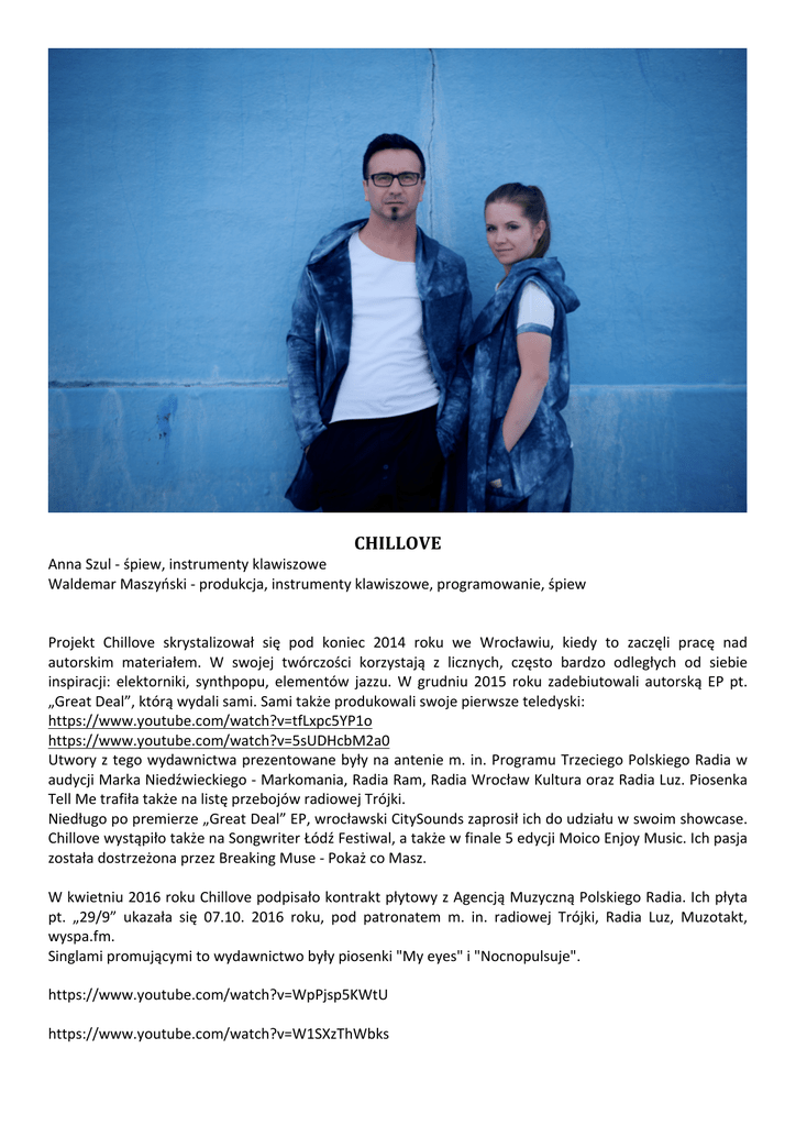 CHILLOVE Anna Szul -‐ śpiew, instrumenty klawiszowe Waldemar Maszyński -‐ produkcja, instrumenty klawiszowe, programowanie, śpiew Projekt Chillove skrystalizował się pod koniec 2014 roku we Wrocławiu, kiedy to zaczęli pracę nad autorskim materiałem. W swojej twórczości korzystają z licznych, często bardzo odległych od siebie inspiracji: elektorniki, synthpopu, elementów jazzu. W grudniu 2015 roku zadebiutowali autorską EP pt. „Great Deal”, którą wydali sami. Sami także produkowali swoje pierwsze teledyski: https://www.youtube.com/watch?v=tfLxpc5YP1o https://www.youtube.com/watch?v=5sUDHcbM2a0 Utwory z tego wydawnictwa prezentowane były na antenie m. in. Programu Trzeciego Polskiego Radia w audycji Marka Niedźwieckiego -‐ Markomania, Radia Ram, Radia Wrocław Kultura oraz Radia Luz. Piosenka Tell Me trafiła także na listę przebojów radiowej Trójki. Niedługo po premierze „Great Deal” EP, wrocławski CitySounds zaprosił ich do udziału w swoim showcase. Chillove wystąpiło także na Songwriter Łódź Festiwal, a także w finale 5 edycji Moico Enjoy Music. Ich pasja została dostrzeżona przez Breaking Muse -‐ Pokaż co Masz. W kwietniu 2016 roku Chillove podpisało kontrakt płytowy z Agencją Muzyczną Polskiego Radia. Ich płyta pt. „29/9” ukazała się 07.10. 2016 roku, pod patronatem m. in. radiowej Trójki, Radia Luz, Muzotakt, wyspa.fm. Singlami promującymi to wydawnictwo były piosenki "My eyes" i "Nocnopulsuje". https://www.youtube.com/watch?v=WpPjsp5KWtU https://www.youtube.com/watch?v=W1SXzThWbks Jesienią 2016 roku Chillove rozpoczęło aktywną działalność koncertową. Ich utwory z płyty "29/9" były i są grane przez wiele stacji radiowych: Trójka, Czwórka, Radio Luz, Radio Ram, Radio Białystok, Radio Kraków, Radio Łódź. Strona internetowa a z niej odnośniki na portale społecznościowe: www.chillove.pl Kontakt: [email protected]