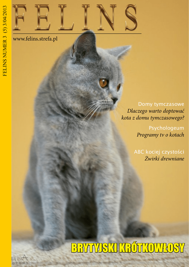FELINS NUMER 3 (5) 3/04/2013 www.felins.strefa.pl Domy tymczasowe Dlaczego warto doptować kota z domu tymczasowego? Psychologeum Programy tv o kotach ABC kociej czystości Żwirki drewniane BRYTYJSKI KRÓTKOWŁOSY Polub Nas na facebook’u! Słowo od redakcji Witajcie po dwumiesięcznej przerwie! Zima dalej w pełni, a więc wskazówki jak pomagać dziko żyjącym kotom są nadal aktualne. Wiosna zrobiła psikusa i jakoś nie chce nadejść. Koty w desperacji gubią sierść, ale jakoś tej wiosny nie widać... Numer kwietniowy będzie dość obszerny ze względu na dwumiesięczną przerwę jaką zafundowałam pismu. Niestety ze względu na studenckie obowiązki musiałam wybrać “mniejsze zło”. Ale mam nadzieję, że duża ilość newsów i ciekawostek w tym numerze będzie odpowiednim zadośćuczynieniem dla Was. W numerze dzięki uprzejmości kolejnej hodowli możemy zaprezentować kota brytyjskiego krótkowłoswego w standardzie FIFe. Zapraszamy do lektury! Redakcja: Założyciel: Justyna Królak Stała współpraca: Marta Rudzińska Monika Krupa Weronika Wrońska Strona www: www.felins.strefa.pl Kontakt mail: [email protected] [email protected] Fanpage: www.facebook.com /felinsmagazyn Pozdrawiam serdecznie Justyna Królak redaktor naczelna Dostępne numery: (kliknij by otworzyć) FELINS NUMER 1 (4) 6.01.2013 FELINS NUMER 3 (3) 1.12.2012 FELINS NUMER 2 (2) 1.11.2012 FELINS NUMER 1 (1) 1.10.2012 WWW.FELINS.STREFA.PL SPIS TREŚĆI Kocie ABC Na wstępie 4 Koci świat Newsy i ciekawostki 8 Temat numeru Dlaczego warto adoptować kota z takiego miejsca? 18 Cztery Pory Roku Jak przekonać administrację osiedla do... miejskich kotów? 20 Raport z Polski “Kocia strefa” w Gdańsku i nie tylko... Część I 24 Co kot powinien jeść? Choroby wywołane nieprawidłowym żywieniem 28 Kocie ABC Żwirki drewniane 32 Kącik pielęgnacyjny Pudrowanie - co i jak? Kocia arystokracja 34 Wystawy od kuchni Umaszczenia i kody EMS 38 Charakterystyka ras Brytyjski Krótkowłosy Ciekawostki i nie tylko 44 Psychologeum Wiedza o kotach - skąd ją czerpać? Programy tv, internet 48 Koty na świecie Kocie kawiarnie 50 Opowiadanie Rozdział II Chcesz podzielić się opinią o konkretnym artykule zamieszczonym w naszym magazynie? Jeśli tak to zapraszamy do kontaktu mailowego. Napisz swoje zdanie, a my je opublikujemy! Kontakt Mailowy: [email protected] Czytelnicy piszą Komentarz do artykułu “Kot i pies w jednym domu” Psy były u mnie od zawsze, a koty pojawiły się z czasem. Kiedy oszczeniła się moja suka hodowlana Windu zostałam poproszona o wzięcie dwóch małych, kocich osesków w wieku 1,5 tygodnia. Bez mleka nie miały szans przeżyć - dostawiłam je do mojej karmiącej suki i o dziwo zaczęły ssać! Miałam więc swój pierwszy mieszany miot - 8 szczeniaków setera i 2 kociaki. Pół roku później do naszego domu przybyła kotka o imieniu Impreza. Nigdy wcześniej nie widziała psów. Nie było z nią i z psami problemu - spały razem. Nie wierzę, ze psy i koty nie mogą żyć razem. W naszym domu było jedno wielkie mieszane stado (8 psów i taka sama ilość kotów + okazjonalnie szczenięta). Koty urządzały jazdy psom, a psy kotom. Hierarchia była ustalona i nigdy nie dochodziło do poważnych wybuchów agresji wśród nich. Na przykład jeden z moich seterów lubił ciągać po domu za ogon jednego z kotów, a kot nic sobie z tego nie robił. Wcześniej moje psy nie miały styczności z kotami - jeśli już to tylko na dworze i przelotem. Same nie miały doświadczeń z nimi, ale gdy doszło do wprowadzenia kotów do mieszkania wszystko udało się jak najlepiej. Koty najlepiej wprowadzać stopniowo do domu - w pomniejszone stadko i z czasem dopiero wprowadzać nowe osobniki do naszych rezydentów. Pozdrawiam Heidi Ogłoszenie redakcyjne: Ze względu na ograniczony czas jestem zmuszona zmniejszyć częstotliwość wydawania magazynu. Od maja “FELINS E-MAGAZYN” będzie dwumiesięcznikiem. Jest to konieczne jeśli chcemy polepszyć poziom pisma. Jednak w ramach rekompensaty zamierzam wprowadzić kilka nowych rubryk. A jakich? Śledźcie uważnie fanpage, z czasem ukażą się małe wzmianki o nowościach w piśmie. Pozdrawiam, Justyna K. KOCI ŚWIAT Newsy i ciekawostki z świata kotów Kącik czytelnika Stromenger Zuzanna: Koty i Kotki. Poradnik Księgarnia: www.empik.com Cena: 33.49 zł Ta książka zachwyci wszystkich miłośników kotów. Autorka udziela w niej odpowiedzi na wiele pytań, jakie zazwyczaj zadają właściciele tych pięknych zwierząt. Dowiadujemy się z niej interesujących rzeczy o zachowaniu kotów, ich zwyczajach, potrzebach, a także o żywieniu oraz pielęgnacji w zdrowiu i chorobie. Książka idealna dla kociarzy, którzy dopiero zaczynają swoją przygodę z kotami. Filmoteka National Geographic: Science of Cats Księgarnia: www.shop.nationalgeographic.com Cena: 19.95$ Koty pojawiły się na ziemi ponad 600 milionów lat temu. Drapieżniki, świetni łowcy, i ukochani towarzysze - obecnie koty są najpopularniejszymi zwierzętami domowymi na świecie. Dokument opowiada o pracy naukowców na jednym z amerykańskich uniwersytetów. Próbują oni odtworzyć historię ewolucyjną kotów poprzez badania genetyczne starożytnych mumii i dziko żyjącej populacji. Wystawa Międzynarodowa wystawa kotów 9/10.02.2013 EKKR Warszawa W dniach 2/3 lutego mogliśmy oglądać koty na międzynarodowej wystawie kotów rasowych EKKR w Warszawie. Tradycyjnie na terenie wystawy można było zaopatrzyć się w akcesoria, karmę i drapaki. Ponadto w niedzielę można było obejrzeć Special Show Ragdolii. Na wystawę zgłosiło się 323 kotów. Wystawa dość nietypowa gdyż zabrakło na niej tytułu BOB - zwycięskie koty dostały tytuł BIC (Best in Category). Zaproszeni sędziowie: Mrs. Helene Reiter (LI) I, II, III, IV Mrs. Jaana Jyrkinen (FI) I, II, III, IV Mrs. Stephanie Serrai (DK) III Mr. Alessandro Ghibaudo (IT) II Mr. Henry Hornell (PL) I, II, IV Mr. Irek Pru