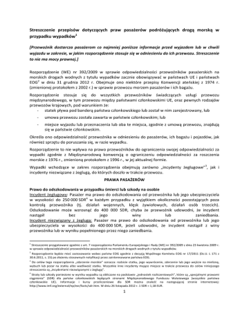 Streszczenie przepisów dotyczących praw pasażerów podróżujących drogą morską w przypadku wypadków1 [Przewoźnik dostarcza pasażerom co najmniej poniższe informacje przed wyjazdem lub w chwili wyjazdu w zakresie, w jakim rozporządzenie stosuje się w odniesieniu do ich przewozu. Streszczenie to nie ma mocy prawnej.] Rozporządzenie (WE) nr 392/2009 w sprawie odpowiedzialności przewoźników pasażerskich na morskich drogach wodnych z tytułu wypadków zacznie obowiązywać w państwach UE i państwach EOG2 w dniu 31 grudnia 2012 r. Obejmuje ono niektóre przepisy Konwencji ateńskiej z 1974 r. (zmienionej protokołem z 2002 r.) w sprawie przewozu morzem pasażerów i ich bagażu. Rozporządzenie stosuje się do wszystkich przewoźników świadczących usługi przewozu międzynarodowego, w tym przewozu między państwami członkowskimi UE, oraz pewnych rodzajów przewozów krajowych, pod warunkiem że: - statek pływa pod banderą państwa członkowskiego lub został w nim zarejestrowany, lub - umowa przewozu została zawarta w państwie członkowskim; lub - miejsce wyjazdu lub przeznaczenia lub oba te miejsca, zgodnie z umową przewozu, znajdują się w państwie członkowskim. Określa ono odpowiedzialność przewoźnika w odniesieniu do pasażerów, ich bagażu i pojazdów, jak również sprzętu do poruszania się, w razie wypadku. Rozporządzenie to nie wpływa na prawo przewoźników do ograniczenia swojej odpowiedzialności za wypadki zgodnie z Międzynarodową konwencją o ograniczeniu odpowiedzialności za roszczenia morskie z 1976 r., zmienioną protokołem z 1996 r., w jej aktualnej formie. Wypadki wchodzące w zakres rozporządzenia obejmują zarówno „incydenty żeglugowe”3, jak i incydenty niezwiązane z żeglugą, do których doszło w trakcie przewozu. PRAWA PASAŻERÓW Prawo do odszkodowania w przypadku śmierci lub szkody na osobie Incydent żeglugowy: Pasażer ma prawo do odszkodowania od przewoźnika lub jego ubezpieczyciela w wysokości do 250 000 SDR4 w każdym przypadku z wyjątkiem okoliczności pozostających poza kontrolą przewoźnika (tj. działań wojennych, klęsk żywiołowych, działań osób trzecich). Odszkodowanie może wzrosnąć do 400 000 SDR, chyba że przewoźnik udowodni, że incydent nastąpił bez jego winy lub zaniedbania. Incydent niezwiązany z żeglugą: Pasażer ma prawo do odszkodowania od przewoźnika lub jego ubezpieczyciela w wysokości do 400 000 SDR, jeżeli udowodni, że incydent nastąpił z winy przewoźnika lub w wyniku popełnionego przez niego zaniedbania. 1 Streszczenie przygotowane zgodnie z art. 7 rozporządzenia Parlamentu Europejskiego i Rady (WE) nr 392/2009 z dnia 23 kwietnia 2009 r. w sprawie odpowiedzialności przewoźników pasażerskich na morskich drogach wodnych z tytułu wypadków. 2 Rozporządzenie będzie mieć zastosowanie wobec państw EOG zgodnie z decyzją Wspólnego Komitetu EOG nr 17/2011 (Dz.U. L 171 z 30.6.2011, s. 15) po złożeniu stosownych notyfikacji przez zainteresowane państwa EOG. 3 Do celów tego rozporządzenia „zdarzenie morskie” oznacza: rozbicie statku, jego wywrócenie, zderzenie lub jego wejście na mieliznę, wybuch lub pożar na statku albo wadliwość statku. Wszystkie inne incydenty mające miejsce w trakcie przewozu do celów niniejszego streszczenia są „incydentami niezwiązanymi z żeglugą”. 4 Straty lub szkody poniesione w wyniku wypadku są obliczane na podstawie „jednostek rozliczeniowych”, które są „specjalnymi prawami ciągnienia” (SDR) dla państw członkowskich będących stronami Międzynarodowego Funduszu Walutowego (wszystkie państwa członkowskie UE). Informacje i kursy przeliczeniowe dla SDR można znaleźć na następującej stronie internetowej: http://www.imf.org/external/np/exr/facts/sdr.htm. W dniu 26 listopada 2012 r. 1 SDR = 1,18 EUR. 1 Prawo do odszkodowania z tytułu utraty lub uszkodzenia bagażu kabinowego Incydent żeglugowy: Pasażer ma prawo do odszkodowania od przewoźnika do 2 250 SDR, chyba że przewoźnik udowodni, że incydent nastąpił bez jego winy lub zaniedbania. Incydent niezwiązany z żeglugą: Pasażer ma prawo do odszkodowania od przewoźnika w wysokości do 2250 SDR, jeżeli udowodni, że incydent nastąpił z winy przewoźnika lub w wyniku popełnionego przez niego zaniedbania. Prawo do odszkodowania z tytułu utraty lub uszkodzenia bagażu innego niż bagaż kabinowy Pasażer ma prawo do odszkodowania od przewoźnika w wysokości do 12 700 SDR (pojazdy, w tym znajdujący się w nich lub na nich bagaż) lub w wysokości do 3375 SDR (inny bagaż), chyba że przewoźnik udowodni, że incydent nastąpił bez jego winy lub zaniedbania. Prawo do odszkodowania z tytułu utraty lub uszkodzenia kosztowności Pasażer ma prawo do odszkodowania od przewoźnika w wysokości do 3 375 SDR za utratę lub uszkodzenie pieniędzy, papierów wartościowych, złota, wyrobów ze srebra, biżuterii, ozdób i dzieł sztuki wyłącznie w sytuacji, gdy te kosztowności zostały przekazane przewoźnikowi do depozytu w celu przechowania. Prawo pasażera o ograniczonej sprawności ruchowej do odszkodowania z tytułu utraty lub uszkodzenia sprzętu umożliwiającego poruszanie się lub innego szczególnego sprzętu Incydent żeglugowy: Pasażer ma prawo do odszkodowania od przewoźnika w wysokości odpowiadającej kwocie koniecznej do zastąpienia tego sprzętu lub, w odpowiednich przypadkach, kosztom jego naprawy, chyba że przewoźnik udowodni, że incydent nastąpił bez jego winy lub zaniedbania. Incydent niezwiązany z żeglugą: Pasażer ma prawo do odszkodowania od przewoźnika w wysokości odpowiadającej kwocie koniecznej do zastąpienia tego sprzętu lub, w odpowiednich przypadkach, kosztom jego naprawy, jeżeli udowodni, że incydent nastąpił z winy przewoźnika lub w wyniku popełnionego przez niego zaniedbania. Prawo do zaliczki w przypadku incydentu żeglugowego W przypadku śmierci lub szkody na osobie, pasażer lu