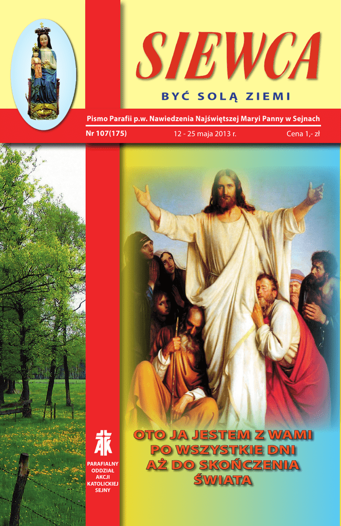 KO ŚB CY I ÓĆŁ SNO AL SZ ĄYM ZIE DM OM I EM Pismo Parafii p.w. Nawiedzenia Najświętszej Maryi Panny w Sejnach Nr 107(175) 92 (160) PARAFIALNY ODDZIAŁ AKCJI KATOLICKIEJ SEJNY 1612 – 29 - 25 września maja 2013 2012 r. r. Cena 1,- zł OTO JA JESTEM Z WAMI PO WSZYSTKIE DNI AŻ DO SKOŃCZENIA ŚWIATA MOTOCYKLIŚCI NA POCZĄTKU SEZONU U PANI NASZEJ SEJNEŃSKIEJ 01.05.2013 Bezkres Bożego stworzenia W którąkolwiek stronę rzeczywistości by spojrzeć, jej granice są dla nas nieosiągalne. Patrząc w dal, mamy wszystkie powody do przypuszczeń, że chociaż najnowocześniejsze teleskopy sięgają odległości, od których aż w głowie się kręci, to przecież poza ich zasięgiem istnieją dalsze przestrzenie kosmiczne, w ogóle niedostępne w tej chwili ludzkiej obserwacji. Patrząc w głąb, w najmniejszą odrobinę materii, coraz więcej zdajemy sobie sprawę z tego, że moment, w którym będziemy mogli sobie powiedzieć, iż na temat struktury materii wiemy już wszystko, odsuwa się nam praktycznie w nieskończoność. W ten sposób nawet świat materialny świadczy o swoim pochodzeniu od nieskończonego Boga. To zaś, że człowiek jest jedyną na tej ziemi istotą, zdolną rozpoznać tę bezgraniczność materialnego kosmosu, też zapewne coś znaczy. Czyż nie wolno nam dopatrywać się w tym znaku, że stworzeni zostaliśmy dla nieskończonego Boga? Że - jak powiada ostatni sobór - człowiek jest jedynym na tej ziemi stworzeniem, którego Bóg chciał dla niego samego? Ale zapatrzyliśmy się ostatnio w bezkres materii i zmniejszyły się nasze zainteresowania bezkresem świata duchowego. Owszem, jesteśmy świadomi naszej niemożności całościowego ogarnięcia ludzkich dziejów, ludzkiej myśli, a nawet ludzkiej psychiki. Czyżby jednak świat ducha ograniczał się do człowieka? Warto zdać sobie sprawę z tego, że chociaż o aniołach wiemy z Bożego objawienia, przecież istnienia ich domyślali się najwybitniejsi filozofowie starożytności. Do jakiego stopnia problem bytów pośrednich - wyższych od człowieka, a przecież stworzonych i zależnych od Boga - zaprzątał umysły Platona, Arystotelesa i innych ojców filozofii, osobiście zorientowałem się dopiero w trakcie pracy nad przekładem dziełka św. Tomasza pt. O substancjach czystych. Z książki „Wierzę” wybrał Eugeniusz SIEWCA MOC SŁOWA Niedziela Wniebowstąpienie Pańskie - 12 maja 2013 Łk 24, 46-53 edenastu uczniów udało się do Galilei na górę, tam gdzie Jezus im polecił. A gdy Go ujrzeli, oddali Mu pokłon. Niektórzy jednak wątpili. Wtedy Jezus zbliżył się do nich i przemówił tymi słowami: «Dana Mi jest wszelka władza w niebie i na ziemi. Idźcie więc i nauczajcie wszystkie narody, udzielając im chrztu w imię Ojca i Syna, i Ducha Świętego. Uczcie je zachowywać wszystko, co wam przykazałem. A oto Ja jestem z wami przez wszystkie dni, aż do skończenia świata». J Refleksja niedzielna: W niebowstąpienie Jezusa to nie tylko fakt historyczny, ale również wydarzenie o kolosalnym znaczeniu dla każdego z nas. Przychodząc na świat, Jezus stal się człowiekiem nie na chwilę, ale na zawsze. Wstępując do nieba, wprowadził tam również naszą ludzką naturę. Po raz pierwszy na tronie niebieskim zasiadł nie tylko Bóg, ale i człowiek. Przywołując obraz Kościoła jako Ciała Chrystusa, możemy mieć nadzieję, że skoro nasza Głowa znalazła się już w niebie, to wejście tam reszty Ciała jest tylko kwestią czasu. Bramy nieba zostały otwarte naprawdę. Nie dziwmy się więc, że Paweł modli się o to, byśmy zrozumieli, czym jest nadzieja naszego powołania. Godność natury ludzkiej jest tak wielka, że aż nie sposób tego pojąć bez szczególnej Bożej pomocy. Dzisiejsza uroczystość ma rozbudzić w nas pragnienie nieba, ale także zachęcić do tego, byśmy już teraz, dziś, dali się prowadzić Jezusowi. On mocą swojej ofiary krzyżowej oczyszcza nas z grzechu i czyni godnymi życia wiecznego. Bez Niego nie weszlibyśmy tam nigdy. Jednak nawet On nie wprowadzi nas do nieba na siłę, bez naszej dobrej woli i współpracy. W tych dniach jesteśmy zaproszeni do szczególnie intensywnej modlitwy do Ducha Świętego, który prowadzi cały Kościół, a także działa w sercu każdego z nas. On - jeśli Mu na to pozwalamy - leczy to, co w nas chore, umacnia to, co słabe, nagina to, co harde, daje światło w ciemnościach i zagubieniu. Przyzywając Go, z ufnością otwierajmy się na Jego działanie, abyśmy sami weszli do nieba i pomogli wejść do niego innym. Nr 107/2013 Niedziela Zesłanie Ducha Świętego – 19 maja 2013 J 20, 19-23 ieczorem w dniu zmartwychwstania, tam gdzie przebywali uczniowie, drzwi były zamknięte z obawy przed Żydami. Przyszedł Jezus, stanął pośrodku i rzekł do nich: «Pokój wam!» A to powiedziawszy, pokazał im ręce i bok. Uradowali się zatem uczniowie ujrzawszy Pana. A Jezus znowu rzekł do nich: «Pokój wam! Jak Ojciec Mnie posłał, tak i Ja was posyłam». Po tych słowach tchnął na nich i powiedział im: «Weźmijcie Ducha Świętego. Którym odpuścicie grzechy, są im odpuszczone, a którym zatrzymacie, są im zatrzymane». W Refleksja niedzielna: G dyby nie dzisiejsza uroczystość, nasze świętowanie Wielkanocy byłoby niepełne. Patrzylibyśmy na zmartwychwstałego Jezusa, być może nawet szczerze cieszylibyśmy się Jego zwycięstwem, a jednocześnie zadawalibyśmy sobie pytanie, co to ma wspólnego z nami, skoro nadal jesteśmy słabi, grzeszni i śmiertelni. Jednak uroczystość Zesłania Ducha Świętego jest lekarstwem na nasze rozterki. Wspominamy bowiem dzień, w którym moc Ducha Świętego - ta sama moc, która działała w Jezusie - wśród wichru, ognia i wielkiego poruszenia w jerozolimskim zgromadzeniu zostaje dana człowiekowi. My, w przeciwieństwie do Jezusa, posiadamy dopiero „pierwsze dary Ducha” (Rz 8,23), stanowiące jakby zadatek życia wiecznego. Czasami doświadcz