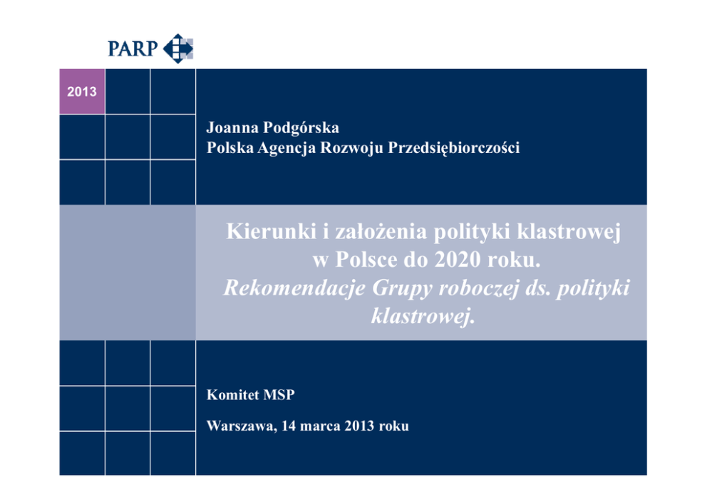 2013 Joanna Podgórska Polska Agencja Rozwoju Przedsiębiorczości Kierunki i załoŜenia polityki klastrowej w Polsce do 2020 roku. Rekomendacje Grupy roboczej ds. polityki klastrowej. Komitet MSP Warszawa, 14 marca 2013 roku Klastry = współpraca + konkurowanie geograficzna koncentracja i świadomość terytorialnej toŜsamości klastra konkurencja, ale i współpraca koncentracja wokół dominującej branŜy trwałość współpracy wspólne inicjatywy klastry mogą być formalnie zarejestrowane, jak i nieposiadające formy organizacyjno-prawnej Korzyści z funkcjonowania klastrów niŜsze koszty transakcyjne - wyspecjalizowanych zasobów, nieformalnych powiązań i przepływu informacji. Wewnętrzna konkurencja podmiotów w klastrze stymuluje innowacyjność i jest siłą napędową jego rozwoju. przestrzenna bliskości licznej grupy niezaleŜnych podmiotów, skupienie określonej wiedzy i kwalifikacji, specjalizacji; łatwość znalezienia pracowników i partnerów biznesowych (podwykonawców i usługodawców) oraz realizacji wspólnych działań w pewnych obszarach. dostępne lokalnie, wyspecjalizowane i unikalne zasoby – w tym wiedza i kapitał ludzki – oraz odpowiednia infrastruktura. klaster staje się atrakcyjnym rynkiem pracy przyciągającym wykwalifikowanych pracowników i absolwentów (talenty). NiŜsze koszty pozyskiwania i szkolenia nowych pracowników. oprócz konkurencji występuje takŜe współpraca, czy teŜ współdziałanie (często niesformalizowane i nieuświadomione), zwłaszcza pomiędzy sektorem przedsiębiorstw, administracją i sektorem badawczo-rozwojowym. Klastry w badaniu benchmarkingowym PARP Rok 2010 - 47 klastrów. Rok 2012 - 35 klastrów. Spośród 35 klastrów uczestniczących w badaniu w 2012 roku, 20 brało równieŜ udział w poprzedniej edycji. Klastry biorące udział w benchmarkingu w 2010 r. Klastry biorące udział w benchmarkingu w 2012 r. Silne strony klastrów w Polsce Powiązanie klastrów z potencjałem, zasobami naturalnymi, tradycjami gospodarczymi środowiska lokalnego; silne interakcje klastra względem otoczenia zewnętrznego; Silna pozycja koordynatora w klastrach oraz aktywność koordynatora na rzecz animacji współpracy w klastrach; wysoka aktywność w sferze komunikacji wewnętrznej i zewnętrznej; Dobra dostępność laboratoriów dla członków klastra; bardzo dobra dostępność biur i sal konferencyjnych na potrzeby klastra; Największy postęp w stosunku do roku 2010 dokonał się w obszarze internacjonalizacja klastrów W ciągu ostatnich dwóch lat klastry zauwaŜalnie poprawiły swoje wyniki w obszarze realizowanych procesów biznesowych Najbardziej efektywne są klastry: utworzone oddolnie, posiadające powyŜej 60 członków, posiadające w swych strukturach więcej instytucji otoczenia biznesu, jednostek naukowych i badawczych, W stosunku do roku 2010 odnotowano, Ŝe Klastry, które aktywnie pracują nowo powstające klastry są efektem z instytucjami otoczenia biznesu lepiej współdziałania sektorów prywatnego i szybciej się rozwijają i publicznego oraz instytucji B+R Słabe strony klastrów w Polsce Niska innowacyjność przedsiębiorstw w klastrze; mała liczba innowacji objętych ochroną prawną wprowadzonych w klastrze w ostatnich dwóch latach; słabe efekty współpracy z sektorem nauki (np. mała liczba spin offów w klastrach). Niewielka liczba klastrów realizujących wspólną aktywność rynkową, jak np. wspólne zamówienia, zaopatrzenie na rzecz firm w klastrze. Słaba aktywność klastra w przygotowywaniu ofert dla odbiorców z zewnątrz oraz w pozyskiwaniu zewnętrznych środków finansowych na projekty klastrowe. Niewystarczająca współpraca z innymi podmiotami regionalnych systemów innowacji, w tym instytucjami otoczenia biznesu. Grupa robocza ds. polityki klastrowej CEL: wypracowanie kierunków i załoŜeń polityki klastrowej do 2020 roku, na podstawie wniosków i rekomendacji wynikających z obecnie realizowanej polityki, z uwzględnieniem doświadczeń i dobrych praktyk zagranicznych oraz zaleceń Komisji Europejskiej. >> wsparcie instytucji kształtujących politykę klastrową<< Instytucjonalny skład Grupy roboczej Ministerstwo Gospodarki Polska Agencja Rozwoju Przedsiębiorczości Kancelaria Prezydenta Rzeczypospolitej Polskiej Kancelaria Prezesa Rady Ministrów Ministerstwo Rozwoju Regionalnego Ministerstwo Edukacji Narodowej Ministerstwo Nauki i Szkolnictwa WyŜszego Narodowe Centrum Badań i Rozwoju Polska Agencja Informacji i Inwestycji Zagranicznych Sejmowa Komisja Innowacyjności i Nowoczesnych Technologii Konwent Marszałków RP Związek Województw RP Unia Metropolii Polskich Business Centre Club Krajowa Izba Gospodarcza Pracodawcy Rzeczpospolitej Polskiej PKPP Lewiatan Konferencja Specjalnych Stref Ekonomicznych Przedstawiciele klastrów Eksperci Przyszła polityka klastrowa w Polsce Cel: wzmocnienie innowacyjności i konkurencyjności polskiej gospodarki w oparciu o: intensyfikację współpracy, interakcji i przepływów wiedzy (czyli wzmacnianie rozwoju istniejących i powstających klastrów) wspieranie rozwoju strategicznych specjalizacji gospodarczych (czyli wybór kluczowych klastrów krajowych i regionalnych oraz skoncentrowanie na nich części wsparcia publicznego) Zasady wdraŜania polityki: I. wspieranie sieciowania i współpracy; łączenie podejścia oddolnego i odgórnego przy wspieraniu rozwoju klastrów, II. tworzenie ekosystemu instytucji na rzecz rozwoju klastra, III. koncentracja wsparcia na klastrach o największym potencjale rozwoju i tworzenia inteligentnych specjalizacji, IV. koordynacja polityk i instrumentów publicznych wokół kluczowych klastrów, V. rozwój klastrów - inwestycje prywatne firm, ale takŜe inwestycje publiczne (infrastruktura, wiedza, kapitał ludzki), te ostatnie stopniowo wygaszane, Rekomendacje dla przyszłej polityki klastrowej (1) 1. wspieranie inicjatyw klastrowych oraz koordynatorów klastrów, 2. ukierunkowanie 