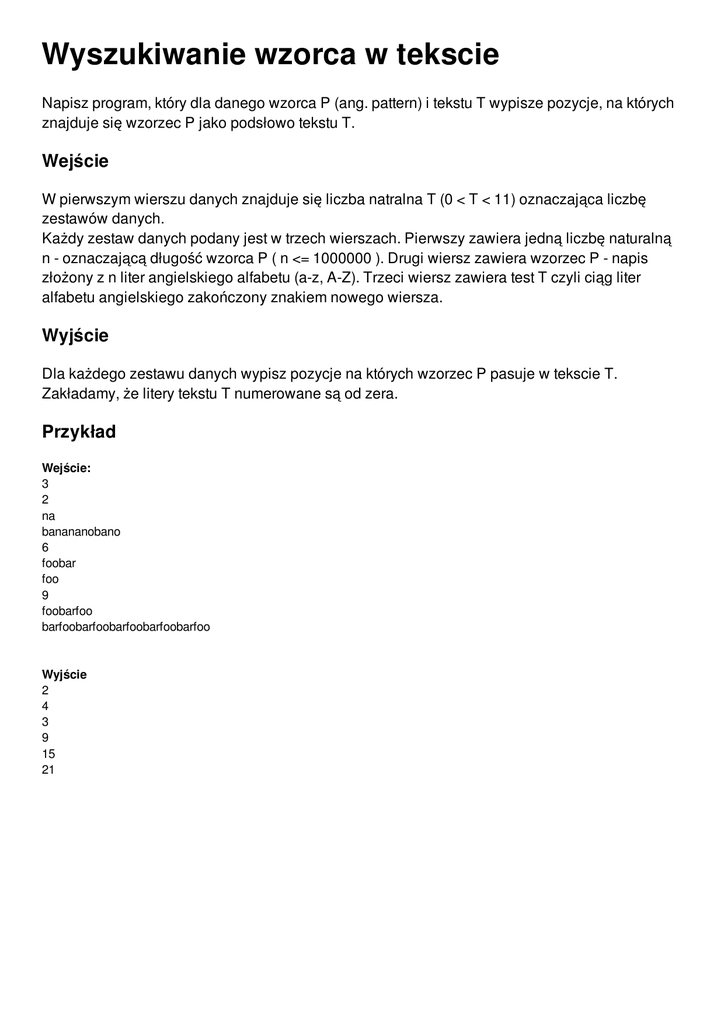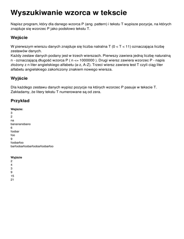 Wyszukiwanie wzorca w tekscie Napisz program, który dla danego wzorca P (ang. pattern) i tekstu T wypisze pozycje, na których znajduje się wzorzec P jako podsłowo tekstu T. Wejście W pierwszym wierszu danych znajduje się liczba natralna T (0 < T < 11) oznaczająca liczbę zestawów danych. Każdy zestaw danych podany jest w trzech wierszach. Pierwszy zawiera jedną liczbę naturalną n - oznaczającą długość wzorca P ( n <= 1000000 ). Drugi wiersz zawiera wzorzec P - napis złożony z n liter angielskiego alfabetu (a-z, A-Z). Trzeci wiersz zawiera test T czyli ciąg liter alfabetu angielskiego zakończony znakiem nowego wiersza. Wyjście Dla każdego zestawu danych wypisz pozycje na których wzorzec P pasuje w tekscie T. Zakładamy, że litery tekstu T numerowane są od zera. Przykład Wejście: 3 2 na banananobano 6 foobar foo 9 foobarfoo barfoobarfoobarfoobarfoobarfoo Wyjście 2 4 3 9 15 21