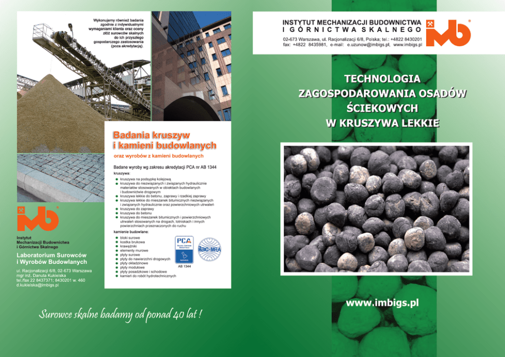 INFORMACJE WSTĘPNE KRUSZWO LEKKIE jest to kruszywo pochodzenia mineralnego o gęstości nie większej niż 2000 kg/m3 lub gęstości nasypowej w stanie luźnym nie większej niż 1200 kg/m3 Kruszywa lekkie są wykorzystywane zarówno w postaci niezwiązanej (w zastosowaniach geotechnicznych, izolacjach termicznych, do budowy nasypów, wymiany gruntów słabonośnych, itp.) oraz w wyrobach budowlanych, głównie betonowych, dla poprawy takich właściwości użytkowych jak zwiększenie izolacyjności, zmniejszenia masy obiektów budowlanych, pochłanianie hałasu, itp. Proces otrzymywania nowego rodzaju kruszyw lekkich opracowany w IMBiGS polega na przeprowadzeniu syntezy termicznej co najmniej trzech różnych surowców odpadowych, w tym osadów ściekowych jako jednego z głównych składników. Otrzymany materiał budowny na bazie osadów ściekowych i innych odpadów jest produktem w pełni ekologicznym, struktura kruszyw, wytworzona na bazie związków krzemianowych, jest analogiczna z występującą w minerałach naturalnych, kruszywo nie posiada substancji reagujących w środowisku naturalnym, nawet po rozdrobnieniu, podczas eksploatacji nie są uwalniane żadne środki chemiczne. Technologia otrzymywania sztucznych kruszyw umożliwia unieszkodliwienie substancji niebezpiecznych typu metale ciężkie zawarte w osadach ściekowych poprzez wbudowanie ich w sposób trwały i nieodwracalny w strukturę krystaliczną kruszyw. Technologia jest całkowicie bezodpadowa (nie powstają substancje wymagające dodatkowych operacji technologicznych) a powstaje odpady produkcyjne mogą być ponownie zastosowane w procesie technologicznym. Podstawowy cel technologii to zagospodarowanie i/ lub utylizacja odpadów, które ze względu na skład chemiczny i granulację są trudne do unieszkodliwienia (zagospodarowania) innymi metodami. Podstawowe przeciwwskazania do ich stosowania w po- 2 wszechnie znanych technologii to granulacja (zwykle drobna), zawartość niepożądanych zanieczyszczeń, zawartość substancji niebezpiecznych. Proponowane rozwiązanie z jenej strony jest sposobem produkcji kruszywa lekkiego o właściwościach umożliwiających zastosowanie w szerokim zakresie budownictwie ogólnym, drogowym, hydroponice, z drugiej może być stosowana do zagospodarowania osadów ściekowych metodami termicznymi, oraz dodatkowo drobnoziarnistych odpadów mineralnych takich jak pyły zawierające metale ciężkie oraz zanieczyszczenia organiczne, muły z zwartością substancji organicznych, odpady budowlane. ZAKRES ZASTOSOWANIA TECHNOLOGII Opracowana metoda umożliwia unieszkodliwienie materiałów odpadowych, które ze względu na granulację, zawartość zanieczyszczeń nie mogą być powszechnie wykorzystanie do innych celów. Krzemionka zastosowana w procesie syntezy termicznej kruszyw jest odpadem powstającym podczas produkcji kruszyw naturalnych i nie wykorzystywanym gospodarczo (wyłącznie składowanym), gdyż jego wielkość ziaren <0,063 mm, nie pozwala na stosowanie go w budownictwie. Natomiast w metodzie opracowanej przez Instytut ta wielkość ziarn jest cechą niezwykle pożądaną, ponieważ reakcja syntezy termicznej w fazie stałej jest efektywna przede wszystkim dla surowców drobnoziarnistych. Osady ściekowe, drugi podstawowy składnik metody wytwarzania lekkiego kruszywa silikatowego – są wykorzystywane w identycznej postaci, w jakiej znajdują się na składowiskach, to znaczy zagęszczone wyłącznie metodami mechanicznymi, bez stosowania procesu osuszania. Zastosowana termiczna metoda stabilizuje związki metali ciężkich, obecne w surowcach wejściowych. W procesie syntezy kruszywa lekkiego są wbudowane w strukturę powstającego spieku w sposób trwały, tworząc odpowiednie krzemiany – w sposób Technologia zagospodarowania osadów ściekowych w kruszywa lekkie – IMBiGS analogiczny jak ma to miejsce w naturalnych minerałach. Nie istnieje, zatem niebezpieczeństwo ich wymywania, migracji do otoczenia, nawet podczas rozkruszania lub obróbki metodami mechanicznymi. Metoda ta może być stosowana nawet do odpadów zawierających ww. substancje niebezpieczne w znacznie większych ilościach (nawet do kilku procent). Produktem końcowym przedstawionej metody jest produkt handlowylekkie kruszywo, stabilne w czasie przechowywania i stosowania. Jego właściwości są analogiczne do właściwości innego kruszywa lekkiego – keramzytu, otrzymywanego z surowców naturalnych. Materiały, które mogą być zastosowane do produkcji kruszyw sztucznych: – Odpady mineralne zawierające krzemionkę (w tym muły węglowe), – Odpady z recyklingu odpadów komunalnych (drobne frakcje szkła), – Popioły. ZALETY TECHNOLOGII Sposób wytwarzania nowego rodzaju kruszywa lekkiego wyłącznie z surowców odpadowych umożliwia uzyskanie: • Efektu ekologicznego – zagospodarowanie odpadów uciążliwych dla środowiska (osadów ściekowych, zanieczyszczonego szkła i gruzu, odpadów górniczych), • Efektu ekonomicznego – wytwarzanie kruszywa lekkiego pozwala na uzyskanie przychodu, związanego z jego sprzedażą oraz z opłatami za przyjęcie np. osadów ściekowych do utylizacji. Wstępna analiza możliwości wdrożenia technologii produkcji kruszyw lekkich z odpadów w praktyce przemysłowej opiera się na następujących przesłankach: – Surowce przeznaczone do produkcji kruszyw sztucznych wg technologii IMBiGS są powszechnie dostępne. Są to materiały odpadowe, których przyjęcie do procesu unieszkodliwiania wiąże się także w niektórych przypadkach z pozyskaniem dodatkowych funduszy, Technologia zagospodarowania osadów ściekowych w kruszywa lekkie – IMBiGS – Surowce do produkcji kruszyw sztucznych w większości przypadków nie wymagają dodatkowej kosztownej przeróbki, – Obecny stan techniki umożliwia realizacje inwestycji, nie oddziałującej negatywnie na środowisko, – Produkt końcowy, kruszywo lekkie, jest materiałem budowlanym poszukiw