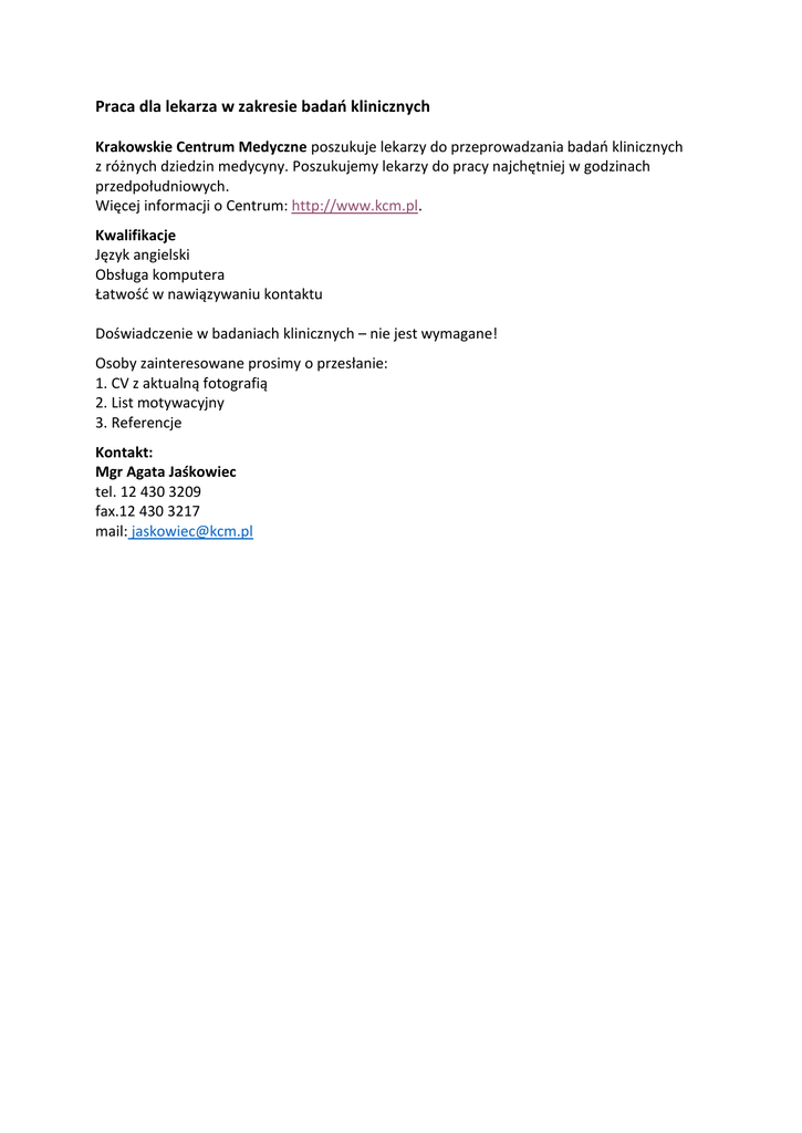 Praca dla lekarza w zakresie badań klinicznych Krakowskie Centrum Medyczne poszukuje lekarzy do przeprowadzania badań klinicznych z różnych dziedzin medycyny. Poszukujemy lekarzy do pracy najchętniej w godzinach przedpołudniowych. Więcej informacji o Centrum: http://www.kcm.pl. Kwalifikacje Język angielski Obsługa komputera Łatwość w nawiązywaniu kontaktu Doświadczenie w badaniach klinicznych – nie jest wymagane! Osoby zainteresowane prosimy o przesłanie: 1. CV z aktualną fotografią 2. List motywacyjny 3. Referencje Kontakt: Mgr Agata Jaśkowiec tel. 12 430 3209 fax.12 430 3217 mail: [email protected]