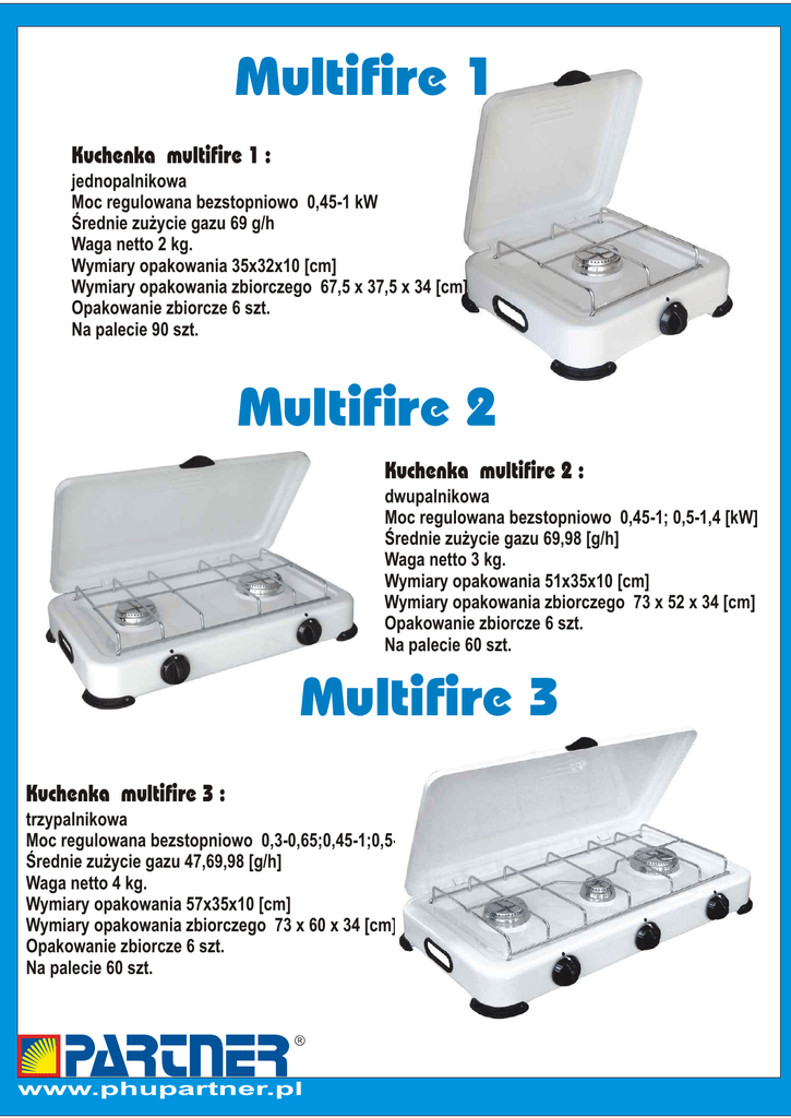 Multifire 1 Kuchenka multifire 1 : jednopalnikowa Moc regulowana bezstopniowo 0,45-1 kW Œrednie zu¿ycie gazu 69 g/h Waga netto 2 kg. Wymiary opakowania 35x32x10 [cm] Wymiary opakowania zbiorczego 67,5 x 37,5 x 34 [cm] Opakowanie zbiorcze 6 szt. Na palecie 90 szt. Multifire 2 Kuchenka multifire 2 : dwupalnikowa Moc regulowana bezstopniowo 0,45-1; 0,5-1,4 [kW] Œrednie zu¿ycie gazu 69,98 [g/h] Waga netto 3 kg. Wymiary opakowania 51x35x10 [cm] Wymiary opakowania zbiorczego 73 x 52 x 34 [cm] Opakowanie zbiorcze 6 szt. Na palecie 60 szt. Multifire 3 Kuchenka multifire 3 : trzypalnikowa Moc regulowana bezstopniowo 0,3-0,65;0,45-1;0,5-1,4 [kW] Œrednie zu¿ycie gazu 47,69,98 [g/h] Waga netto 4 kg. Wymiary opakowania 57x35x10 [cm] Wymiary opakowania zbiorczego 73 x 60 x 34 [cm] Opakowanie zbiorcze 6 szt. Na palecie 60 szt. www.phupartner.pl