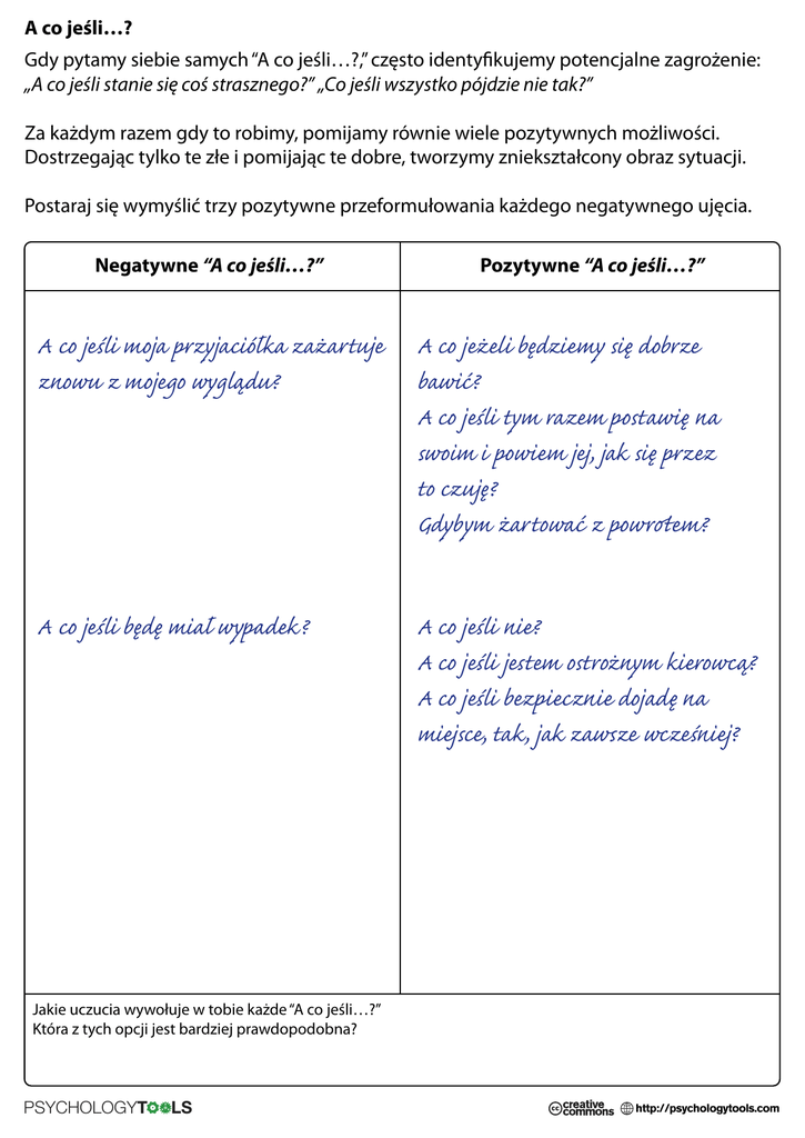 A co jeśli…? Gdy pytamy siebie samych “A co jeśli…?,” często identyfikujemy potencjalne zagrożenie: „A co jeśli stanie się coś strasznego?” „Co jeśli wszystko pójdzie nie tak?” Za każdym razem gdy to robimy, pomijamy równie wiele pozytywnych możliwości. Dostrzegając tylko te złe i pomijając te dobre, tworzymy zniekształcony obraz sytuacji. Postaraj się wymyślić trzy pozytywne przeformułowania każdego negatywnego ujęcia. Negatywne “A co jeśli…?” Pozytywne “A co jeśli…?” A co jeśli moja przyjaciółka zażartuje znowu z mojego wyglądu? A co jeżeli będziemy się dobrze bawić? A co jeśli tym razem postawię na swoim i powiem jej, jak się przez to czuję? Gdybym żartować z powrotem? A co jeśli będę miał wypadek? A co jeśli nie? A co jeśli jestem ostrożnym kierowcą? A co jeśli bezpiecznie dojadę na miejsce, tak, jak zawsze wcześniej? Jakie uczucia wywołuje w tobie każde “A co jeśli…?” Która z tych opcji jest bardziej prawdopodobna? PSYCHOLOGYT LS http://psychologytools.com A co jeśli…? Negatywne “A co jeśli…?” Pozytywne “A co jeśli…?” Czego się nauczyłem/am o swoich “A co jeśli…?” PSYCHOLOGYT LS http://psychologytools.com