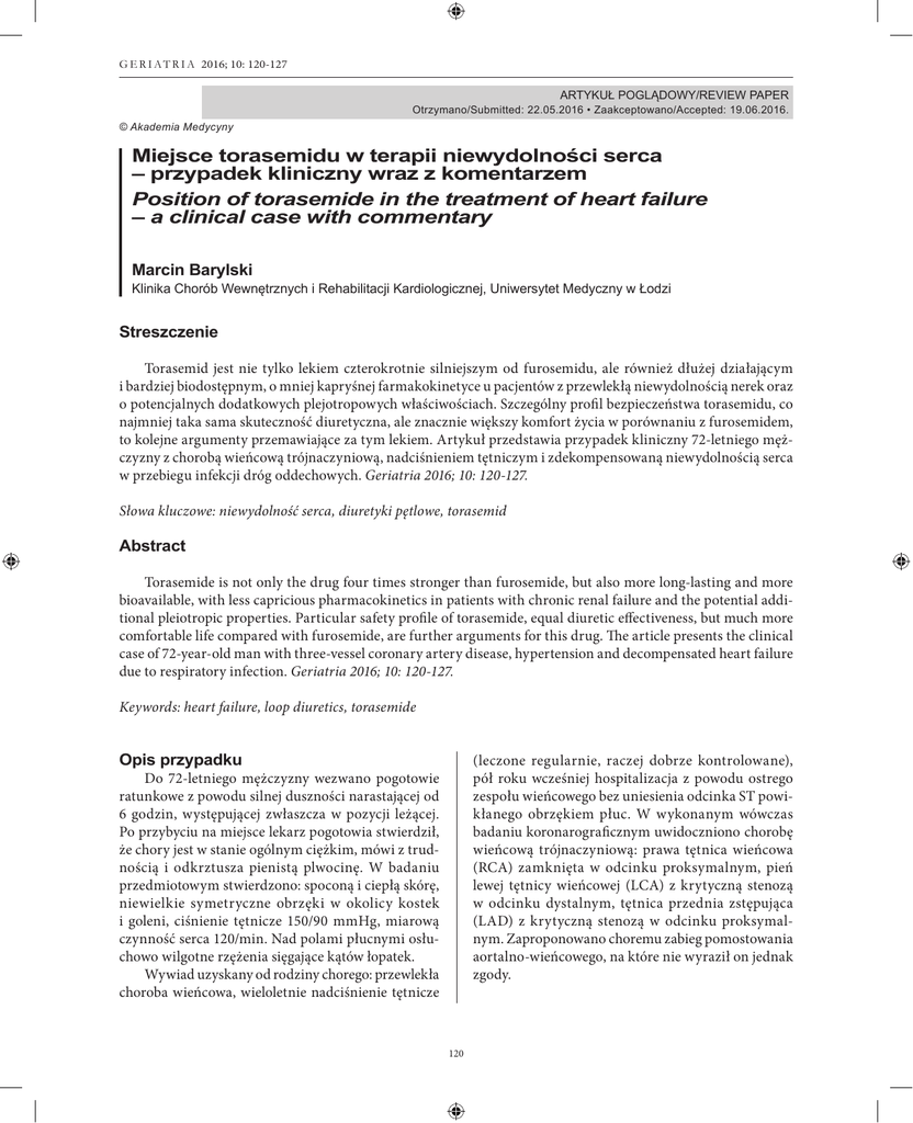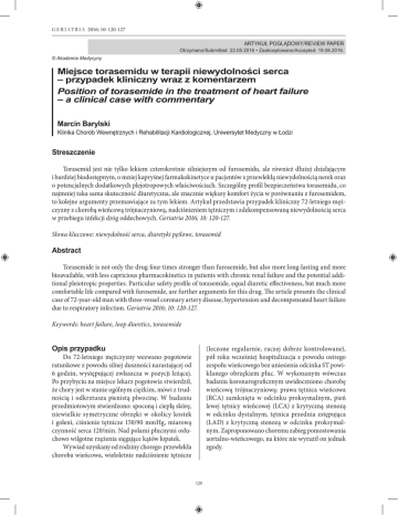 G E R I A T R I A 2016; 10: 120-127 ARTYKUŁ POGLĄDOWY/REVIEW PAPER Otrzymano/Submitted: 22.05.2016 • Zaakceptowano/Accepted: 19.06.2016. © Akademia Medycyny Miejsce torasemidu w terapii niewydolności serca – przypadek kliniczny wraz z komentarzem Position of torasemide in the treatment of heart failure – a clinical case with commentary Marcin Barylski Klinika Chorób Wewnętrznych i Rehabilitacji Kardiologicznej, Uniwersytet Medyczny w Łodzi Streszczenie Torasemid jest nie tylko lekiem czterokrotnie silniejszym od furosemidu, ale również dłużej działającym i bardziej biodostępnym, o mniej kapryśnej farmakokinetyce u pacjentów z przewlekłą niewydolnością nerek oraz o potencjalnych dodatkowych plejotropowych właściwościach. Szczególny profil bezpieczeństwa torasemidu, co najmniej taka sama skuteczność diuretyczna, ale znacznie większy komfort życia w porównaniu z furosemidem, to kolejne argumenty przemawiające za tym lekiem. Artykuł przedstawia przypadek kliniczny 72-letniego mężczyzny z chorobą wieńcową trójnaczyniową, nadciśnieniem tętniczym i zdekompensowaną niewydolnością serca w przebiegu infekcji dróg oddechowych. Geriatria 2016; 10: 120-127. Słowa kluczowe: niewydolność serca, diuretyki pętlowe, torasemid Abstract Torasemide is not only the drug four times stronger than furosemide, but also more long-lasting and more bioavailable, with less capricious pharmacokinetics in patients with chronic renal failure and the potential additional pleiotropic properties. Particular safety profile of torasemide, equal diuretic effectiveness, but much more comfortable life compared with furosemide, are further arguments for this drug. The article presents the clinical case of 72-year-old man with three-vessel coronary artery disease, hypertension and decompensated heart failure due to respiratory infection. Geriatria 2016; 10: 120-127. Keywords: heart failure, loop diuretics, torasemide Opis przypadku (leczone regularnie, raczej dobrze kontrolowane), pół roku wcześniej hospitalizacja z powodu ostrego zespołu wieńcowego bez uniesienia odcinka ST powikłanego obrzękiem płuc. W wykonanym wówczas badaniu koronarograficznym uwidoczniono chorobę wieńcową trójnaczyniową: prawa tętnica wieńcowa (RCA) zamknięta w odcinku proksymalnym, pień lewej tętnicy wieńcowej (LCA) z krytyczną stenozą w odcinku dystalnym, tętnica przednia zstępująca (LAD) z krytyczną stenozą w odcinku proksymalnym. Zaproponowano choremu zabieg pomostowania aortalno-wieńcowego, na które nie wyraził on jednak zgody. Do 72-letniego mężczyzny wezwano pogotowie ratunkowe z powodu silnej duszności narastającej od 6 godzin, występującej zwłaszcza w pozycji leżącej. Po przybyciu na miejsce lekarz pogotowia stwierdził, że chory jest w stanie ogólnym ciężkim, mówi z trudnością i odkrztusza pienistą plwocinę. W badaniu przedmiotowym stwierdzono: spoconą i ciepłą skórę, niewielkie symetryczne obrzęki w okolicy kostek i goleni, ciśnienie tętnicze 150/90 mmHg, miarową czynność serca 120/min. Nad polami płucnymi osłuchowo wilgotne rzężenia sięgające kątów łopatek. Wywiad uzyskany od rodziny chorego: przewlekła choroba wieńcowa, wieloletnie nadciśnienie tętnicze 120 120 G E R I A T R I A 2016; 10: 120-127 Badania laboratoryjne W badaniu echokardiograficznym uwidoczniono wówczas niepowiększoną lewą komorę, przerost symetryczny mięśnia przegrody (grubość przegrody 13 mm [norma < 11 mm]), akinezę ściany dolnej i tylnej oraz hipokinezę pozostałych segmentów lewej komory i nieznacznie obniżoną frakcję wyrzutową lewej komory (EF = 46%). Chory dotychczas przyjmował leki zalecone przy wypisie ze szpitala: kwas acetylosalicylowy (ASA) 75 mg 1 x dz., klopidogrel 75 mg 1 x dz., bisoprolol 5 mg 1 x dz., enalapril 10 mg 2 x dz., atorwastatynę 40 mg 1 x dz. Od kilku dni pacjent skarżył się na suchy kaszel i chrypkę; miał też podwyższoną temperaturę ciała (38,2°C). Dodatkowo nawrócił silny ból okolicy krzyżowo-lędźwiowej; z tego powodu chory od tygodnia stosował ketoprofen w dawce 100 mg 2 x dz. Przed przybyciem pogotowia pacjent przyjął podjęzykowo 1 tabletkę nitrogliceryny, ale dolegliwości nie zmniejszyły się. Lekarz rozpoznał obrzęk płuc i wobec ciężkiego stanu ogólnego zdecydował o przewiezieniu chorego do szpitala. Pacjentowi wprowadzono kaniulę do żyły obwodowej, wstrzyknięto dożylnie 40 mg furosemidu, podano tlen przez maskę tlenową (4 l/min) i rozpoczęto monitorowanie EKG. Na izbie przyjęć szpitala wprowadzono cewnik do pęcherza moczowego uzyskując około 500 ml moczu, podano dodatkowo dożylnie 40 mg furosemidu, podłączono wlew nitrogliceryny (dawka początkowa 40 µg/min), kontynuowano tlenoterapię (SaO2 92-95%). Nie uzyskano jednak istotnej poprawy stanu klinicznego w ciągu kolejnych 30 minut. Stan chorego nadal był ciężki, utrzymywały się zmiany osłuchowe nad polami płucnymi. Pacjent był pobudzony, zdezorientowany co do czasu i miejsca. Temperatura ciała wynosiła 38,4°C, SaO2 93-95%, częstotliwość rytmu serca 100-110/min, ciśnienie tętnicze 160/100 mmHg. Chorego przekazano na salę „R” oddziału kardiologii. Oznaczenie (jednostka) Wynik Krew Hemoglobina (g/dl) 13,5 Hematokryt (%) 38,6 Leukocyty (tys./µl) 16 Płytki krwi (tys./µl) 270 Sód (mmol/l) 138 Potas (mmol/l) 3,9 Glukoza (mg/dl) 96 Kreatynina (mg/dl) 1,5 GFR wg MDRD (ml/min/1,73 m2) 50 Troponina I (ng/ml) 0,01 NT-proBNP (pg/ml) 7450 CRP (mg/l) ALT (U/I) Cholesterol całkowity (mg/dl) Cholesterol LDL (mg/dl) Cholesterol HDL (mg/dl) Triglicerydy (mg/dl) 246 24 138 68 42 138 Gazometria krwi tętniczej pH 7,33 PaO2 70 mmHg PaCO2 38 mmHg Badanie echokardiograficzne Nieznacznie powiększona lewa komora (wymiar późnorozkurczowy – 59 mm), przerost symetryczny mięśnia przegrody (grubość przegrody 14 mm), akineza segmentów ściany dolnej i tylnej oraz przegrody międzykomorowej. Hipokin