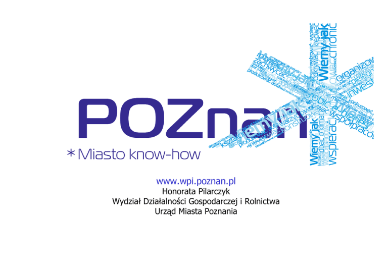 www.wpi.poznan.pl Honorata Pilarczyk Wydział Działalności Gospodarczej i Rolnictwa Urząd Miasta Poznania wiemy, jak połączyć naukę z biznesem Projekty Wielkopolska Platforma Innowacyjna (WPI) oraz Sieć Promotorów Przedsiębiorczości Akademickiej (SPPA) są realizowane przez Wydział Działalności Gospodarczej i Rolnictwa Urzędu Miasta Poznania we współpracy z wielkopolskim środowiskiem naukowo-badawczym wiemy, jak połączyć naukę z biznesem Wielkopolska Platforma Innowacyjna – Partnerzy: - 7 publicznych uczelni - 5 instytutów naukowych Co zawiera Wielkopolska Platforma Innowacyjna? największa BAZA OFERT instytucji naukowo-badawczych w kraju, aktualności (informacje o działalności naukowo-badawczej z regionu i kraju ze szczególnym wskazaniem na działalność Partnerów WPI), artykuły (zarządzanie innowacjami, przykładowe wdrożenia projektów), kalendarium (wydarzenia, konferencje, spotkania, sympozja, szkolenia), baza regionalnych instytucji naukowo-badawczych, zbiór dokumentów strategicznych (regionalnych, krajowych, europejskich) wiemy, jak połączyć naukę z biznesem baza ofert (520 wpisów w j.pol. i 136 w j.ang.) - największa baza w kraju liczba zapytań przedsiębiorców dot. współpracy ponad 400 od 2012 r. liczba odwiedzin (160 tys.) zapytania przedsiębiorców 100 90 80 70 60 50 40 30 20 10 0 I pół 2012 I pół 2013 I pół 2014 BAZA OFERT Wielkopolskiej Platformy Innowacyjnej usługi analityczne / pomiarowe oferty usług świadczonych przez jednostki naukowo-badawcze w ramach posiadanej aparatury pomiarowej usługi badawcze oferty prezentujące możliwości badawcze jednostek służące rozwiązaniu określonego problemu wyniki prac badawczych oferty rozwiązań, w postaci np. produktów czy technologii, będących efektem przeprowadzonych prac badawczych 24.11.14 Spotkania informacyjno-promocyjne z przedsiębiorcami, u Partnerów oraz robocze zespołu: spotkania informacyjno-promocyjne 30 spotkań dla 1151 osób: 11 u Partnerów (370 osób) 3 ze środowiskiem gospodarczym (160 osób) 6 na MTP (ponad 400 osób) 11 wizyt w firmach (łącznie 221 osób) spotkania zespołu (61): 3 szkolenia warsztatowe dla PPA, 48 spotkań roboczych PPA 10 konsultacji z rzecznikami patentowymi Wizyty w firmach: Solaris (2011r.) Herbapol Poznań (2012 r.) Autostrada Wielkopolska (2012 r.) Centrum Badań DNA (2012 r.) Modertrans Poznań (2013 r.) Stomil-Poznań (2013 r.) Nano-Tech (2013 r.) w Poznańskim Parku TechnologicznoPrzemysłowym Fawor (2013 r.) Alba Thyment (2014 r.) Fabryka Armatur Swarzędz (2014 r.) GlaxoSmithKline (2014r.) zorganizowane przez BPCC PROJEKTY - współorganizacja Poznańskich Dni Przedsiębiorczości Akademickiej/ udział w Targach Przedsiębiorczości • • • • PDPA 2010 na Akademii Sztuk Pięknych PDPA 2011 w ramach Poznańskich Dni Przedsiębiorczości na MTP oraz Uniwersytecie Ekonomicznym PDPA 2012 w ramach Poznańskich Dni Przedsiębiorczości na MTP (prezentacje projektów wdrożeniowych PP oraz wystawa posterowa nagrodzonych wynalazków PP) TP 2012 na MTP (prezentacje potencjału wdrożeniowego 3 instytutów badawczych-Partnerów WPI: ILIM, INOP, IWNIRZ) • TP 2013 (prezentacje wszystkich 7 uczelni-Partnerów WPI podczas bloku tematycznego • „Poznańska nauka dla gospodarki”, wystawa realizacji projektów studentów i dyplomantów katedr Mebla i Designu Uniwersytetu Artystycznego w Poznaniu) TUB 2014 na MTP w ramach Dni Przedsiębiorczości Poznań (zorganizowanie stoiska, przygotowanie dwóch wystaw wynalazków UPP i UAP, prezentacja wybranych przykładów współpracy nauka-biznes (UAP, AWF, PP, UAM) - Naukowiec w biznesie - Pierwszy krok we własny biznes wiemy, jak połączyć naukę z biznesem Korzyści wynikające z realizacji WPI i SPPA: zestawienie w jednym miejscu potencjału naukowego Partnerów WPI odpowiedź na zapotrzebowania firm w zakresie współpracy z nauką możliwość jednoczesnej współpracy z kilkoma jednostkami naukowo-badawczymi wymiana doświadczeń ze współpracy pomiędzy jednostkami naukowymi a przedsiębiorstwami realizacja wspólnych projektów, spotkań oraz wizyt u Partnerów i w przedsiębiorstwach Nasz zespół Małgorzata Krzyżanowska-Szejner - Akademia Wychowania Fizycznego w Poznaniu, dr Krzysztof Kus - Uniwersytet Medyczny im. Karola Marcinkowskiego w Poznaniu, dr Urszula Mojsiej - Uniwersytet Przyrodniczy w Poznaniu, dr Aleksandra Szulczewska-Remi - Uniwersytet Ekonomiczny w Poznaniu, Paulina Szewczyk - Dyrektor Centrum Innowacji, Rozwoju i Transferu Technologii, Politechnika Poznańska, Jacek Wajda - Dyrektor Uczelnianego Centrum Innowacji i Transferu Technologii, Uniwersytet im. A. Mickiewicza w Poznaniu dr Łukasz Stawarski - Uniwersytet Artystyczny w Poznaniu, Ewa Szymańska - Instytut Obróbki Plastycznej, Ilona Kużaj-Aydar - Instytut Logistyki i Magazynowania, Adam Olszewski - Instytut Chemii Bioorganicznej PAN Poznańskie Centrum Superkomputerowo-Sieciowe, Janusz Jankowiak - Instytut Włókien Naturalnych i Roślin Zielarskich, dr Anna Stachowiak-Szrejbrowska - Instytut Genetyki Roślin Polskiej Akademii Nauk Serdecznie zapraszamy do współpracy: www.wpi.poznan.pl /Nasz Zespół Kontakt: Honorata Pilarczyk [email protected] 61 878 4778