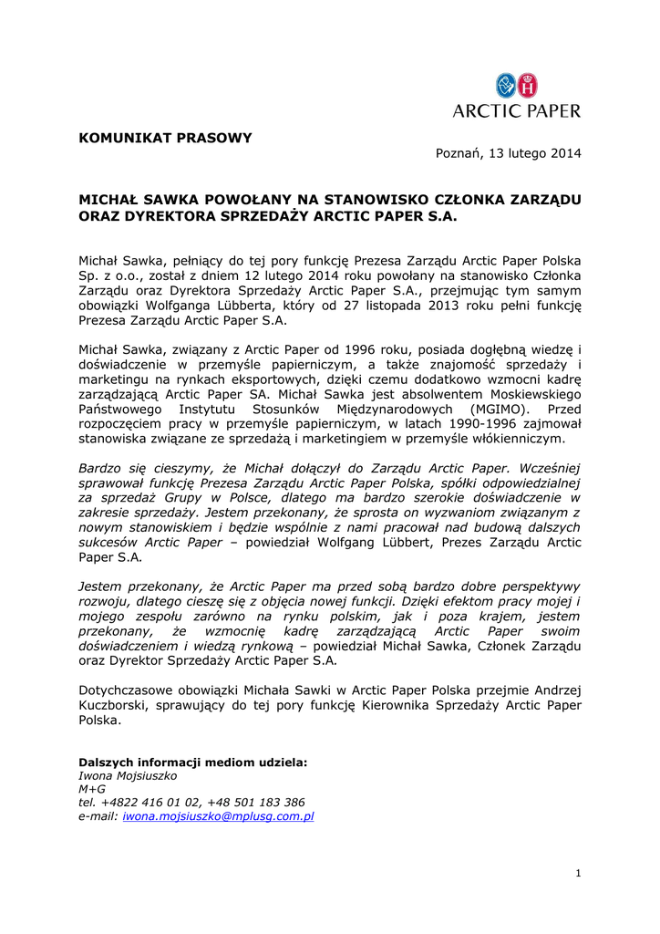 KOMUNIKAT PRASOWY Poznań, 13 lutego 2014 MICHAŁ SAWKA POWOŁANY NA STANOWISKO CZŁONKA ZARZĄDU ORAZ DYREKTORA SPRZEDAŻY ARCTIC PAPER S.A. Michał Sawka, pełniący do tej pory funkcję Prezesa Zarządu Arctic Paper Polska Sp. z o.o., został z dniem 12 lutego 2014 roku powołany na stanowisko Członka Zarządu oraz Dyrektora Sprzedaży Arctic Paper S.A., przejmując tym samym obowiązki Wolfganga Lübberta, który od 27 listopada 2013 roku pełni funkcję Prezesa Zarządu Arctic Paper S.A. Michał Sawka, związany z Arctic Paper od 1996 roku, posiada dogłębną wiedzę i doświadczenie w przemyśle papierniczym, a także znajomość sprzedaży i marketingu na rynkach eksportowych, dzięki czemu dodatkowo wzmocni kadrę zarządzającą Arctic Paper SA. Michał Sawka jest absolwentem Moskiewskiego Państwowego Instytutu Stosunków Międzynarodowych (MGIMO). Przed rozpoczęciem pracy w przemyśle papierniczym, w latach 1990-1996 zajmował stanowiska związane ze sprzedażą i marketingiem w przemyśle włókienniczym. Bardzo się cieszymy, że Michał dołączył do Zarządu Arctic Paper. Wcześniej sprawował funkcję Prezesa Zarządu Arctic Paper Polska, spółki odpowiedzialnej za sprzedaż Grupy w Polsce, dlatego ma bardzo szerokie doświadczenie w zakresie sprzedaży. Jestem przekonany, że sprosta on wyzwaniom związanym z nowym stanowiskiem i będzie wspólnie z nami pracował nad budową dalszych sukcesów Arctic Paper – powiedział Wolfgang Lübbert, Prezes Zarządu Arctic Paper S.A. Jestem przekonany, że Arctic Paper ma przed sobą bardzo dobre perspektywy rozwoju, dlatego cieszę się z objęcia nowej funkcji. Dzięki efektom pracy mojej i mojego zespołu zarówno na rynku polskim, jak i poza krajem, jestem przekonany, że wzmocnię kadrę zarządzającą Arctic Paper swoim doświadczeniem i wiedzą rynkową – powiedział Michał Sawka, Członek Zarządu oraz Dyrektor Sprzedaży Arctic Paper S.A. Dotychczasowe obowiązki Michała Sawki w Arctic Paper Polska przejmie Andrzej Kuczborski, sprawujący do tej pory funkcję Kierownika Sprzedaży Arctic Paper Polska. Dalszych informacji mediom udziela: Iwona Mojsiuszko M+G tel. +4822 416 01 02, +48 501 183 386 e-mail: [email protected] 1 ARCTIC PAPER S.A. jest europejskim producentem objętościowego papieru książkowego oraz graficznego papieru wysokogatunkowego. Grupa produkuje niepowlekany i powlekany papier bezdrzewny oraz niepowlekany papier drzewny dla drukarni, wydawców książek i czasopism, branży reklamowej oraz dystrybutorów papieru. Portfolio produktowe Grupy tworzą znane marki takie jak Amber, Arctic, G-Print, Munken, Pamo, L-Printi AP-Tec. Grupa posiada cztery papiernie: w Kostrzynie nad Odrą (Polska), Munkedal i Grycksbo (Szwecja) oraz Mochenwangen (Niemcy). Łączne zdolności produkcyjne czterech papierni wchodzących w skład Grupy wynoszą ponad 800 tys. ton papieru rocznie. • Arctic Paper Kostrzyn posiada moce produkcyjne na poziomie 275 tys. ton rocznie i produkuje głównie niepowlekany papier bezdrzewny do ogólnych zastosowań drukarskich, tj. druku książek, broszur, formularzy oraz do wyrobu kopert; • Arctic Paper Munkedals posiada moce produkcyjne na poziomie 160 tys. ton rocznie i produkuje głównie wysokiej jakości niepowlekany papier bezdrzewny stosowany do druku książek oraz wysokiej jakości broszur reklamowych; • Arctic Paper Mochenwangen posiada moce produkcyjne na poziomie 115 tys. ton rocznie i produkuje głównie niepowlekany papier drzewny stosowany przede wszystkim do druku książek i ulotek. • Arctic Paper Grycksbo posiada moce produkcyjne na poziomie 265 tys. ton. i produkuje wysokogatunkowe papiery powlekane, przeznaczone do druku map, książek, czasopism, plakatów i materiałów reklamy kierunkowej. Ponadto, Grupa posiada dwie celulozownie o łącznych zdolnościach produkcyjnych na poziomie 410 tys. ton rocznie. • Celulozownia w Vallvik (Szwecja) posiada moce produkcyjne na poziomie ok. 240.000 ton rocznie i produkuje dwa rodzaje celulozy siarczanowej (ang. long-fibre sulphate pulp): celuloza siarczanowa pełnobielona (ang. fully bleached sulphate pulp) oraz niebielona celuloza siarczanowa (ang. unbleached sulphate pulp); • Celulozownia w Rottneros (Szwecja) posiada moce produkcyjne na poziomie ok. 170.000 ton rocznie i produkuje głównie dwa rodzaje celulozy włóknistej mechanicznej: ścier drzewny (ang. groundwood) oraz celulozę chemotermomechaniczną (ang. CTMP). Ważną częścią Grupy są spółki dystrybucyjne i biura sprzedaży zajmujące się dystrybucją papieru i marketingiem. Obecnie Grupa posiada w Europie 15 spółek dystrybucyjnych i biur sprzedaży, zapewniających jej dostęp do wszystkich rynków europejskich, dzięki czemu uzyskała 20% europejskiego rynku objętościowego papieru książkowego. Grupa Arctic Paper zatrudnia łącznie około 1 830 pracowników. Siedziba Zarządu tej międzynarodowej Grupy znajduje się w Polsce. Największymi akcjonariuszami Arctic Paper S.A. są szwedzkie spółki Trebruk AB (poprzednio Arctic Paper AB) oraz Nemus Holding AB, które po uwzględnieniu wyników ostatniego okresu wezwania dot. akcji Rottneros AB posiadają łącznie 68,3% akcji. Od października 2009 roku Grupa Arctic Paper jest notowana na Giełdzie Papierów Wartościowych w Warszawie, natomiast od grudnia 2012 roku na NASDAQ OMX w Sztokholmie. Więcej informacji na www.arcticpaper.com 2