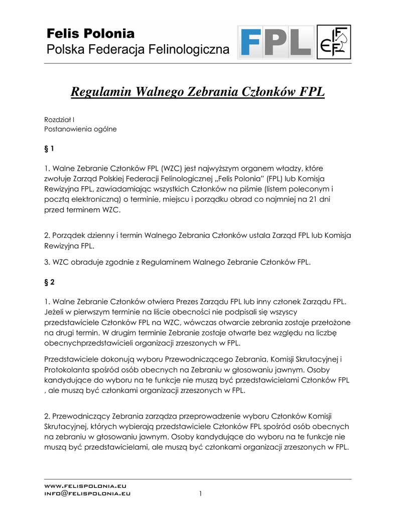 Regulamin Walnego Zebrania Członków FPL Rozdział I Postanowienia ogólne §1 1. Walne Zebranie Członków FPL (WZC) jest najwyższym organem władzy, które zwołuje Zarząd Polskiej Federacji Felinologicznej „Felis Polonia” (FPL) lub Komisja Rewizyjna FPL, zawiadamiając wszystkich Członków na piśmie (listem poleconym i pocztą elektroniczną) o terminie, miejscu i porządku obrad co najmniej na 21 dni przed terminem WZC. 2. Porządek dzienny i termin Walnego Zebrania Członków ustala Zarząd FPL lub Komisja Rewizyjna FPL. 3. WZC obraduje zgodnie z Regulaminem Walnego Zebranie Członków FPL. §2 1. Walne Zebranie Członków otwiera Prezes Zarządu FPL lub inny członek Zarządu FPL. Jeżeli w pierwszym terminie na liście obecności nie podpisali się wszyscy przedstawiciele Członków FPL na WZC, wówczas otwarcie zebrania zostaje przełożone na drugi termin. W drugim terminie Zebranie zostaje otwarte bez względu na liczbę obecnychprzedstawicieli organizacji zrzeszonych w FPL. Przedstawiciele dokonują wyboru Przewodniczącego Zebrania, Komisji Skrutacyjnej i Protokolanta spośród osób obecnych na Zebraniu w głosowaniu jawnym. Osoby kandydujące do wyboru na te funkcje nie muszą być przedstawicielami Członków FPL , ale muszą być członkami organizacji zrzeszonych w FPL. 2. Przewodniczący Zebrania zarządza przeprowadzenie wyboru Członków Komisji Skrutacyjnej, których wybierają przedstawiciele Członków FPL spośród osób obecnych na zebraniu w głosowaniu jawnym. Osoby kandydujące do wyboru na te funkcje nie muszą być przedstawicielami, ale muszą być członkami organizacji zrzeszonych w FPL. www.felispolonia.eu [email protected] 1 WZC wybiera do Komisji Skrutacyjnej (KS) dwie do trzech osób. Członkowie KS wybierają swego przewodniczącego. Do obowiązków Komisji Skrutacyjnej należy: a. wybór Przewodniczącego Komisji Skrutacyjnej. b. liczenia głosów zgodnie z listą obecności oraz obliczenie ważności oddanych głosów. c. sprawdzenie listy obecności przdstawicieli i stwierdzenie prawomocności wyborów do władz federacji. d. sporządzenie protokołu z wyborów do władz federacji i przekazywanie go przewodniczącemu zebrania w celu odczytania, oraz ogłaszanie wyników głosowań. 3. WZC wybiera dwóch protokolantów, którzy sporządzają protokół z Zebrania. Protokolanci powinni zadbać, by Zebranie zostało nagrane na nośnik audio. Protokół z zebrania, podpisany przez dwóch protokolantów, musi być przedstawiony do biura i Zarządu FPL wraz z jego wersją elektroniczną najpóźniej 14 dni po zebraniu. Zarząd musi przesłać Protokół z WZC do wszystkich Członków FPL najpóźniej 14 dni po jego otrzymaniu od protokolantów. §3 1. Walne Zebranie Członków obraduje według zasad określonych w niniejszym Regulaminie. 2. Obradami Walnego Zebrania Członków kieruje Przewodniczący Zebrania. §4 1. W Walnym Zebraniu Członków biorą udział: a) Przedstawiciele Członków FPL z głosem stanowiącym. Przedstawiciele są zgłoszeni przez Członków FPL zgodnie ze Statutem FPL § 16 pkt. 1. W przypadku nieprzekazania do biura FPL listy członków indywidualnych według stanu na dzień 31 grudnia roku poprzedzającego, kwalifikującej do 2 (dwóch) głosów, w terminie do 15 stycznia przyjmuje się, że Członkowi FPL przysługuje 1 (jeden) głos. b) Zarząd FPL c) Doradcy przedstawicieli, osoby zaproszone oraz członkowie Komisji FPL z głosem doradczym. www.felispolonia.eu [email protected] 2 2. Przedstawiciele potwierdzają swoją obecność na Walnym Zebraniu Członków podpisując listę obecności. 3. Podczas WZC prawo zabierania głosu mają wyłącznie: Przewodniczący Zebrania, przedstawiciele, Zarząd i Komisje FPL, oraz poproszone o zabranie głosu inne osoby. Prelegenci, którzy zamierzają wziąć udział w dyskusji, zgłaszają się kolejno do głosu do prowadzącego Zebranie. 4. W dyskusjach nad propozycjami prelegenci powinni przedstawiać swe racje możliwie krótko i zwięźle, w czasie nie dłuższym niż 5 minut. §5 1.Wnioski na WZC Członkowie FPL mogą nadsyłać najpóźniej do dnia 15 stycznia roku bieżącego przed WZD na adres biura FPL w formie pisemnej, drogą elektroniczną lub pocztą. 2. Wnioski niezgłoszone w terminie do biura FPL nie będą rozpatrywane na WZC. 3. WZC w uzasadnionych wypadkach może dopuścić do modyfikacji zgłoszonych wniosków przed głosowaniem. Rozdział II Wybory §6 Wybory do władz federacji (Zarząd, Komisje) są tajne, bezpośrednie i następują spośród nieograniczonej liczby kandydatów (członków organizacji zrzeszonych w FPL) zwykłą większością głosów, przy obecności przynajmniej połowy uprawnionych do głosowania. §7 1. Kandydatów do władz federacji mają prawo zgłaszać Członkowie FPL i Zarząd FPL. www.felispolonia.eu [email protected] 3 Osoby kandydujące do wyboru do władz federacji nie muszą być przedstawicielami, ale muszą być członkami organizacji zrzeszonych w FPL. Kandydat powinien osobiście zgodzić się na kandydaturę, w wypadku jego nieobecności na Zebraniu zgłaszający musi przedstawić jego pisemną zgodę na kandydowanie. Kandydaci mają prawo do publicznego zaprezentowania się przed głosowaniem. 2. Zgłoszenie kandydata do władz federacji może nastąpić bezpośrednio na Walnym Zebraniu Członków. Rozdział III Wykluczenia Członków z Federacji FPL §8 Walne Zebranie Członków na wniosek Członka FPL, Zarządu FPL lub Komisji FPL może w przypadkach szczególnie uzasadnionych wykluczyć Członka z Federacji FPL. Do wykluczenia członka FPL wymagana jest kwalifikowana większość, tj. 50% głosów przedstawicieli obecnych plus jeden głos. Rozdział IV Głosowania §9 1. Głosowania tajne odbywają się na kartach wyborczych. Za nieważny uznaje się głos oddany na karcie do głosowania innej niż ustalona. 2. Głosowania jawne odbywają się poprzez podniesienie mandatu, który przedstawiciele otrzymują po podp
