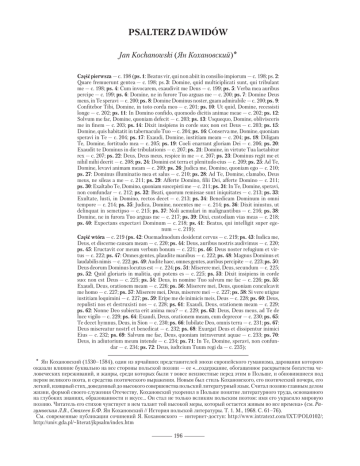 PSALTERZ DAWIDÓW Jan Kochanowski (Ян Кохановский)* Część pierwsza — с. 198 (рs. 1: Beatus vir, qui non abiit in consilio impiorum — с. 198; рs. 2: Quare fremuerunt gentea — с. 198; рs. 3: Domine, quid multiciplicati sunt, qui tribulant me — с. 198; рs. 4: Cum invocarem, exaudivit me Deus — с. 199; рs. 5: Verba mea auribus percipe — с. 199; рs. 6: Domine, ne in furore Tuo arguas me — с. 200; рs. 7: Domine Deus meus, in Te speravi — с. 200; рs. 8: Domine Dominus noster, guam admirabile — с. 200; рs. 9: Confitebor Tibi, Domine, in toto corda meo — с. 201; рs. 10: Ut quid, Domine, recessisti longe — с. 202; рs. 11: In Domino confido, quomodo dicitis animae meae — с. 202; рs. 12: Solvum me fac, Domine, quoniam defecit — с. 203; рs. 13: Usquequo, Domine, oblivisceris me in finem — с. 203; рs. 14: Dixit insipiens in corde suo; non est Deus — с. 203; рs. 15: Domine, quis habitatit in tabernaculo Tuo — с. 204; рs. 16: Conserva me, Domine, quoniam speravi in Te — с. 204; рs. 17: Exaudi, Domine, iustitiam meam — с. 204; рs. 18: Diligam Te, Domine, fortitudo mea — с. 205; рs. 19: Coeli enarrant gloriam Dei — с. 206; рs. 20: Exaudit te Dominus in die tribulationis — с. 207; рs. 21: Domine, in virtute Tua laetabitur rex — с. 207; рs. 22: Deus, Deus meus, respice in me — с. 207; рs. 23: Dominus regit me et nihil mihi deerit — с. 208; рs. 24: Domini est terra et plenitudo eius — с. 209; рs. 25: Ad Te, Domine, levavi animam meam — с. 209; рs. 26: Judica me, Domine, quoniam ego — с. 210; рs. 27: Dominus illuminatio mea et salus — с. 210; рs. 28: Ad Te, Domine, clamabo, Deus meus, ne sileas a me — с. 211; рs. 29: Afferte Domino, filii Dei, afferte Domino — с. 211; рs. 30: Exaltabo Te, Domino, quoniam suscepisti me — с. 211; рs. 31: In Te, Domine, speravi, non comfundar — с. 212; рs. 32: Beati, quorum remissae sunt iniquitates — с. 213; рs. 33: Exultate, lusti, in Domino, rectos decet — с. 213; рs. 34: Benedicam Dominum in omni tempore — с. 214; рs. 35: Judica, Domine, nocentes me — с. 214; рs. 36: Dixit iniustus, ut delinquat in semetipso — с. 215; рs. 37: Noli aemulari in malignantibus — с. 216; рs. 38: Domine, ne in furora Tuo arguas me — с. 217; рs. 39: Dixi, custodiam vias meas — с. 218; рs. 40: Expectans expectavi Dominum — с. 218; рs. 41: Beatus, qui intelligit super egenum — с. 219); Część wtóra — с. 219 (рs. 42: Ouemadmodum desiderat cervus — с. 219; рs. 43: Iudica me, Deus, et discerne causam meam — с. 220; рs. 44: Deus, auribus nostris audivimus — с. 220; рs. 45: Eructavit cor meum verbum bonum — с. 221; рs. 46: Deus noster refugium et virtus — с. 222; рs. 47: Omnes gentes, plaudite manibus — с. 222; рs. 48: Magnus Dominus et laudabilis nimis — с. 222; рs. 49: Audite haec, omnes gentes, auribus percipite — с. 223; рs. 50: Deus deorum Dominus locutus est — с. 224; рs. 51: Miserere mei, Deus, secundum — с. 225; рs. 52: Quid gloriaris in malitia, qui potens es — с. 225; рs. 53: Dixit insipiens in corde suo: non est Deus — с. 225; рs. 54: Deus, in nomine Tuo salvum me fac — с. 226; рs. 55: Exaudi, Deus, orationem meam — с. 226; рs. 56: Miserere mei, Deus, quoniam conculcavit me homo — с. 227; рs. 57: Miserere mei, Deus, miserere mei — с. 227; рs. 58: Si vere utigue iustitiam loquimini — с. 227; рs. 59: Eripe me de inimicis meis, Deus — с. 228; рs. 60: Deus, repulisti nos et destruxisti nos — с. 228; рs. 61: Exaudi, Deus, orationem meam — с. 229; рs. 62: Nonne Deo subiecta erit anima mea? — с. 229; рs. 63: Deus, Deus meus, ad Te de luce vigilo — с. 229; рs. 64: Exaudi, Deus, orationem meam, cum deprecor — с. 230; рs. 65: Te decet hymnus, Deus, in Sion — с. 230; рs. 66: Iubilate Deo, omnis terra — с. 231; рs. 67: Deus misereatur nostrI et benedicat — с. 232; рs. 68: Exurgat Deus et dissipentur inimici Eius — с. 232; рs. 69: Salvum me fac, Deus, quoniam intraverunt aquae — с. 233; рs. 70: Deus, in adiutorium meum intende — с. 234; рs. 71: In Te, Domine, speravi, non confundar — с. 234; рs. 72: Deus, iudtcium Tuum regi da — с. 235); * Ян Кохановский (1530–1584), один из ярчайших представителей эпохи европейского гуманизма, дарования которого оказали влияние буквально на все стороны польской поэзии — ее «...содержание, обогащенное раскрытием богатства человеческих переживаний, и жанры, среди которых были т вовсе неизвестные перед этим в Польше, и обновившиеся под пером великого поэта, и средства поэтического выражения. Новым был стиль Кохановского, его поэтический почерк, его легкий, изящный стих, доведенный до высокого совершенства польский литературный язык. Считал поэзию главным делом жизни, формой своего служения Отечеству, Кохановский укоренил в Польше понятие литературного труда, основанного на глубоких знаниях, образованности и вкусе... Он стал не только великим польским поэтом: имя его украсило мировую поэзию. Читатель его стихов чувствует в нем талант той высокой меры, который остается живым во все времена» (см. Разумовская Л.В., Стахее
