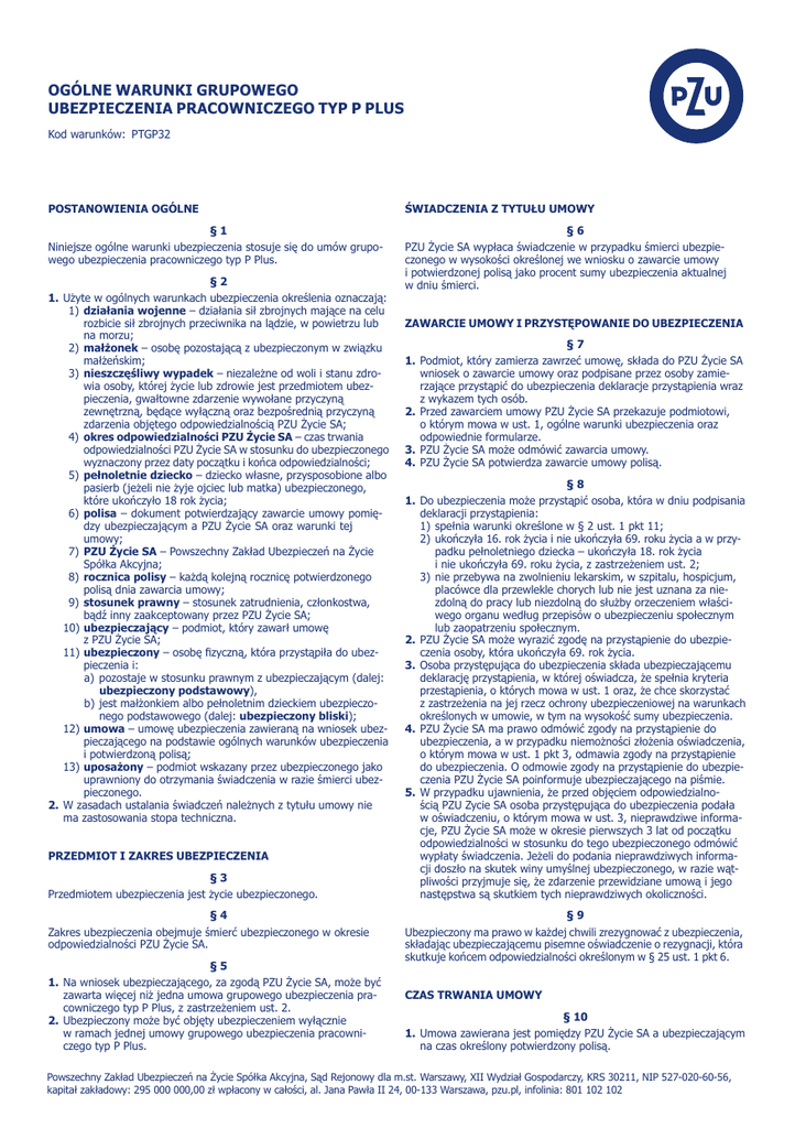 OGÓLNE WARUNKI GRUPOWEGO UBEZPIECZENIA PRACOWNICZEGO TYP P PLUS Kod warunków: PTGP32 POSTANOWIENIA OGÓLNE ŚWIADCZENIA Z TYTUŁU UMOWY § 1 Niniejsze ogólne warunki ubezpieczenia stosuje się do umów grupowego ubezpieczenia pracowniczego typ P Plus. § 6 PZU Życie SA wypłaca świadczenie w przypadku śmierci ubezpieczonego w wysokości określonej we wniosku o zawarcie umowy i potwierdzonej polisą jako procent sumy ubezpieczenia aktualnej w dniu śmierci. § 2 1.Użyte w ogólnych warunkach ubezpieczenia określenia oznaczają: 1) działania wojenne – działania sił zbrojnych mające na celu rozbicie sił zbrojnych przeciwnika na lądzie, w powietrzu lub na morzu; 2) małżonek – osobę pozostającą z ubezpieczonym w związku małżeńskim; 3) nieszczęśliwy wypadek – niezależne od woli i stanu zdrowia osoby, której życie lub zdrowie jest przedmiotem ubezpieczenia, gwałtowne zdarzenie wywołane przyczyną zewnętrzną, będące wyłączną oraz bezpośrednią przyczyną zdarzenia objętego odpowiedzialnością PZU Życie SA; 4) okres odpowiedzialności PZU Życie SA – czas trwania odpowiedzialności PZU Życie SA w stosunku do ubezpieczonego wyznaczony przez daty początku i końca odpowiedzialności; 5) pełnoletnie dziecko – dziecko własne, przysposobione albo pasierb (jeżeli nie żyje ojciec lub matka) ubezpieczonego, które ukończyło 18 rok życia; 6) polisa – dokument potwierdzający zawarcie umowy pomiędzy ubezpieczającym a PZU Życie SA oraz warunki tej umowy; 7) PZU Życie SA – Powszechny Zakład Ubezpieczeń na Życie Spółka Akcyjna; 8) rocznica polisy – każdą kolejną rocznicę potwierdzonego polisą dnia zawarcia umowy; 9) stosunek prawny – stosunek zatrudnienia, członkostwa, bądź inny zaakceptowany przez PZU Życie SA; 10)ubezpieczający – podmiot, który zawarł umowę z PZU Życie SA; 11)ubezpieczony – osobę fizyczną, która przystąpiła do ubezpieczenia i: a) pozostaje w stosunku prawnym z ubezpieczającym (dalej: ubezpieczony podstawowy), b)jest małżonkiem albo pełnoletnim dzieckiem ubezpieczonego podstawowego (dalej: ubezpieczony bliski); 12)umowa – umowę ubezpieczenia zawieraną na wniosek ubezpieczającego na podstawie ogólnych warunków ubezpieczenia i potwierdzoną polisą; 13)uposażony – podmiot wskazany przez ubezpieczonego jako uprawniony do otrzymania świadczenia w razie śmierci ubezpieczonego. 2.W zasadach ustalania świadczeń należnych z tytułu umowy nie ma zastosowania stopa techniczna. PRZEDMIOT I ZAKRES UBEZPIECZENIA § 3 Przedmiotem ubezpieczenia jest życie ubezpieczonego. § 4 Zakres ubezpieczenia obejmuje śmierć ubezpieczonego w okresie odpowiedzialności PZU Życie SA. § 5 1.Na wniosek ubezpieczającego, za zgodą PZU Życie SA, może być zawarta więcej niż jedna umowa grupowego ubezpieczenia pracowniczego typ P Plus, z zastrzeżeniem ust. 2. 2.Ubezpieczony może być objęty ubezpieczeniem wyłącznie w ramach jednej umowy grupowego ubezpieczenia pracowniczego typ P Plus. ZAWARCIE UMOWY I PRZYSTĘPOWANIE DO UBEZPIECZENIA § 7 1.Podmiot, który zamierza zawrzeć umowę, składa do PZU Życie SA wniosek o zawarcie umowy oraz podpisane przez osoby zamierzające przystąpić do ubezpieczenia deklaracje przystąpienia wraz z wykazem tych osób. 2.Przed zawarciem umowy PZU Życie SA przekazuje podmiotowi, o którym mowa w ust. 1, ogólne warunki ubezpieczenia oraz odpowiednie formularze. 3.PZU Życie SA może odmówić zawarcia umowy. 4.PZU Życie SA potwierdza zawarcie umowy polisą. § 8 1.Do ubezpieczenia może przystąpić osoba, która w dniu podpisania deklaracji przystąpienia: 1) spełnia warunki określone w § 2 ust. 1 pkt 11; 2) ukończyła 16. rok życia i nie ukończyła 69. roku życia a w przypadku pełnoletniego dziecka – ukończyła 18. rok życia i nie ukończyła 69. roku życia, z zastrzeżeniem ust. 2; 3) nie przebywa na zwolnieniu lekarskim, w szpitalu, hospicjum, placówce dla przewlekle chorych lub nie jest uznana za niezdolną do pracy lub niezdolną do służby orzeczeniem właściwego organu według przepisów o ubezpieczeniu społecznym lub zaopatrzeniu społecznym. 2.PZU Życie SA może wyrazić zgodę na przystąpienie do ubezpieczenia osoby, która ukończyła 69. rok życia. 3. Osoba przystępująca do ubezpieczenia składa ubezpieczającemu deklarację przystąpienia, w której oświadcza, że spełnia kryteria przestąpienia, o których mowa w ust. 1 oraz, że chce skorzystać z zastrzeżenia na jej rzecz ochrony ubezpieczeniowej na warunkach określonych w umowie, w tym na wysokość sumy ubezpieczenia. 4.PZU Życie SA ma prawo odmówić zgody na przystąpienie do ubezpieczenia, a w przypadku niemożności złożenia oświadczenia, o którym mowa w ust. 1 pkt 3, odmawia zgody na przystąpienie do ubezpieczenia. O odmowie zgody na przystąpienie do ubezpieczenia PZU Życie SA poinformuje ubezpieczającego na piśmie. 5.W przypadku ujawnienia, że przed objęciem odpowiedzialnością PZU Zycie SA osoba przystępująca do ubezpieczenia podała w oświadczeniu, o którym mowa w ust. 3, nieprawdziwe informacje, PZU Życie SA może w okresie pierwszych 3 lat od początku odpowiedzialności w stosunku do tego ubezpieczonego odmówić wypłaty świadczenia. Jeżeli do podania nieprawdziwych informacji doszło na skutek winy umyślnej ubezpieczonego, w razie wątpliwości przyjmuje się, że zdarzenie przewidziane umową i jego następstwa są skutkiem tych nieprawdziwych okoliczności. § 9 Ubezpieczony ma prawo w każdej chwili zrezygnować z ubezpieczenia, składając ubezpieczającemu pisemne oświadczenie o rezygnacji, która skutkuje końcem odpowiedzialności określonym w § 25 ust. 1 pkt 6. CZAS TRWANIA UMOWY § 10 1.Umowa zawierana jest pomiędzy PZU Życie SA a ubezpieczającym na czas określony potwierdzony polisą. Powszechny Zakład Ubezpieczeń na Życie Spółka Akcyjna, Sąd Rejonowy dla m.st. Warszawy, XII Wydział Gospodarczy, KRS 30211, 