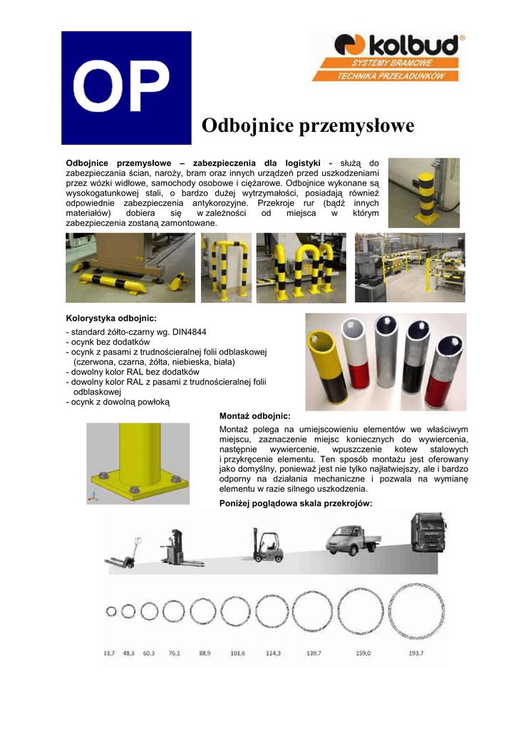 Odbojnice przemysłowe Odbojnice przemysłowe – zabezpieczenia dla logistyki - słuŜą do zabezpieczania ścian, naroŜy, bram oraz innych urządzeń przed uszkodzeniami przez wózki widłowe, samochody osobowe i cięŜarowe. Odbojnice wykonane są wysokogatunkowej stali, o bardzo duŜej wytrzymałości, posiadają równieŜ odpowiednie zabezpieczenia antykorozyjne. Przekroje rur (bądź innych materiałów) dobiera się w zaleŜności od miejsca w którym zabezpieczenia zostaną zamontowane. Kolorystyka odbojnic: - standard Ŝółto-czarny wg. DIN4844 - ocynk bez dodatków - ocynk z pasami z trudnościeralnej folii odblaskowej (czerwona, czarna, Ŝółta, niebieska, biała) - dowolny kolor RAL bez dodatków - dowolny kolor RAL z pasami z trudnościeralnej folii odblaskowej - ocynk z dowolną powłoką MontaŜ odbojnic: MontaŜ polega na umiejscowieniu elementów we właściwym miejscu, zaznaczenie miejsc koniecznych do wywiercenia, następnie wywiercenie, wpuszczenie kotew stalowych i przykręcenie elementu. Ten sposób montaŜu jest oferowany jako domyślny, poniewaŜ jest nie tylko najłatwiejszy, ale i bardzo odporny na działania mechaniczne i pozwala na wymianę elementu w razie silnego uszkodzenia. PoniŜej poglądowa skala przekrojów: ODBOJNICE SŁUPOWE Stosowane jako ochrona naroŜników bram zarówno wewnątrz jak i zewnątrz, równieŜ do ochrony naroŜników budynków, maszyn, regałów itp. Wypełnione betonem naleŜą do najbardziej wytrzymałych zabezpieczeń. Dostępne w wysokościach od 200mm Dostępne średnice 33,7 – 323,9 mm Orientacyjne konfiguracje: Ilustracja Nazwa produktu i wymiary Kod produktu Odbojnica słupowa, średnica 76mm, wysokość 600mm CM.0S06H Odbojnica słupowa, średnica 76mm, wysokość 1000mm CM.0S10H Odbojnica słupowa, średnica 76mm, wysokość 1200mm CM.0S12H Odbojnica słupowa, średnica 108mm, wysokość 600mm CM.0S06X Odbojnica słupowa, średnica 108mm, wysokość 1200mm CM.0S12X Odbojnica słupowa, średnica 159mm, wysokość 300mm CM.0S03XH Odbojnica słupowa, średnica 159mm, wysokość 600mm CM.0S06XH Odbojnica słupowa, średnica 159mm, wysokość 1200mm CM.0S12XH ODBOJNICE PRZYZIEMNE PROSTE Stosowane jako ochrona ścian, naroŜników, maszyn i urządzeń. UŜywane równieŜ do wyznaczenia ścieŜek komunikacyjnych. MoŜliwość zamówienia niestandardowych długości dzięki stosowaniu tulejek łączących. Dostępny w wysokościach od 100mm. Dostępne średnice 33,7 – 139,7 mm Dostępne długości 250 mm - ? Orientacyjne konfiguracje: Ilustracja Nazwa produktu i wymiary Kod produktu Odbojnica przyziemna prosta, średnica 60mm, długość 700mm, wysokość 110mm CM.0PP0701L Odbojnica przyziemna prosta, średnica 60mm, długość 1200mm, wysokość 110mm CM.0PP1201L Odbojnica przyziemna prosta, średnica 76mm, długość 300mm, wysokość 350mm CM.0PP0303H Odbojnica przyziemna prosta, średnica 76mm, długość 500mm, wysokość 350mm CM.0PP0503H Odbojnica przyziemna prosta, średnica 76mm, długość 750mm, wysokość 350mm CM.0PP0703H Odbojnica przyziemna prosta, średnica 76mm, długość 1000mm, wysokość 350mm CM.0PP1003H Odbojnica przyziemna prosta, średnica 76mm, długość 1500mm, wysokość 350mm CM.0PP1503H Odbojnica przyziemna prosta, średnica 76mm, długość 500mm, wysokość 600mm CM.0PP0506H Odbojnica przyziemna prosta, średnica 76mm, długość 750mm, wysokość 600mm CM.0PP0706H Odbojnica przyziemna prosta, średnica 76mm, długość 1000mm, wysokość 600mm CM.0PP1006H Odbojnica przyziemna prosta, średnica 76mm, długość 1500mm, wysokość 600mm CM.0PP1506H Odbojnica przyziemna prosta, średnica 76mm, długość 500mm, wysokość 1000mm CM.0PP0510H Odbojnica przyziemna prosta, średnica 76mm, długość 750mm, wysokość 1000mm CM.0PP0710H Odbojnica przyziemna prosta, średnica 76mm, długość 1000mm, wysokość 1000mm CM.0PP1010H Odbojnica przyziemna prosta, średnica 76mm, długość 1500mm, wysokość 1000mm CM.0PP1510H Odbojnica przyziemna prosta, średnica 76mm, długość 500mm, wysokość 1200mm CM.0PP0512H Odbojnica przyziemna prosta, średnica 76mm, długość 750mm, wysokość 1200mm CM.0PP0712H Odbojnica przyziemna prosta, średnica 76mm, długość 1000mm, wysokość 1200mm CM.0PP1012H Odbojnica przyziemna prosta, średnica 76mm, długość 1500mm, wysokość 1200mm CM.0PP1512H Odbojnica przyziemna prosta, średnica 108mm, długość 600mm, wysokość 600mm CM.0PP0606X Odbojnica przyziemna prosta, średnica 108mm, długość 1200mm, wysokość 600mm CM.0PP1206X Odbojnica przyziemna prosta, średnica 108mm, długość 600mm, wysokość 1200mm CM.0PP0612X Odbojnica przyziemna prosta, średnica 108mm, długość 1200mm, wysokość 1200mm CM.0PP1212X ODBOJNICE PRZYZIEMNE „L” Stosowane jako ochrona ścian, naroŜników, maszyn i urządzeń. UŜywane równieŜ do wyznaczenia ścieŜek komunikacyjnych. MoŜliwość zamówienia niestandardowych długości dzięki stosowaniu tulejek łączących. MoŜliwość zamówienia odbojnicy o róŜnych wymiarach ramion. Dostępny w wysokościach od 100mm Dostępne średnice 33,7 – 139,7 mm Dostępne długości 250 mm - ? Orientacyjne konfiguracje: Ilustracja Nazwa produktu i wymiary Kod produktu Odbojnica przyziemna „L”, średnica 76mm, wymiary zew. 500x500mm, wysokość 350mm CM.0PL03H Odbojnica przyziemna „L”, średnica 76mm, wymiary zew. 500x500mm, wysokość 600mm CM.0PL06H Odbojnica przyziemna „L”, średnica 76mm, wymiary zew. 500x500mm, wysokość 1000mm CM.0PL10H Odbojnica przyziemna „L”, średnica 76mm, wymiary zew. 500x500mm, wysokość 1200mm CM.0PL12H Odbojnica przyziemna „L”, średnica 108mm, wymiary zew. 600x600mm, wysokość 600mm CM.0PL06X Odbojnica przyziemna „L”, średnica 108mm, wymiary zew. 600x600mm, wysokość 1200mm CM.OPL12X Odbojnica przyziemna „L”, średnica 76mm, wymiary wew. 450x450mm, wysokość 600mm CM.0PL0644 Odbojnica przyziemna „L”, średnica 76mm, wymiary wew. 600x400mm, wysokość 600mm