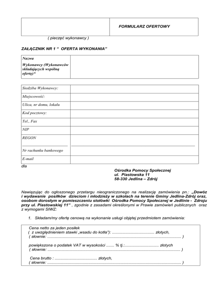 FORMULARZ OFERTOWY ( pieczęć wykonawcy ) ZAŁĄCZNIK NR 1 “ OFERTA WYKONANIA” Nazwa Wykonawcy (Wykonawców składających wspólną ofertę)* Siedziba Wykonawcy: Miejscowość: Ulica, nr domu, lokalu Kod pocztowy: Tel., Fax NIP REGON ______________________ ____________________________________________________________ Nr rachunku bankowego E-mail dla Ośrodka Pomocy Społecznej ul. Piastowska 11 58-330 Jedlina – Zdrój Nawiązując do ogłoszonego przetargu nieograniczonego na realizację zamówienia pn.: „Dowóz i wydawanie posiłków dzieciom i młodzieży w szkołach na terenie Gminy Jedlina-Zdrój oraz, osobom dorosłym w pomieszczeniu stołówki Ośrodka Pomocy Społecznej w Jedlinie - Zdroju przy ul. Piastowskiej 11” , zgodnie z zasadami określonymi w Prawie zamówień publicznych oraz z wymogami SIWZ: 1. Składam/my ofertę cenową na wykonanie usługi objętej przedmiotem zamówienia: Cena netto za jeden posiłek ( z uwzględnieniem stawki „wsadu do kotła”): ..................................... złotych, ( słownie: ..................................................................................................................... ) powiększona o podatek VAT w wysokości ....... % tj.:.............................. złotych ( słownie: .................................................................................................................... ) Cena brutto : ..................................... złotych, ( słownie: ..................................................................................................................... ) 2. Składając niniejszą ofertę jednocześnie oświadczamy, że: 1) zdobyłem/liśmy wszelkie niezbędne informacje, które były potrzebne do prawidłowego przygotowania oferty oraz, że wyceniłem/liśmy wszystkie elementy niezbędne do prawidłowego wykonania umowy, 2) akceptujemy warunki określone przez Zamawiającego w SIWZ, w tym w szczególności dotyczące postanowień umowy i zobowiązujemy się w przypadku wyboru naszej oferty do zawarcia umowy w miejscu i terminie wyznaczonym przez Zamawiającego, 3) gwarantujemy wykonanie przedmiotu zamówienia w terminie wskazanym przez Zamawiającego tj. od dnia 2 września 2013r do dnia 30 czerwca 2014 r., 4) usługę objętą zamówieniem wykonam/y sam/i, 5) uważam/y się za związanych niniejszą ofertą przez okres 30 dni, 6) wszystkie strony oferty, łącznie ze wszystkimi załącznikami są ponumerowane i cała oferta składa się z ............ stron, 7) dokonaliśmy / nie dokonaliśmy podziału oferty na część jawną i niejawną. Część jawna nie zawiera informacji i dokumentów stanowiących tajemnicę przedsiębiorstwa w rozumieniu przepisów o zwalczaniu nieuczciwej konkurencji i może być ogólnie udostępniona, 8) za wyjątkiem informacji i dokumentów zawartych w ofercie na stronach ................ niniejsza oferta oraz wszystkie załączniki do niej są jawne i nie zawierają informacji stanowiących tajemnicę przedsiębiorstwa w rozumieniu przepisów o zwalczaniu nieuczciwej konkurencji, 9) przedstawiciel Wykonawcy uprawniona/ny do z Zamawiającym ............................................................................................. kontaktów ( imię i nazwisko, tel. /fax ) 3. W załączeniu przedkładamy następujące dokumenty stanowiące integralną część naszej oferty: 1. .............................................................................................................................. 2. .............................................................................................................................. 3. .............................................................................................................................. 4. .............................................................................................................................. 5. .............................................................................................................................. 6. .............................................................................................................................. 7. .............................................................................................................................. 8. .............................................................................................................................. 9. .............................................................................................................................. 10. .............................................................................................................................. 11. .............................................................................................................................. .................................. dnia ........................ 2013 r. Podpis osób uprawnionych do składania oświadczeń woli w imieniu Wykonawcy .................................................................... * niepotrzebne skreślić