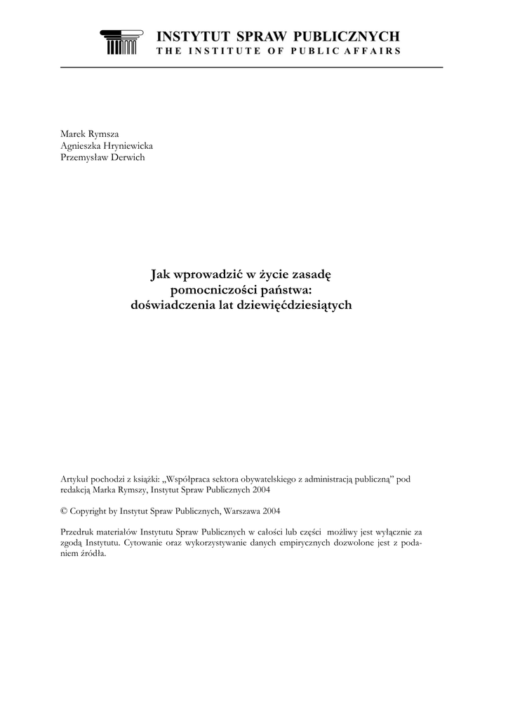 Marek Rymsza Agnieszka Hryniewicka Przemysław Derwich Jak wprowadzić w życie zasadę pomocniczości państwa: doświadczenia lat dziewięćdziesiątych Artykuł pochodzi z książki: „Współpraca sektora obywatelskiego z administracją publiczną” pod redakcją Marka Rymszy, Instytut Spraw Publicznych 2004 © Copyright by Instytut Spraw Publicznych, Warszawa 2004 Przedruk materiałów Instytutu Spraw Publicznych w całości lub części możliwy jest wyłącznie za zgodą Instytutu. Cytowanie oraz wykorzystywanie danych empirycznych dozwolone jest z podaniem źródła.