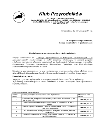 Klub Przyrodników ul. 1 Maja 22, 66-200-Swiebodzin Konto: BZ WBK SA o/Świebodzin nr 28 1090 1593 0000 0001 0243 0645 tel./fax 068 3828236, e-mail: [email protected], http:// www.kp.org.pl NIP: 927-15-06-791 Świebodzin, dn. 19 września 2011 r. Do wszystkich Wykonawców, którzy złożyli ofertę w postępowaniu Zawiadomienie o wyborze najkorzystniejszej oferty dotyczy zamówienia pn. „Zabiegi agrotechniczne w kolekcjach zachowawczych i w agrorezerwatach” realizowanego w trybie zapytania ofertowego, w ramach projektu „Ochrona zagrożonych chwastów segetalnych na Opolszczyźnie” finansowanego ze środków Regionalnego Programu Operacyjnego Województwa Opolskiego oraz Wojewódzkiego Funduszu Ochrony Środowiska w Opolu Niniejszym zawiadamiam, że w w/w postępowaniu wybrana została oferta złożona przez Adam Ulbrych, Gospodarstwo Rozalia, Komorzno-Lubiatowice 1, 46-264 Krzywiczyn. Uzasadnienie wyboru: Jedynym kryterium wyboru ofert w w/w postępowaniu była cena. Oferta wybranego Wykonawcy zawierała najniższą cenę – 108 000,00 zł brutto i w związku z tym była to oferta najkorzystniejsza. Zbiorcze zestawienie złożonych ofert Numer Firma (nazwa) lub nazwisko oraz adres Wykonawcy oferty Adam Ulbrych, Gospodarstwo Rozalia, Komorzno-Lubiatowice 1, 461. 264 Krzywiczyn BIOTOS Analizy i ekspertyzy przyrodnicze, ul. Wieluńska 4, 45-323 2. Opole FAGUS Zagospodarowanie Terenów Zieleni Marek Kukla, ul. Podleska 3. 11/17, 43-190 Mikołów FLOWER-POWER Maciej Proszewski, Knieja ul. Szkolna 8, 46-048 4. Ząbkowice Dendroflora Karolina Kurdziel-Olszanowska, Zawada, ul. Szkolna 4, 5. 46-022 Luboszyce Oferowana cena brutto 108000,00 zł 120000,00 zł 134500,00 zł 124300,00 zł 117500,00 zł