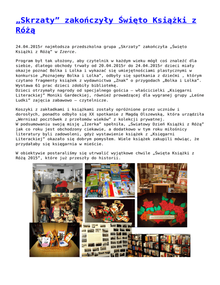 „Skrzaty” zakończyły Święto Książki z Różą 24.04.2015r najmłodsza przedszkolna grupa „Skrzaty” zakończyła „Święto Książki z Różą” w Izerce. Program był tak ułożony, aby czytelnik w każdym wieku mógł coś znaleźć dla siebie, dlatego obchody trwały od 20.04.2015r do 24.04.2015r dzieci miały okazje poznać Bolka i Lolka i wykazać się umiejętnościami plastycznymi w konkursie „Poznajemy Bolka i Lolka”, odbyły się spotkania z dziećmi , którym czytano fragmenty książek z wydawnictwa „Znak” o przygodach „Bolka i Lolka”. Wystawa 61 prac dzieci zdobiły bibliotekę. Dzieci otrzymały nagrody od specjalnego gościa – właścicielki „Księgarni Literackiej” Moniki Gardeckiej, również prowadzącej dla wygranej grupy „Leśne Ludki” zajęcia zabawowo – czytelnicze. Koszyki z zakładkami i książkami zostały opróżnione przez uczniów i dorosłych, ponadto odbyło się XX spotkanie z Magdą Olszewską, która urządziła „Wernisaż pocztówek z przełomów wieków” z kolekcji prywatnej. W podsumowaniu swoją misję „Izerka” spełniła, „Światowy Dzień Książki z Różą” jak co roku jest obchodzony ciekawie, a dodatkowo w tym roku miłośnicy literatury byli zadowoleni, gdyż wystawienie książek z „Księgarni Literackiej” okazało się dobrym pomysłem. Wiele książek zakupili mówiąc, że przydałaby się księgarnia w mieście. W obiektywie postaraliśmy się utrwalić wyjątkowe chwile „Święta Książki z Różą 2015”, które już przeszły do historii. Bolek i Lolek odkrywany na nowo Nie sądziłyśmy , wspólnie z organizatorką konkursu Moniką Gardecką – właścicielką „ Księgarni Literackiej ”,iż takie zainteresowanie wywoła konkurs plastyczny Poznajemy Bolka i Lolka. Wpłynęły ogółem 62 prace, były od dzieci, ale też wykonane przez grupy przedszkolne. Wszystkie nagrody zostały ufundowane przez panią Monikę i wydawnictwo Znak. Główną nagrodę przyznano grupie Leśne Ludki za wykonanie plakatu Geometryczny Bolek i Lolek dlatego też w czwartek 23.04. tj. w samo Święto Książki z Różą odbyły się zajęcia czytelniczo – zabawowe prowadzone przez samą panią Monikę, która wprowadziła różne formy zajęć pogadankę: Jak długo są z nami Bolek i Lolek, zajęcia plastyczne, na których dzieci kolorowały postaci chłopców. Dzieci wysłuchały fragmentu książki o Bolku i Lolku Genialni detektywi. Przedszkolaki z chęcią nauczyły się krótkiej piosenki : Bolek i Lolek to braciszków dwóch Bolek nie ma zęba Lolek nie ma dwóch Tola i Ola to siostrzyczki dwie Tola chodzi do przedszkola Ola jeszcze nie. Na koniec zajęć pani Monika wręczyła nagrodę dla całej grupy Leśne Ludki , ponadto każde dziecko również otrzymało indywidualnie książeczkę z serii Mądra Mysz. Dzieci poczęstowane zostały również słodkimi pierniczkami i obdarowane kolorowymi balonami z wizerunkami naszych bohaterów. Zostały przyznane nagrody za najlepsze prace: I miejsce – Zosia Salawa II miejsce – Iga Jurczak III miejsce – Tobiasz Rudnicki Wyróżniono również : Maję Płodzień, Anię Jabłonowską i Dominika Adama. Przekazano również dwie książki dla biblioteki szkolnej i przedszkola: Bolek i Lolek. Łowcy tajemnic wydawnictwa „Znak. Wspólnie możemy podsumować , iż był to dobry pomysł , a zaangażowanie Moniki Gardeckiej nas wzruszyło i jesteśmy pewni , że ta współpraca jeszcze będzie kontynuowana. Wernisaż pocztówek z Bad Flinsberg – XX spotkanie z Magdą Olszewską Spotkanie odbyło się 20.04.2015r w „Izerce” i było nietypowe. Nasza lokalna tropicielka historii, ciekawostek, tajemnic dawnego Świeradowa – Zdroju zaproponowała urządzić „Wernisaż pocztówek z Bad Flinsberg” składający się z kolekcji prywatnej, zbieranej przez lata przez samą Magdę Olszewską. Pocztówki dotyczące Domu Zdrojowego zostały podzielone na poszczególne wieki tj. XVIII / XIX wraz z krótką historią tego okresu, gdzie można wyczytać m.in.: „Liczba kuracjuszy rosła z roku na rok, dlatego też Carl Gothard von Schaffgotsch, pan tych ziem, nakazał wybudować kolejny dom źródlany. Powstały w 1768 roku nowy obiekt stał się także pierwszą siedzibą administracji uzdrowiska. Świeradów zyskiwał coraz większą sławę. W 1781 r przybył do kurortu wielki kanclerz von Cramer i z tej okazji też odbył się pierwszy wielki bal kuracjuszy… Na drugiej tablicy Magda Olszewska umieściła pocztówki z XIX /XX wieku, oraz krótką historię tego okresu. I czytamy: m.in.: „Po pożarze starych zabudowań zdrojowych, rodzina von Schaffgotsch postanowiła wybudować nowy dom zdrojowy. 01.05.1898r rozpoczęto prace przygotowujące plac budowy. Przekopano ponad 60000m³ ziemi, żeby obok siebie mogły stanąć budynki zdrojowe uzupełniane o tarasy i parki. Materiał budowlany dostarczono furmankami z dworca kolejowego w Mirsku, a na placu budowy pracowało do 600 pracowników dziennie”. Trzecia tablica poświęcona była historii Domu Zdrojowego już XX i XXI wieku i czytamy m.in.: „W okresie II wojny światowej dom zdrojowy nadal pełnił swoją funkcję. Na kurację przyjeżdżali nie tylko goście z Niemiec ale także żołnierze na rekonwalescencje”… … A w zakończeniu aktualną informację „W 2014r w podpiwniczeniu hali spacerowej zostało otwarte pierwsze w Polsce muzeum zdrojowe, w którym można zobaczy wykorzystywane do celów leczniczych źródła wody mineralnej”. Wystawę będzie można oglądać do 29 września 2015r w godzinach otwarcia „Izerki”. My się cieszymy, że do stałych już miłośników opowieści Magdy dołączyły nowe osoby. Konsultacje informatyczne dla Seniorów Dnia 25.04.2015r po raz II odbędą się konsultacje informatyczne dla Seniorów, od godz. 10:00 do 12:00 będzie można zasięgnąć porady, indywidualnej konsultacji z zakresu obsługi mediów. Serdecznie zapraszamy. Mistrz 