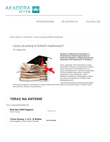 WYSZUKIWANIE REJESTRACJA ZALOGUJ SIĘ Strona główna / Aktualności / Laury za pracę w kołach naukowych Laury za pracę w kołach naukowych 7 maja 2015 Studenci i doktoranci Uniwersytetu w Białymstoku zdobyli drugie miejsca w konkursie referatów na Międzynarodowym Seminarium Kół Naukowych w Olsztynie. Anna Jastrząb i Piotr Stasiewicz z Koła Chemików „Pozyton” przygotowali referat, który startował w konkursie prac ona temat kształtowania i ochrony środowiska. Z kolei studentki Agnieszka CzarzbonPeplińska i Anna Puławska z Koła Młodych Teoretyków Pedagogiki znalazły się w gronie zwycięzców w sekcji nauk pedagogicznych. Jak poinformowała rzecznik Uniwersytetu Katarzyna Dziedzik w seminarium wzięło udział około 600 osób z ponad 50 uczelni z Polski, Czech, Litwy, Włoch, Ukrainy i Kazachstanu. TERAZ NA ANTENIE Error: unexpected fgets() fail Red Hot Chili Peppers Give It Away Teraz Gramy: L.U.C. & Rahim Hemnoglobina (Feat. Maria Peszek) zagraliśmy teraz gramy Radio Akadera Lubię to! Lubisz to. Ty i 3 252 inne osoby lubicie obiekt Radio Akadera. Kontakt Radio AKADERA PB ul. Zwierzyniecka 4, Białystok 15 - 333 tel.: 85 746 9999 [email protected] Biuro reklamy tel./fax.: (+48) 668 169 022 [email protected] Szef Muzyczny tel. 668 950 662 [email protected]