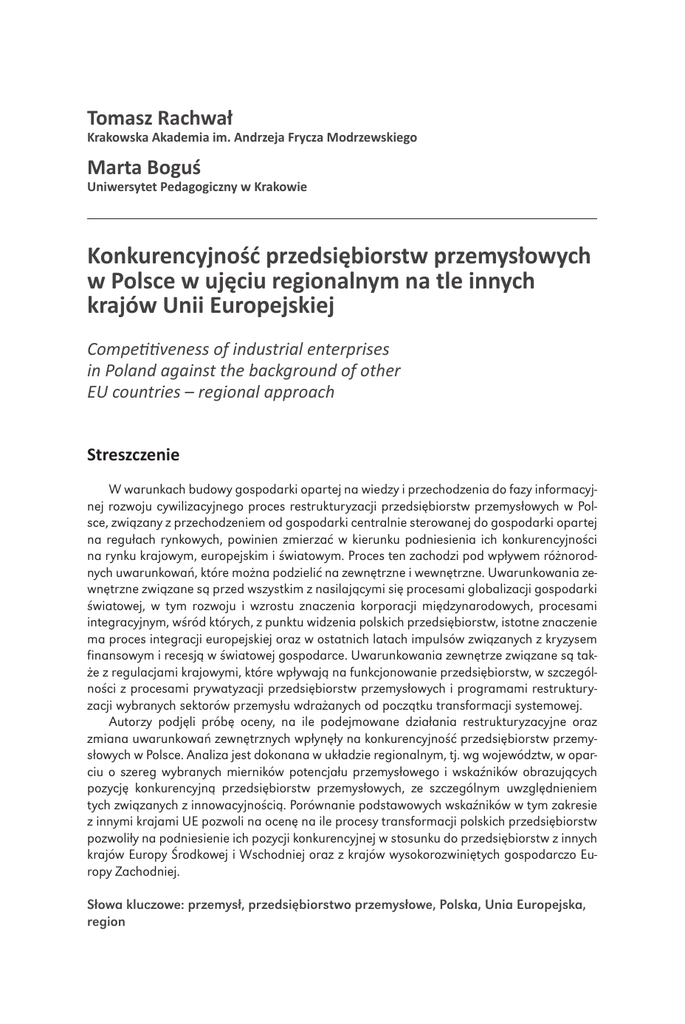Tomasz Rachwał Krakowska Akademia im. Andrzeja Frycza Modrzewskiego Marta Boguś Uniwersytet Pedagogiczny w Krakowie Konkurencyjność przedsiębiorstw przemysłowych w Polsce w ujęciu regionalnym na tle innych krajów Unii Europejskiej Competitiveness of industrial enterprises in Poland against the background of other EU countries – regional approach Streszczenie W warunkach budowy gospodarki opartej na wiedzy i przechodzenia do fazy informacyjnej rozwoju cywilizacyjnego proces restrukturyzacji przedsiębiorstw przemysłowych w Polsce, związany z przechodzeniem od gospodarki centralnie sterowanej do gospodarki opartej na regułach rynkowych, powinien zmierzać w kierunku podniesienia ich konkurencyjności na rynku krajowym, europejskim i światowym. Proces ten zachodzi pod wpływem różnorodnych uwarunkowań, które można podzielić na zewnętrzne i wewnętrzne. Uwarunkowania zewnętrzne związane są przed wszystkim z nasilającymi się procesami globalizacji gospodarki światowej, w tym rozwoju i wzrostu znaczenia korporacji międzynarodowych, procesami integracyjnym, wśród których, z punktu widzenia polskich przedsiębiorstw, istotne znaczenie ma proces integracji europejskiej oraz w ostatnich latach impulsów związanych z kryzysem finansowym i recesją w światowej gospodarce. Uwarunkowania zewnętrze związane są także z regulacjami krajowymi, które wpływają na funkcjonowanie przedsiębiorstw, w szczególności z procesami prywatyzacji przedsiębiorstw przemysłowych i programami restrukturyzacji wybranych sektorów przemysłu wdrażanych od początku transformacji systemowej. Autorzy podjęli próbę oceny, na ile podejmowane działania restrukturyzacyjne oraz zmiana uwarunkowań zewnętrznych wpłynęły na konkurencyjność przedsiębiorstw przemysłowych w Polsce. Analiza jest dokonana w układzie regionalnym, tj. wg województw, w oparciu o szereg wybranych mierników potencjału przemysłowego i wskaźników obrazujących pozycję konkurencyjną przedsiębiorstw przemysłowych, ze szczególnym uwzględnieniem tych związanych z innowacyjnością. Porównanie podstawowych wskaźników w tym zakresie z innymi krajami UE pozwoli na ocenę na ile procesy transformacji polskich przedsiębiorstw pozwoliły na podniesienie ich pozycji konkurencyjnej w stosunku do przedsiębiorstw z innych krajów Europy Środkowej i Wschodniej oraz z krajów wysokorozwiniętych gospodarczo Europy Zachodniej. Słowa kluczowe: przemysł, przedsiębiorstwo przemysłowe, Polska, Unia Europejska, region - Tomasz Rachwał, Marta Boguś - Wprowadzenie Transformacja systemu społeczno-gospodarczego w Polsce oraz w innych krajach Europy Środkowej i Wschodniej, związana z przechodzeniem od centralnego systemu zarządzania gospodarką do nowego systemu opartego na regułach gospodarki rynkowej oraz procesy integracji tych krajów z Unią Europejską, wpływają w dużym stopniu na głębokie przemiany funkcjonowania poszczególnych sektorów gospodarki narodowej, różnego typu przedsiębiorstw przemysłowych i usługowych oraz instytucji. Prowadzi to do przekształcania wykształconych uprzednio struktur gospodarczych, społecznych i kulturowych, w tym także struktury przestrzennej i działowej przemysłu. Proces przekształceń struktur przemysłowych, które w latach systemu nakazowo-rozdzielczego odgrywały wiodącą rolę w gospodarce Polski i innych krajów Europy Środkowej i Wschodniej, dokonuje się w wyniku zmian funkcjonowania jego podstawowych elementów, tj. poszczególnych przedsiębiorstw przemysłowych. Z punktu widzenia analizy i oceny procesów transformacji gospodarczej istotnym zagadnieniem badawczym wydaje się problematyka przemian roli sektora przemysłowego we współczesnej gospodarce oraz podnoszenia konkurencyjności tych przedsiębiorstw na rynkach krajowych i zagranicznych. W okresie wprowadzana nowego systemu gospodarki rynkowej w otoczeniu przedsiębiorstw pojawiły się nowe uwarunkowania ich funkcjonowania, związane głównie z mechanizmami konkurencji, które zaczęły mieć decydujący wpływ na funkcjonowanie przedsiębiorstw (Zioło 1994). Proces dostosowania się przedsiębiorstw przemysłowych do tych nowych warunków gospodarowania wymaga od nich przeprowadzenia głębokich zmian w funkcjonowaniu, prowadzących do podniesienia ich konkurencyjności. Przejawiają się one w: zmianach struktur własnościowych, organizacyjnych, zarządzania, racjonalizacji poziomu zatrudnienia, dostosowania produkowanego asortymentu do oczekiwań nabywców i związanych z tym modernizacji majątku produkcyjnego oraz przekształceń w źródłach zaopatrzenia, i w konsekwencji kierunkach zbytu. Zmiany te warunkują uczestnictwo krajowych przedsiębiorstw przemysłowych w globalnych procesach gospodarczych i integrację przemysłu krajów Europy Środkowej i Wschodniej z przemysłem światowym, zwłaszcza w drodze powiązań organizacyjnych, kapitałowych, technologicznych i rynkowych (Rachwał 2006a). Prowadzą one do likwidacji luki strukturalnej, która wystąpiła w związku z realizowaniem zasadniczo różnych modeli industrializacji w krajach Europy Środkowo-Wschodniej i krajach Europy Zachodniej, w których funkcjonowanie gospodarki narodowej oparte było i jest na regułach rynkowych. Należy podkreślić, że likwidacja tej luki jest istotna z punktu widzenia zaawansowa10 - Konkurencyjność przedsiębiorstw przemysłowych w Polsce… - nia procesów integracji gospodarczej zarówno krajów kandydujących, jak i nowych członków Unii Europejskiej z krajami rdzeniowymi tzw. starej Unii. W świetle powyższych przesłanek celem pracy jest analiza zmian roli przemysłu w gospodarce oraz próba oceny, na ile podejmowane działania restrukturyzacyjne oraz zmiana uwarunkowań zewnętrznych wpłynęły na konkurencyjność przedsiębiorstw przemysłowych w Polsce. Analiza jest dokonana w układzie regionalnym, tj. wg województw, w oparciu o szereg wybranych miernikó