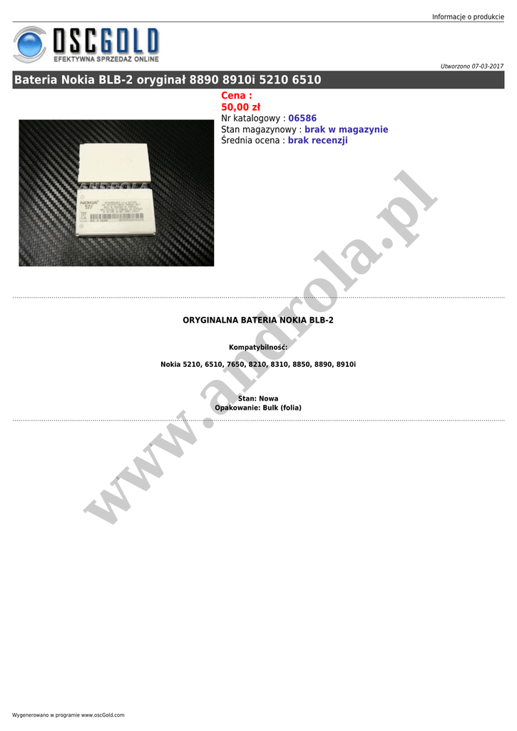 Informacje o produkcie Utworzono 07-03-2017 Bateria Nokia BLB-2 oryginał 8890 8910i 5210 6510 Cena : 50,00 zł ro la .p l Nr katalogowy : 06586 Stan magazynowy : brak w magazynie Średnia ocena : brak recenzji nd ORYGINALNA BATERIA NOKIA BLB-2 Kompatybilność: Nokia 5210, 6510, 7650, 8210, 8310, 8850, 8890, 8910i w w w .a Stan: Nowa Opakowanie: Bulk (folia) Wygenerowano w programie www.oscGold.com