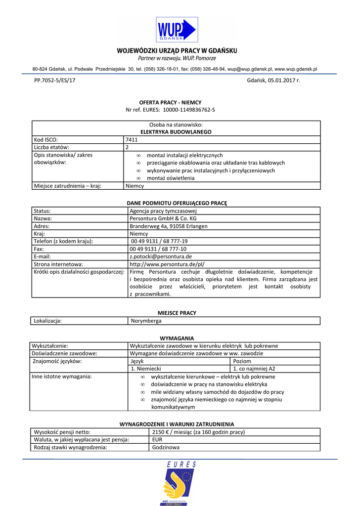 80-824 Gdańsk, ul. Podwale Przedmiejskie 30, tel. (058) 326-18-01, fax: (058) 326-48-94, [email protected], www.wup.gdansk.pl PP.7052-5/ES/17 Gdańsk, 05.01.2017 r. OFERTA PRACY - NIEMCY Nr ref. EURES: 10000-1149836762-S Osoba na stanowisko: ELEKTRYKA BUDOWLANEGO Kod ISCO: Liczba etatów: Opis stanowiska/ zakres obowiązków: Miejsce zatrudnienia – kraj: Status: Nazwa: Adres: Kraj: Telefon (z kodem kraju): Fax: E-mail: Strona internetowa: Krótki opis działalności gospodarczej: Lokalizacja: Wykształcenie: Doświadczenie zawodowe: Znajomość języków: Inne istotne wymagania: 7411 2 • • • • Niemcy montaż instalacji elektrycznych przeciąganie okablowania oraz układanie tras kablowych wykonywanie prac instalacyjnych i przyłączeniowych montaż oświetlenia DANE PODMIOTU OFERUJĄCEGO PRACĘ Agencja pracy tymczasowej Persontura GmbH & Co. KG Branderweg 4a, 91058 Erlangen Niemcy 00 49 9131 / 68 777-19 00 49 9131 / 68 777-10 [email protected] http://www.persontura.de/pl/ Firmę Persontura cechuje długoletnie doświadczenie, kompetencje i bezpośrednia oraz osobista opieka nad klientem. Firma zarządzana jest osobiście przez właścicieli, priorytetem jest kontakt osobisty z pracownikami. MIEJSCE PRACY Norymberga WYMAGANIA Wykształcenie zawodowe w kierunku elektryk lub pokrewne Wymagane doświadczenie zawodowe w ww. zawodzie Język Poziom 1. Niemiecki 1. co najmniej A2 • wykształcenie kierunkowe – elektryk lub pokrewne • doświadczenie w pracy na stanowisku elektryka • mile widziany własny samochód do dojazdów do pracy • znajomość języka niemieckiego co najmniej w stopniu komunikatywnym WYNAGRODZENIE I WARUNKI ZATRUDNIENIA Wysokość pensji netto: 2150 € / miesiąc (za 160 godzin pracy) Waluta, w jakiej wypłacana jest pensja: EUR Rodzaj stawki wynagrodzenia: Godzinowa 80-824 Gdańsk, ul. Podwale Przedmiejskie 30, tel. (058) 326-18-01, fax: (058) 326-48-94, [email protected], www.wup.gdansk.pl Dodatkowe świadczenia Nazwa firmy, z którą zostanie podpisana umowa: Rodzaj umowy: Liczba godzin tygodniowo: Zmiany i praca w dni wolne: Data rozpoczęcia: Wymagane dokumenty: Język, w którym muszą być sporządzone przedkładane dokumenty: Gdzie należy wysłać dokumenty: - diety i dodatki na dojazdy ujęte zostały w podanej pensji netto - wsparcie ze strony firmy od pierwszego dnia pracy. Firma towarzyszy podczas rozpoczęcia pracy u klienta, a w kolejnych tygodniach i miesiącach pracy utrzymuje regularny kontakt (również w języku polskim). Odpowiada na Państwa pytania i służy wsparciem podczas całego pobytu w Niemczech. - dla swoich pracowników firma wyszukuje i rezerwuje noclegi – jednoosobowe pokoje z dostępem do kuchni i możliwością przyrządzenia posiłków – koszt zakwaterowania pokrywa pracownik Persontura GmbH & Co. KG Umowa o pracę, pełen etat, czas nieokreślony 40 Możliwe Do uzgodnienia z pracodawcą SPOSÓB SKŁADANIA WNIOSKU CV niemiecki Zgłoszenia prosimy przesyłać drogą elektroniczną do doradcy EURES – w zależności od preferowanego miejsca spotkania rekrutacyjnego: Jelenia Góra, Wałbrzych Świdnica –do doradcy EURES [email protected] Katowice – [email protected] oraz do widomości do WUP Gdańsk: [email protected] W tytule maila proszę wpisać „ELEKTRYK BUDOWLANY Persontura ” oraz preferowane miejsce spotkania rekrutacyjnego (Jelenia Góra LUB Wałbrzych LUB Świdnica LUB Katowice). Osoby zakwalifikowane do rozmów zostaną poinformowane o dokładnym miejscu i godzinie spotkania. W przypadku zebrania niewielkiej liczby kandydatów, pracodawca zastrzega możliwość odwołania spotkania Rozmowy rekrutacyjne z pracodawcą odbędą się: 30.01.2017 r. w Jeleniej Górze, 31.01.2017 r. w Wałbrzychu, 31.01.2017 r. w Świdnicy. Początek lutego w Katowicach 80-824 Gdańsk, ul. Podwale Przedmiejskie 30, tel. (058) 326-18-01, fax: (058) 326-48-94, [email protected], www.wup.gdansk.pl Dane teleadresowe doradcy EURES lub przedstawiciela pracodawcy: Dodatkowe informacje: Doradca EURES - Marta Łyko, tel. (74) 886 65 46 e-mail: [email protected] Dolnośląski Wojewódzki Urząd Pracy ul Ogrodowa 5B 58-306 Wałbrzych Więcej informacji udziela p. Zygmunt Potocki, tel.: 00 49 9131 / 68 777-19, e-mail: [email protected] Agencja pracy tymczasowej Persontura GmbH & Co. KG oświadczyła, że prowadzi działalność zgodnie z przepisami obowiązującymi na terenie Niemiec. WAŻNOŚĆ 05.01.2017 r. Data publikacji: Termin przedkładania podań o pracę / zakończenia ważności oferty: Do odwołania Uprzejmie informujemy, że skontaktujemy się wyłącznie z wybranymi kandydatami. UWAGA: 1. Umowa z zagranicznym pracodawcą zostanie zawarta zgodnie z prawem kraju zatrudnienia. Oznacza to, że wszystkie roszczenia odnośnie do warunków, które obejmuje umowa, można kierować wyłącznie do odpowiedniego sądu w kraju zatrudnienia. Publiczne służby zatrudnienia (EURES) nie mogą pośredniczyć ani reprezentować pracownika w sądzie kraju zatrudnienia w przypadku sporu z pracodawcą. 2. Publiczne służby zatrudnienia (EURES) dokładają wszelkich starań, aby zapewnić rzetelność i wiarygodność ofert pracy zgłoszonych w lokalnym urzędzie pracy. Należy wyjaśnić, że oferta pracy została zgłoszona przez stronę trzecią i EURES nie odpowiada za ewentualne rozbieżności między warunkami pracy określonymi w ofercie pracy i warunkami oferowanymi przez potencjalnego pracodawcę. 3. Publiczne służby zatrudnienia (EURES) informują, że będą zbierać, przetwarzać i przekazywać potencjalnym pracodawcom zgodnie z przepisami dotyczącymi ochrony danych osobowych wszystkie dane osobowe dostarczone przez osoby poszukujące pracy.