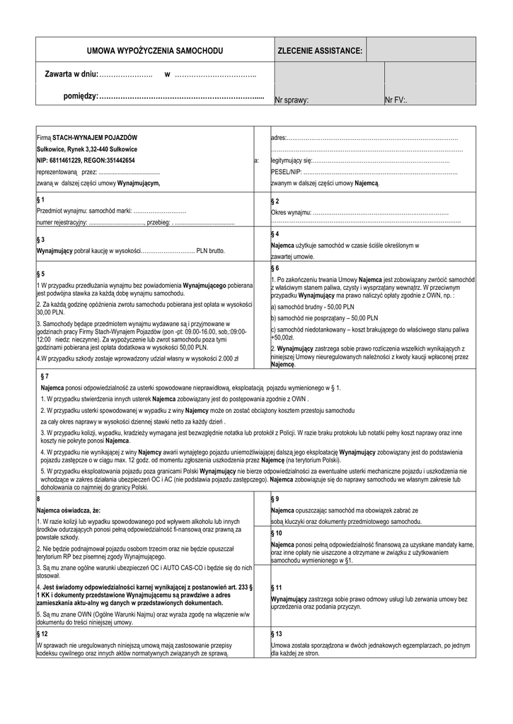 UMOWA WYPOŻYCZENIA SAMOCHODU ZLECENIE ASSISTANCE