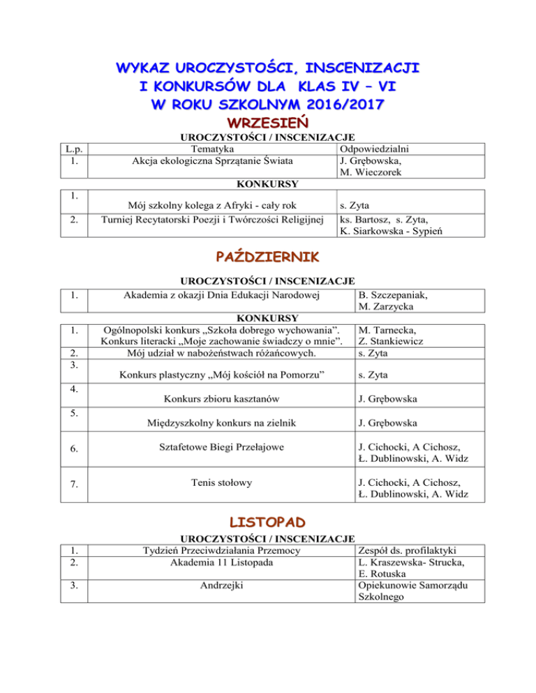 L.p. 1. 1. 2. WYKAZ UROCZYSTOŚCI, INSCENIZACJI I KONKURSÓW DLA KLAS IV – VI W ROKU SZKOLNYM 2016/2017 WRZESIEŃ UROCZYSTOŚCI / INSCENIZACJE Tematyka Odpowiedzialni Akcja ekologiczna Sprzątanie Świata J. Grębowska, M. Wieczorek KONKURSY Mój szkolny kolega z Afryki - cały rok Turniej Recytatorski Poezji i Twórczości Religijnej PAŹDZIERNIK 1. 1. 2. 3. 4. 5. s. Zyta ks. Bartosz, s. Zyta, K. Siarkowska - Sypień UROCZYSTOŚCI / INSCENIZACJE Akademia z okazji Dnia Edukacji Narodowej B. Szczepaniak, M. Zarzycka KONKURSY Ogólnopolski konkurs „Szkoła dobrego wychowania”. M. Tarnecka, Konkurs literacki „Moje zachowanie świadczy o mnie”. Z. Stankiewicz Mój udział w nabożeństwach różańcowych. s. Zyta Konkurs plastyczny „Mój kościół na Pomorzu” s. Zyta Konkurs zbioru kasztanów J. Grębowska Międzyszkolny konkurs na zielnik J. Grębowska 6. Sztafetowe Biegi Przełajowe J. Cichocki, A Cichosz, Ł. Dublinowski, A. Widz 7. Tenis stołowy J. Cichocki, A Cichosz, Ł. Dublinowski, A. Widz LISTOPAD 1. 2. 3. UROCZYSTOŚCI / INSCENIZACJE Tydzień Przeciwdziałania Przemocy Zespół ds. profilaktyki Akademia 11 Listopada L. Kraszewska- Strucka, E. Rotuska Andrzejki Opiekunowie Samorządu Szkolnego 1. 2. KONKURSY Mini Piłka Ręczna dziewcząt Mini Piłka Ręczna chłopców 3. Międzyszkolny konkurs plastyczny na logo schroniska „S.O.S.” 4. Konkurs wiedzy z j. angielskiego 1. 2. 3. 1. 2. GRUDZIEŃ UROCZYSTOŚCI / INSCENIZACJE Jasełka ks. Bartosz Warsztaty bożonarodzeniowe w Klubie Osiedlowym BSM B. Magdzińska, P. Magdziński Mikołajki KONKURSY Konkurs literacki Mój udział w roratach STYCZEŃ UROCZYSTOŚCI / INSCENIZACJE 1. Bal karnawałowy 1. KONKURSY Mini Siatkówka dziewcząt i chłopców 2. Mini Koszykówka dziewcząt i chłopców LUTY UROCZYSTOŚCI / INSCENIZACJE 1. J. Cichocki, A Cichosz, Ł. Dublinowski, A. Widz J. Cichocki, A Cichosz, Ł. Dublinowski, A. Widz D. Dragon, K. Siarkowska - Sypień E.Rotuska, J. Śliwa, M. Jaworska - Kranich Poczta walentynkowa Opiekunowie Samorządu Szkolnego K. Mikulska-Kołodziej, B. Szczepaniak s. Zyta Opiekunowie Samorządu Szkolnego J. Cichocki, A Cichosz, Ł. Dublinowski, A. Widz J. Cichocki, A Cichosz, Ł. Dublinowski, A. Widz Opiekunowie Samorządu Szkolnego MARZEC 1. UROCZYSTOŚCI / INSCENIZACJE Tydzień matematyki U. Piwowarczyk, A. Zacharek KONKURSY 1. Mój udział w Drodze Krzyżowej 2. Sudoku – w pogoni za logicznym myśleniem 3. Maks matematyczny 4. 5. Mały konkurs recytatorski Konkurs piosenki angielskiej KWIECIEŃ 1. 2. 3. s.Zyta A. Zacharek A. Zacharek K. Siarkowska-Sypień, B. Szczepaniak E. Rotuska, M. Jaworska - Kranich UROCZYSTOŚCI / INSCENIZACJE Inscenizacja „Dzień Ziemi” Jolanta Grębowska Przedświąteczne warsztaty wielkanocne w Klubie Osiedlowym BSM Bal wiosenny B. Magdzińska, P. Magdziński Opiekunowie Samorządu Uczniowskiego KONKURSY B. Szczepaniak, B. Magdzińska 1. Szkolny Konkurs wiedzy o Białogardzie 2. Powiatowy konkurs Bezpieczeństwo Ruchu Drogowego 3. Turniej recytatorski „Ptaki, ptaszki i ptaszęta polne” 4. Drużynowe Biegi Przełajowe J. Cichocki, A Cichosz, Ł. Dublinowski, A. Widz 5. Mini Piłka Nożna dziewcząt i chłopców 6. Konkurs wiedzy o krajach anglojęzycznych J. Cichocki, A Cichosz, Ł. Dublinowski, A. Widz E.Rotuska, J. Śliwa, M. Jaworska - Kranich MAJ 1. 1. 2. 3. 4. 5. UROCZYSTOŚCI / INSCENIZACJE Akademia z okazji 3 Maja KONKURSY Konkurs marynistyczny Mój udział w nabożeństwach majowych Szkolny konkurs Mitologiczny Czwórbój L.A. Konkurs zbioru nakrętek CZERWIEC 1. 2. 1. 2. P. Magdziński K. Siarkowska-Sypień, B. Szczepaniak U. Piwowarczyk M. Wieczorek s. Zyta B. Szczepaniak, B. Magdzińska J. Cichocki, A Cichosz, Ł. Dublinowski, A. Widz M. Jaworska - Kranich UROCZYSTOŚCI / INSCENIZACJE Międzynarodowy Dzień Ochrony Środowiska M. Wieczorek Wystawa prac plastycznych w Galerii Osiedlowej BSM B. Magdzińska, P. Magdziński KONKURSY Konkurs ortograficzny K. Mikulska-Kołodziej, B. Krzemień, B. Szczepaniak Sport i zabawa J. Cichocki, A Cichosz, Ł. Dublinowski, A. Widz