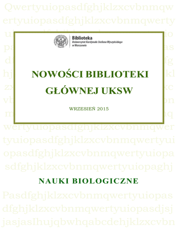Qwertyuiopasdfghjklzxcvbnmqw NOWOŚCI BIBLIOTEKI GŁÓWNEJ UKSW ertyuiopasdfghjklzxcvbnmqwerty uiopasdfghjklzxcvbnmqwertyuio pasdfghjklzxcvbnmqwertyuiopas dfghjklzxcvbnmqwertyuiopasdfg hjklzxcvbnmqwertyuiopasdfghjkl NOWOŚCI BIBLIOTEKI zxcvbnmqwertyuiopasdfghjklzxc GŁÓWNEJ UKSW vbnmqwertyuiopasdfghjklzxcvbn WRZESIEŃ 2015 mqwertyuiopasdfghjklzxcvbnmq wertyuiopasdfghjklzxcvbnmqwer tyuiopasdfghjklzxcvbnmqwertyui opasdfghjklzxcvbnmqwertyuiopa sdfghjklzxcvbnmqwertyuiopaghj NAUKI BIOLOGICZNE Pasdfghjklzxcvbnmqwertyuiopas dfghjklzxcvbnmqwertyuiopasdjsj jasjasIhujqbwhqabcdehjklzxcvbn NAUKI BIOLOGICZNE 1 wrzesień 2015 Bioetyka : anatomia sporu / Barbara Chyrowicz. – Kraków : Wydawnictwo Znak, 2015. – 409, [1] s. ; 22 cm. ISBN 978-83-240-3281-5 Sygn.: 339465 2 Doliny rzeczne : przyroda-krajobraz-człowiek = River valleys : naturelandscape-human / red. Urszula Myga-Piątek ; Komisja Krajobrazu Kulturowego Polskiego Towarzystwa Geograficznego. – Sosnowiec : Komisja Krajobrazu Kulturowego Polskiego Towarzystwa Geograficznego, 2007. – 458 s. il. kolor. ; 25 cm. – (Prace Komisji Krajobrazu Kulturowego PTG ISSN 18961460 nr 7 ) ISBN 978-83-87431-86-0 Sygn.: 339309 3 Elementy enzymologii i biochemii białek : skrypt dla studentów biologii i biotechnologii / Danuta Wojcieszyńska, Urszula Guzik. – Katowice : Wydawnictwo Uniwersytetu Śląskiego, 2015. – 74, [2] s. : il. ; 24 cm. – (Podręczniki i Skrypty Uniwersytetu Śląskiego w Katowicach, ISSN 1644-0552 ; nr 166). ISBN 978-83-8012-445-5 (wersja drukowana) – ISBN 978-83-8012-446-2 (wersja elektroniczna) Sygn.: 339340 4 Energooszczędne i aktywne systemy budynkowe : techniczne i eksploatacyjne aspekty implementacji miejscowych źródeł energii elektrycznej / Grzegorz Benysek, Marcin Jarnut. – Zielona Góra : Oficyna Wydawnicza Uniwersytetu Zielonogórskiego, 2013. – 202 s. : il. (w tym kolor.) ; 24 cm. ISBN 978-83-7842-103-0 Sygn.: 339216 5 Filozofia a nauki przyrodnicze : analiza koncepcji Stanisława Kamińskiego i Kazimierza Kłósaka / Dominika Dzwonkowska. – Warszawa : Wydawnictwo Uniwersytetu Kardynała Stefana Wyszyńskiego, 2014. – 356 s. ; 21 cm. ISBN 978-83-64181-71-9 Sygn.: 339021, 339022, 302882 NOWE POZYCJE W KATALOGU NAUKI BIOLOGICZNE 6 wrzesień 2015 Nowe środki ulepszania gleby do redukcji zanieczyszczeń i rewitalizacji ekosystemu glebowego : materiały szkoleniowe / [zespół aut. Irena Babik et al.]. – Skierniewice : Instytut Ogrodnictwa, 2013. – 82 s. : il. (w tym kolor.) ; 24 cm. ISBN 978-83-60573-63-1 Sygn.: 339313 7 Ocena ekspresji mRNA dla kolagenów typu I, III i IV oraz metaloproteinaz MMP-2 i MMP-9 w guzkowym raku podstawnokomórkowym i odmianie naciekającej / Anna Goździalska. – Kraków : Krakowskie Towarzystwo Edukacyjne - Oficyna Wydawnicza AFM : na zlec. Krakowskiej Akademii im. Andrzeja Frycza Modrzewskiego, 2014. – 163 s. : il. ; 24 cm ISBN 978-83-7571-324-4 Sygn.: 339224 8 Ocena składu ciała, wydolności oraz stylu życia młodzieży uniwersyteckiej wybierającej różny charakter aktywności sportoworekreacyjnej / Miłosz Szczudło, Wojciech Czarny. – Rzeszów : Wydawnictwo Uniwersytetu Rzeszowskiego, 2015. – 108, [1] s. : il. ; 24 cm. Bibliogr. s. 91-[99]. – Streszcz. ang. ISBN 978-83-7996-082-8 Sygn.: 339332 9 Osioł : Janiszowski przewodnik hodowlany / Jarosław Sekuła. – Łomża : Spes Wydawnictwo Centrum Edukacji Medialnej SpesMediaGroup, 2015. – 287, [2] s. : il. kolor. ; 21 cm. ISBN 978-83-938926-9-3 Sygn.: 339469 10 Pielęgniarstwo na rzecz milenijnych celów rozwoju. Cz. 2 / red. Zofia Foryś, Grażyna Anna Franek, Jerzy Jaśkiewicz ; Wydział Zdrowia i Nauk Medycznych - Krakowska Akademia im. Andrzeja Frycza Modrzewskiego. – Kraków : Krakowskie Towarzystwo Edukacyjne - Oficyna Wydawnicza AFM : na zlec.: Krakowska Akademia im. Andrzeja Frycza Modrzewskiego, 2014. – 199 s. : il. ; 24 cm. ISBN 978-83-7571-348-0 Sygn.: 339261 NOWE POZYCJE W KATALOGU NAUKI BIOLOGICZNE wrzesień 2015 11 Sozologia systemowa. T. 7, Hydrotermosfera : człowiek i jego środowisko w aspekcie przyrodniczym, filozoficznym i teologicznym / pod red. Wiesława Dyka. – Szczecin : Wydawnictwo Naukowe Uniwersytetu Szczecińskiego, 2014. – 200 s. : il. ; 24 cm. – (Rozprawy i Studia / Uniwersytet Szczeciński, ISSN 0860-2751 ; t. (967) 893) ISBN 978-83-7241-966-8 Sygn.: 339268 12 Studia nad łysenkizmem w polskiej biologii / pod red. Piotra Köhlera ; Instytut Pamięci Narodowej - Komisja Ścigania Zbrodni przeciwko Narodowi Polskiemu. – Kraków : Wydawnictwo „Dante", 2013. – 173, [3] s. : il. ; 24 cm. ISBN 978-83-89500-80-9 Sygn.: 338967 13 Uwarunkowania ekonomiczno-organizacyjne ochrony środowiska w spółdzielniach mleczarskich na tle zmieniającej się skali produkcji i asortymentu wyrobów gotowych / red. nauk. Sławomir Juszczyk. – Piotrków Trybunalski : Naukowe Wydawnictwo Piotrkowskie przy Filii Uniwersytetu Jana Kochanowskiego, 2014. – 273 s. : il. kolor. ; 25 cm ISBN 978-83-7726-079-1 Sygn.: 339281 14 Walory geoturystyczne Ziemi Kłodzkiej : przewodnik / Wrocław : Wydawnictwo Silesia, 2015. – 79 s. : il. ; 24 cm. Aneta Marek. – ISBN 978-83-924629-5-8 Sygn.: 339278 15 Współczesne kierunki w medycynie prewencyjnej / pod red. Anny Goździalskiej i Jerzego Jaśkiewicza ; Wydział Zdrowia i Nauk Medycznych Krakowska Akademia im. Andrzeja Frycza Modrzewskiego. – Kraków : Krakowskie Towarzystwo Edukacyjne - Oficyna Wydawnicza AFM : na zlec. Krakowskiej Akademii im. Andrzeja Frycza Modrzewskiego, 2013. – 163 s. : il. ; 24 cm. ISBN 978-83-7571-290-2 Sygn.: 339264 16 Wybrane prawne i medyczne problemy ginekologii dziecięcej / redakcja [naukowa]: Ewa M. Guzik-Makaruk, Violetta Skrzypulec-Plinta, Jacek Szamatowicz. – Białystok : Temida 2 : przy współpr. Wydziału Prawa Uniwersytetu w Białymstoku, 2015. – 280 s. : il. ; 21 cm. NOWE POZYCJE W KATALOGU NAUKI BIOLOGICZNE wrzesień 2015 ISBN 978-83-62813-69-8 Sygn.: 339266 17 Wybrane problemy ratownictwa 