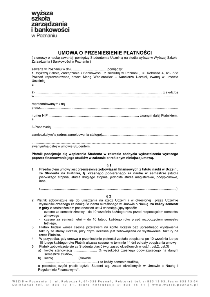 UMOWA O PRZENIESIENIE PŁATNOŚCI ( z umowy o naukę zawartej pomiędzy Studentem a Uczelnią na studia wyższe w Wyższej Szkole Zarządzania i Bankowości w Poznaniu ) zawarta w Poznaniu w dniu ..................................... pomiędzy: 1. Wyższą Szkołą Zarządzania i Bankowości z siedzibą w Poznaniu, ul. Robocza 4, 61- 538 Poznań reprezentowaną przez: Marię Wanierowicz – Kanclerza Uczelni, zwaną w umowie Uczelnią, a 2- ........................................................................................................................................ z siedzibą w ............................................................................................................................................................ reprezentowanym / ną przez.................................................................................................................................................... numer NIP ................................................................................................, zwanym dalej Płatnikiem, a 3-Panem/nią ....................................................................................................................................... zamieszkałym/łą (adres zameldowania stałego).................................................................................. .......................................................................................................................................... ................................. zwanym/ną dalej w umowie Studentem. Płatnik podejmuje się wspierania Studenta w zakresie zdobycia wykształcenia wyższego poprzez finansowanie jego studiów w zakresie określonym niniejszą umową. 1. §1 Przedmiotem umowy jest przeniesienie zobowiązań finansowych z tytułu nauki w Uczelni, ze Studenta na Płatnika, tj. czesnego pobieranego za naukę w semestrze (studia pierwszego stopnia, studia drugiego stopnia, jednolite studia magisterskie, podyplomowe, inne, (..................................................................................................................................................) §2 2. Płatnik zobowiązuje się do uiszczania na rzecz Uczelni i w określonej przez Uczelnię wysokości czesnego za naukę Studenta określonego w Umowie o Naukę za każdy semestr z góry z zastrzeżeniem postanowień ust.4 w następujący sposób: - czesne za semestr zimowy - do 10 września każdego roku przed rozpoczęciem semestru zimowego - czesne za semestr letni – do 10 lutego każdego roku przed rozpoczęciem semestru letniego. 3. Płatnik będzie wnosił czesne przelewem na konto Uczelni bez uprzedniego wystawienia faktury ze strony Uczelni, przy czym Uczelnia jest zobowiązana do wystawienia faktury na rzecz Płatnika. 4. W przypadku, gdy umowa o przeniesienie płatności została podpisana po 10 września lub po 10 lutego każdego roku Płatnik uiszcza czesne w terminie 14 dni od daty podpisania umowy. 5. Płatnik zobowiązuje się za Studenta płacić (wg. zasad określonych w ust.1, ust.2, ust.3) a) kwotę stanowiącą ......................... % wysokości czesnego obowiązującego na danym semestrze studiów, b) kwotę............................(słownie............................................................................................. ..............................................................) za każdy semestr studiów, a pozostałą część płacić będzie Student wg. zasad określonych w Umowie o Naukę i Regulaminie Finansowym/*. 1. 2. 3. 4. 5. 1. §3 Brak terminowego wniesienia przez Płatnika czesnego, o którym mowa w § 2, pociąga względem Studenta konsekwencje za nieuiszczenie opłat, o których mowa w Umowie o Naukę i Regulaminie Finansowym, a wobec Płatnika konsekwencje finansowe określone w Umowie o Naukę i te określone w Regulaminie Finansowym, za przekroczenie terminu płatności. Prawem i obowiązkiem Studenta jest informowanie się u Płatnika i w Uczelni o tym, czy czesne wnoszone przez Płatnika jest zaksięgowane na koncie rozliczeniowym Studenta. Bez znaczenia dla uiszczenia należności jest fakt, że Student nie pracuje już w firmie Płatnika, co nie zwalnia Płatnika z obowiązku uiszczenia czesnego do końca semestru, a pozbawia go prawa żądania zwrotu części lub całości czesnego z zastrzeżeniem postanowień ust. 4. W przypadku, gdy Student nie jest już pracownikiem Płatnika może dochodzić zwrotu poniesionych nakładów od Studenta – ten zapis winien być regulowany wyłącznie umową pomiędzy Płatnikiem a Studentem. Strony zgodnie postanawiają, iż w sytuacji opisanej w ust. 1 i 3 powyżej, Uczelnia może domagać się zapłaty zarówno od Płatnika jak i Studenta, których zobowiązanie jest w tym zakresie solidarne. §4 Integralną częścią niniejszej umowy są Umowa o Naukę i Regulamin Finansowy, których kopie Płatnik otrzymał, co potwierdza podpisując niniejszą umowę, przy czym Płatnika obowiązują jedynie postanowienia dotyczące regulowania czesnego. §5 1. Umowa zostaje zawarta na czas nieokreślony z możliwością rozwiązania za jednomiesięcznym okresem wypowiedzenia, z zastrzeżeniem postanowień ust.2 . 2. Umowę niniejszą można rozwiązać tylko ze skutkiem na koniec semestru, przy czym wypowiedzenie powinno być złożone w formie pisemnej najpóźniej na jeden miesiąc przed jego upływem. Jeśli wypowiedzenie zostało złożone po upływie tego terminu umowa zostanie rozwiązana ze skutkiem na koniec następnego semestru. 3. Umowę rozwiązać może każda ze stron w sposób i ze skutkiem określonym w ust.1 i ust.2. 4. Umowa automatycznie wygasa z dniem rozwiązania umowy o naukę pomiędzy Studentem a Uczelnią, przy czym Płatnik jest zobowiązany do zapłaty odpowiedniej części czesnego, naliczonego zgodnie z Umowa o Naukę § 7 ust. 2, 3 i 4. 5. Semestr zimowy rozpoczyna się 1 października i trwa do końca lutego, a semestr letni rozpoczyna się 1 marca i trwa d