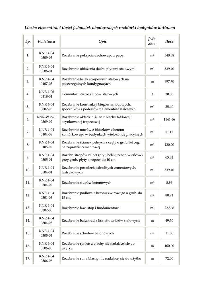 Liczba elementów i ilości jednostek obmiarowych rozbiórki budynków kotłowni Jedn. obm. Ilość Rozebranie pokrycia dachowego z papy m2 5 4 0 ,0 8 K N R 4 -0 4 0 5 0 6 -0 1 Rozebranie obłożenia dachu płytami stalowymi m2 5 3 9 ,4 0 3. K N R 4 -0 4 0 1 0 7 -0 5 Rozebranie belek stropowych stalowych na poszczególnych kondygnacjach m 9 9 7 ,7 0 4. K N R 4 -0 6 0 1 1 8 -0 1 Demontaż i cięcie słupów stalowych t 3 0 ,0 6 5. K N R 4 -0 4 0 8 0 2 -0 3 Rozebranie konstrukcji biegów schodowych, spoczników i podestów z elementów stalowych m2 3 5 ,4 0 6. KNR-W 2-25 0 3 0 9 -0 2 Rozebranie okładzin ścian z blachy fałdowej ocynkowanej trapezowej m2 1 1 4 1 ,6 6 7. K N R 4 -0 4 0 1 0 4 -0 8 Rozebranie murów z bloczków z betonu komórkowego w budynkach wielokondygnacyjnych m3 5 1 ,1 2 8. K N R 4 -0 4 0 1 0 5 -0 2 Rozebranie ścianek pełnych z cegły o grub.1/4 ceg. na zaprawie cementowej m2 4 3 0 ,0 0 9. K N R 4 -0 4 0 3 0 5 -0 1 Rozebr. stropów żelbet.(płyt, belek, żeber, wieńców) przy grub. płyty stropów do 10 cm m3 6 5 ,8 2 10. K N R 4 -0 4 0 5 0 4 -0 1 Rozebranie posadzek jednolitych cementowych, lastrykowych m2 5 3 9 ,4 0 11. K N R 4 -0 4 0 3 0 4 -0 2 Rozebranie słupów betonowych m3 8 ,9 6 12. K N R 4 -0 4 0 3 0 1 -0 3 Rozebranie podłoża z betonu żwirowego o grub. do 15 c m m3 8 0 ,9 1 13. K N R 4 -0 4 0 3 0 2 -0 5 Rozebranie ław, stóp i fundamentów m3 2 2 ,5 6 8 14. K N R 4 -0 4 0 8 0 4 -0 3 Rozebranie balustrad z kształtowników stalowych m 4 9 ,3 0 15. K N R 4 -0 4 0 3 0 5 -0 3 Rozebranie schodów betonowych m3 1 1 ,8 0 16. K N R 4 -0 4 0 5 0 6 -0 5 Rozebranie rynien z blachy nie nadającej się do użytku m 1 0 0 ,0 0 17. K N R 4 -0 4 0 5 0 6 -0 6 Rozebranie rur z blachy nie nadającej się do użytku m 7 2 ,0 0 Lp. Podstawa 1. K N R 4 -0 4 0 5 0 9 -0 3 2. Opis Liczba elementów i ilości jednostek obmiarowych rozbiórki komina Jedn. obm. Ilość Demontaż konstrukcji stalowych i blach komina t 3 2 ,6 0 K N R 4 -0 6 0 1 1 8 -0 3 Demontaż konstrukcji stalowych i blach urządzeń nawęglających i odpylających t 9 ,8 4 3. K N R 4 -0 4 0 8 1 5 -0 3 Rozebranie wiązarów dachowych stalowych z rur Transport pociętych elementów konstrukcji stalowejopuszczenie z poziomu kondygnacji kg 32601 4. K N R 4 -0 4 0 3 0 2 -0 3 Rozebranie stóp i fundamentów pod komin m3 3 2 ,2 5 6 Lp. Podstawa 1. K N R 4 -0 6 0 1 1 8 -0 2 2. Opis Liczba elementów i ilości jednostek obmiarowych rozbiórki wiat magazynowych Jedn. obm. Ilość Rozebranie pokrycia dachowego z płyt azbestowo cementowych falistych nie nadających się do użytku m2 5 8 7 ,6 0 K N R 4 -0 4 0 5 0 8 -0 6 Rozebranie pokrycia dachowego z płyt azbestowocementowych – gąsiory nie nadające się do użytku m 4 5 ,2 0 3. K N R 4 -0 4 0 8 0 4 -0 1 Rozebranie wiązarów dachowych stalowych z rur m 1 5 2 ,4 0 4. K N R 4 -0 6 0 1 1 8 -0 2 Rozbiórka słupów z ceowników z pocięciem palnikiem t 1 ,7 2 1 szt. 96 t 3 ,6 0 1 Lp. Podstawa 1. K N R 4 -0 4 0 5 0 8 -0 5 2. 5. K N R 4 -0 6 0 1 1 5 -0 1 Opis Zdejmowanie śrub konstrukcyjnych łączących słupy ze stopami żelbetowymi 6. K N R 4 -0 6 0 1 1 8 -0 2 Demontaż i cięcie konstrukcji płatwi stalowych z ceowników 7. K N R 4 -0 4 0 3 0 2 -0 2 Rozebranie stóp betonowych pod słupy m3 1 4 ,4 0 8. K N R 4 -0 4 0 8 0 2 -0 1 Rozebranie konstrukcji biegów schodowych, spoczników i podestów z elementów stalowych m2 3 8 ,4 8 9. KNR4-04 0 8 0 4 -0 1 Rozebranie balustrad z kształtowników stalowych m 6 2 ,4 0 Liczba elementów i ilości jednostek obmiarowych rozbiórki elementów posesji Lp. Podstawa 1. K N R 2 -3 7 0 6 0 2 -0 1 2. KNR-W 4-03 0 8 0 6 -0 3 + K N R 5 -1 0 0 7 0 9 -0 2 Jedn obm. Ilość Rozbiórka torów kolejowych na podkładach betonowych km 0 ,2 9 Demontaż słupów żelbetowych pojedynczych oświetleniowych szt. 19 Opis * nie uwzględniono rozbiórki ogrodzenia betonowego, nie obejmuje tego zamówienie. Liczba elementów i ilości i uporządkowania terenu. jednostek obmiarowych kosztów utylizacji Jedn. obm. Ilość Załadowanie gruzu koparko-ładowarką przy obsłudze na zmianę roboczą przez 3 samochody samowyładowcze m3 4 1 7 ,9 7 Wywiezienie gruzu z terenu rozbiórki przy mechanicznym załadowaniu i wyładowaniu samochodem samowyładowczym na odleg. 9 km m3 4 1 7 ,9 7 Kalk. własna Dostarczenie gruzu i śmieci na teren wysypiska komunalnego m3 4 1 7 ,9 7 Kalk. własna Utylizacja płyt azbestowo - cementowych przez specjalną firmę m2 5 8 7 ,6 0 Lp. Podstawa 1. K N R 4 -0 4 1 1 0 3 -0 1 2. K N R 4 -0 4 1 1 0 3 -0 4 + K N R 4 -0 4 1 1 0 3 -0 5 3. 4. Opis